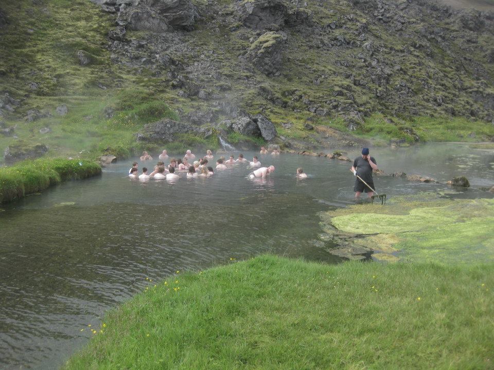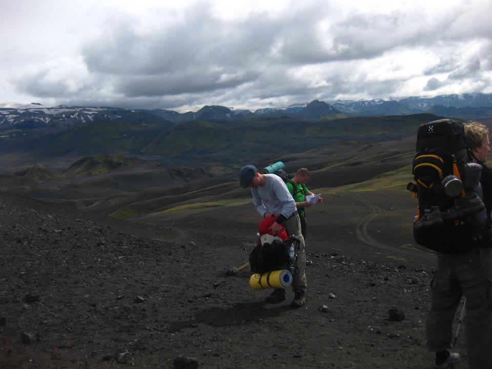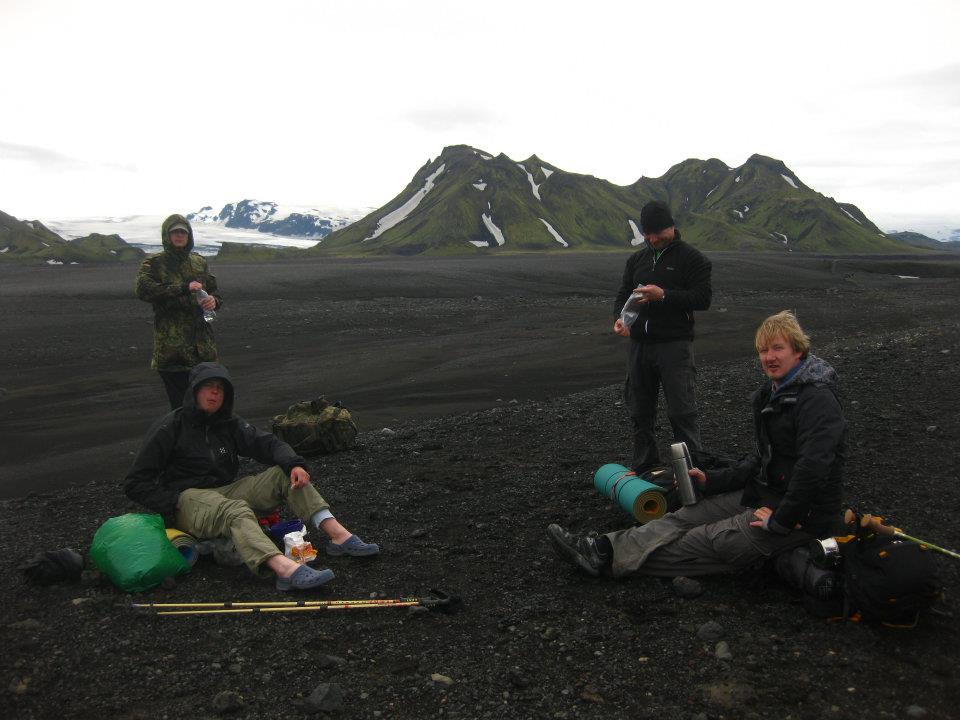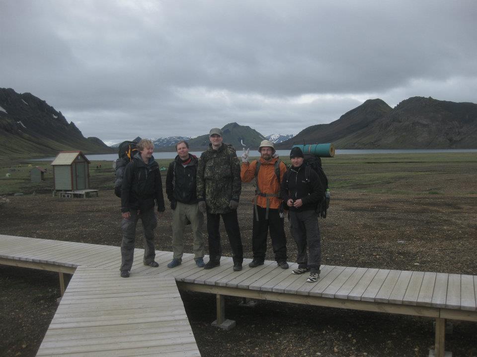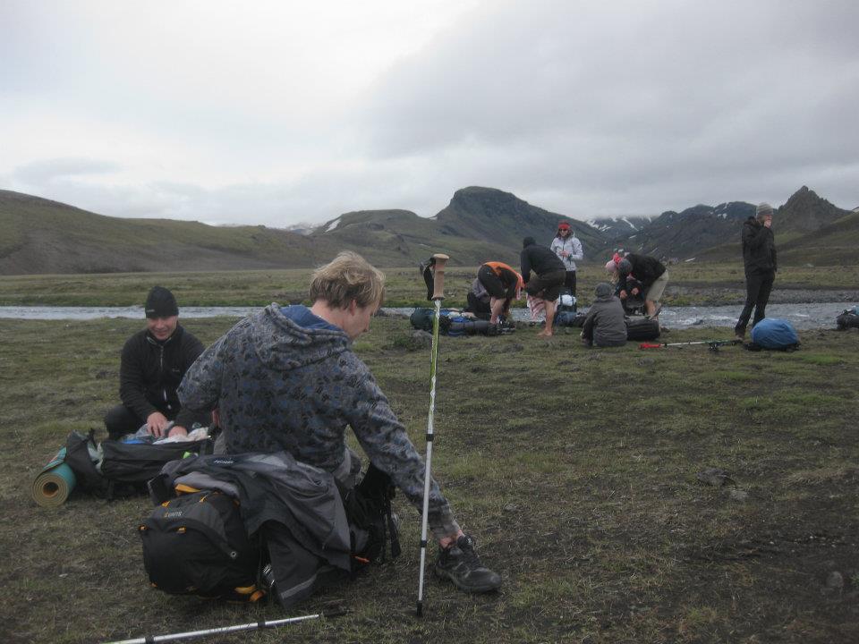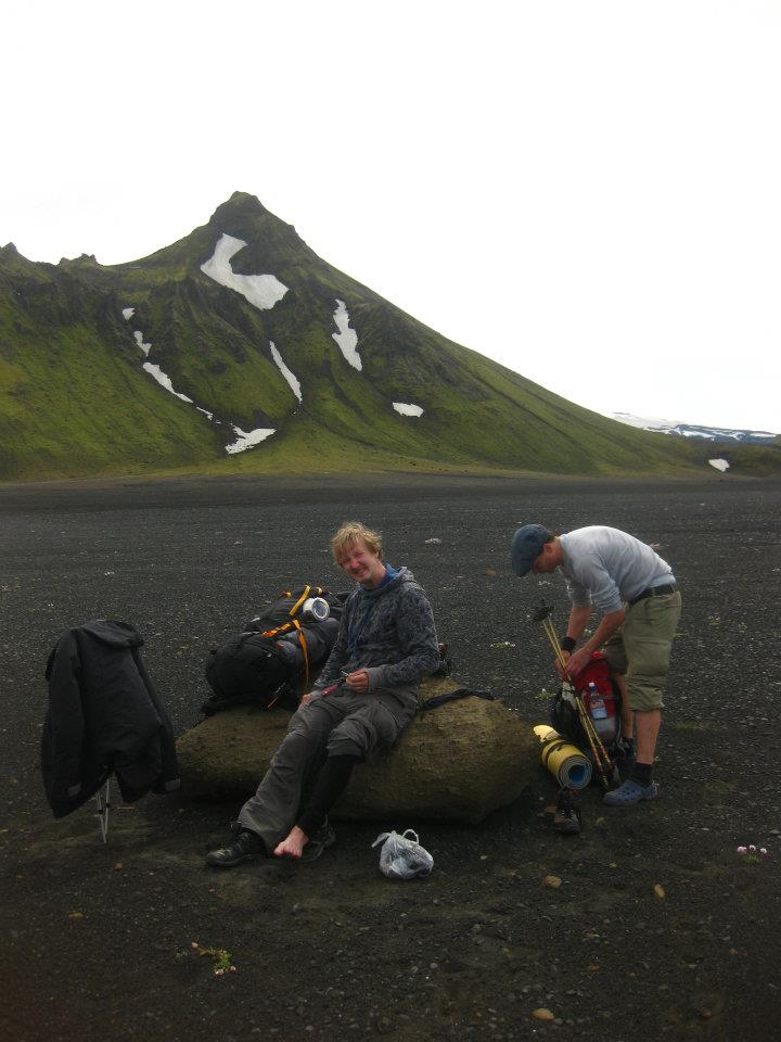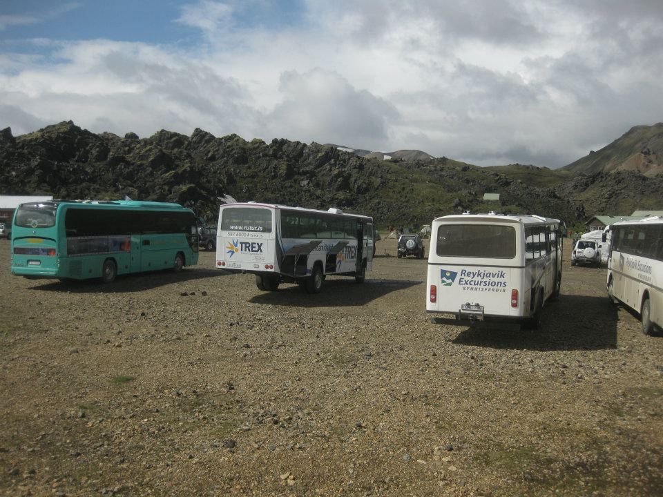 Mistä aloittaisin? No Reykjavikista lähdettiin aamulla bussilla, ja edellisenä iltana oltiin pidetty jonkinlainen saapumisjuhla. Matka Reykjavikista reitin alkupisteeseen Landmannalaugariin näyttää kartalla lyhyeltä, mutta käytännössä vie useita tunteja. Tämä johtuu siitä, että Landmannalaugaria lähestytään pitkin jatkuvasti kehnontuvia teitä. Asfaltti vaihtuu hiekkaan, hiekka vaihtuu laavapölyyn, ja laavapöly vaihtuu jossain ojan ja joen välimaastossa olevien vesiesteiden yli nylkyttämiseen. Erikoisrakenteinen bussi hidasti ojajokia ylittäessä pumppaamaan korin jousilla tarpeeksi ylös, jotta montussa dippaaminen onnistuu. Osalla seurueestamme oli jäänyt partyboy-moodi päälle edellisestä illasta, joten matkalla nautittiin viskiä, monta viskiä. Landmannalaugariin saavuttuamme helikopteri olisi ollut tarpeen, mutta lopulta istuimme kuumassa lähteessä siihen asti että kaikki pysyvät pystyssä rinkka selässä. Siinä meni noin kolme tuntia, pahoitteluni saksalaisille kylpijöille.