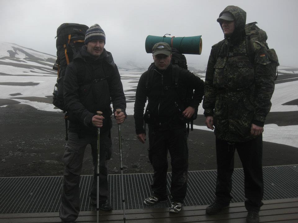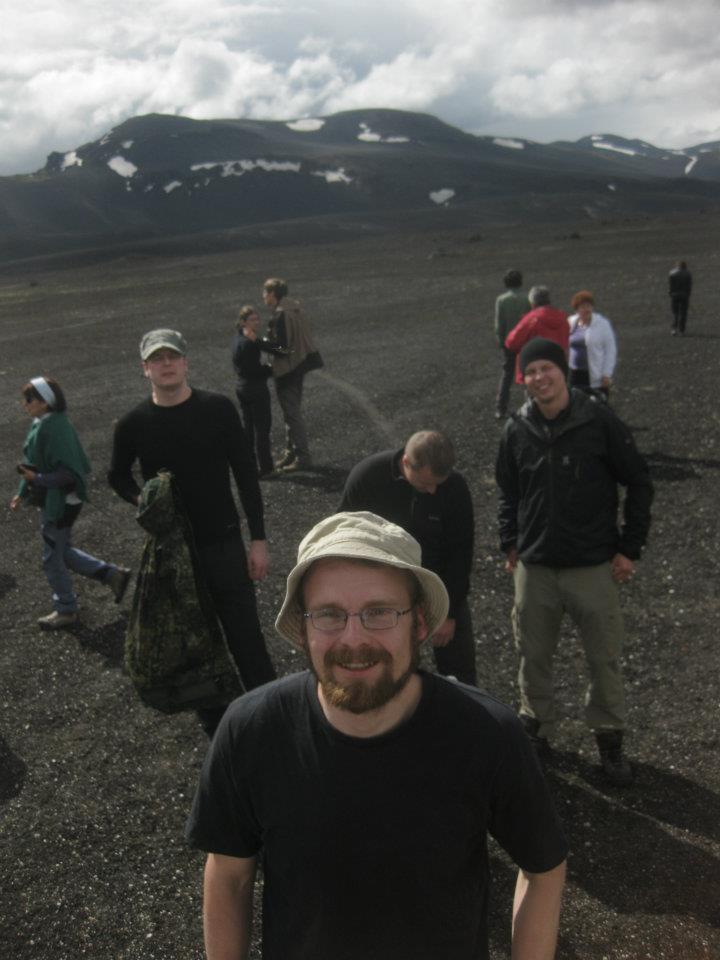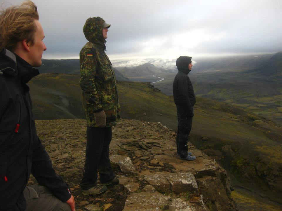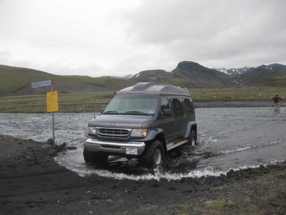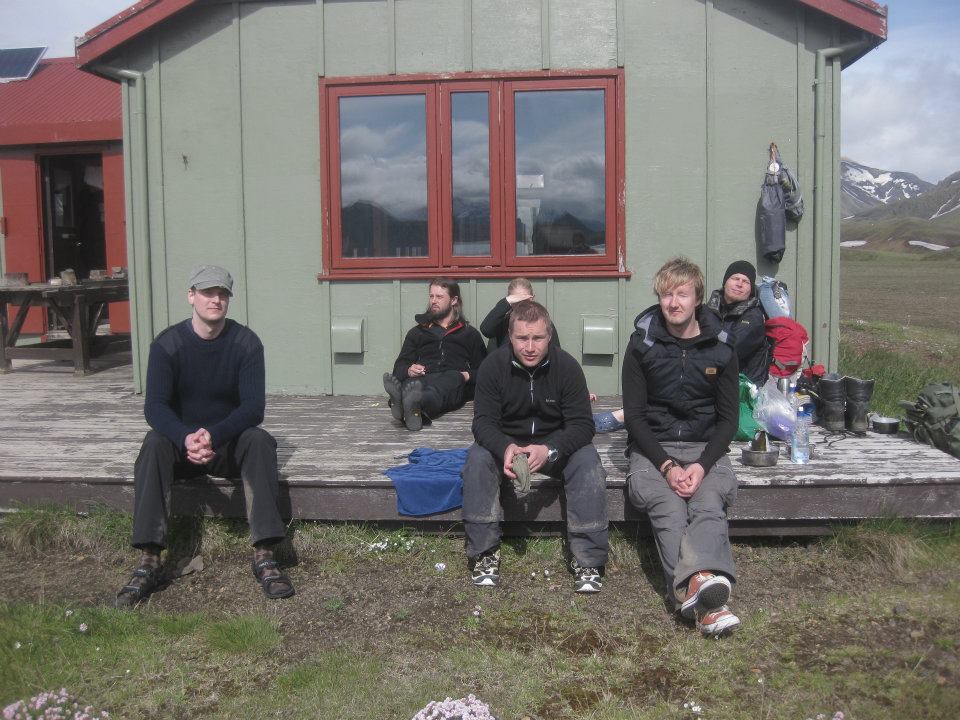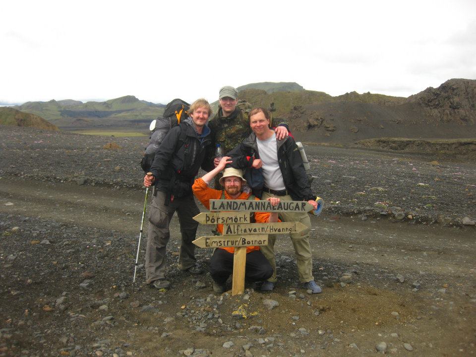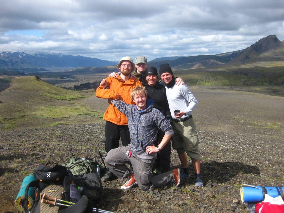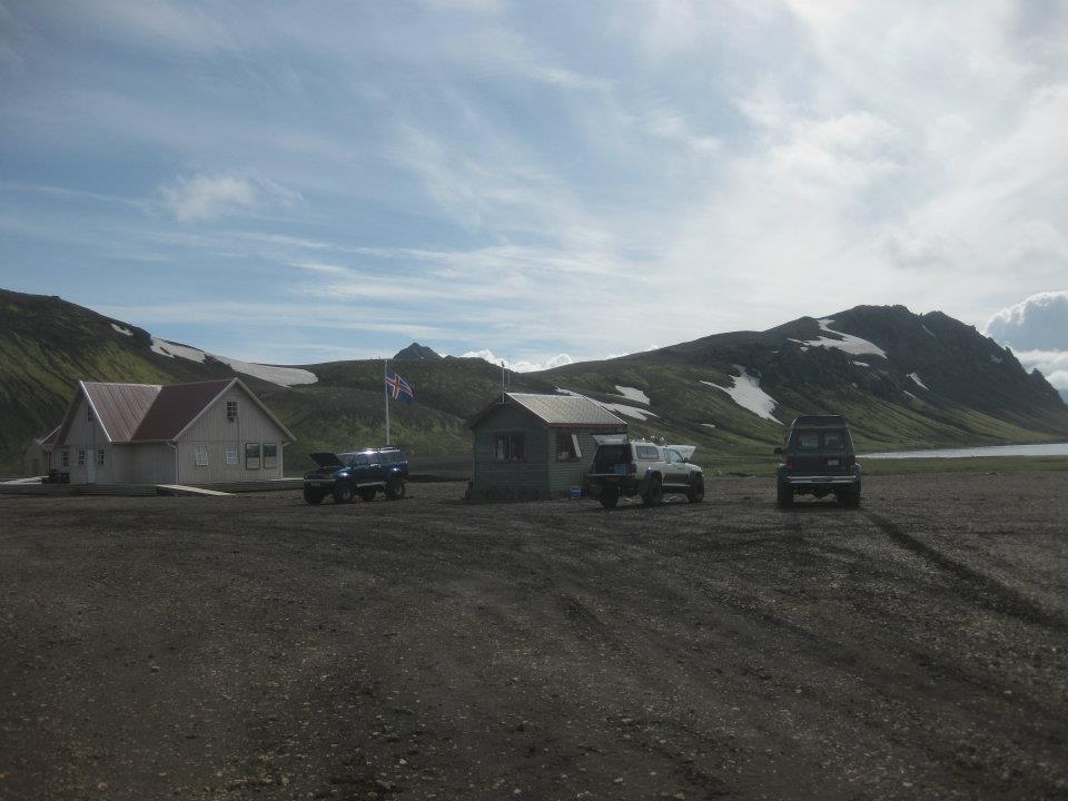Mistä aloittaisin? No Reykjavikista lähdettiin aamulla bussilla, ja edellisenä iltana oltiin pidetty jonkinlainen saapumisjuhla. Matka Reykjavikista reitin alkupisteeseen Landmannalaugariin näyttää kartalla lyhyeltä, mutta käytännössä vie useita tunteja. Tämä johtuu siitä, että Landmannalaugaria lähestytään pitkin jatkuvasti kehnontuvia teitä. Asfaltti vaihtuu hiekkaan, hiekka vaihtuu laavapölyyn, ja laavapöly vaihtuu jossain ojan ja joen välimaastossa olevien vesiesteiden yli nylkyttämiseen. Erikoisrakenteinen bussi hidasti ojajokia ylittäessä pumppaamaan korin jousilla tarpeeksi ylös, jotta montussa dippaaminen onnistuu. Osalla seurueestamme oli jäänyt partyboy-moodi päälle edellisestä illasta, joten matkalla nautittiin viskiä, monta viskiä. Landmannalaugariin saavuttuamme helikopteri olisi ollut tarpeen, mutta lopulta istuimme kuumassa lähteessä siihen asti että kaikki pysyvät pystyssä rinkka selässä. Siinä meni noin kolme tuntia, pahoitteluni saksalaisille kylpijöille.