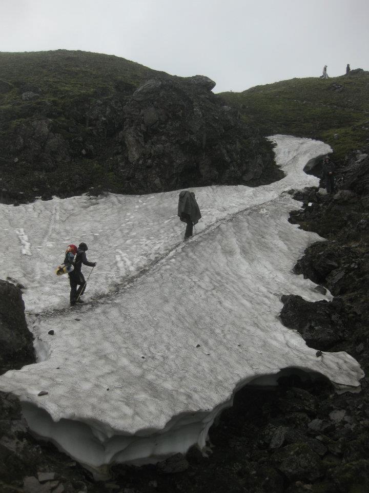 Sää saattaa iskeä jonkin verran haastetta matkaan: ensimmäinen päivä meni useissa kohdissa lumisissa maisemissa (ja sateessa) vaikka oltiin heinäkuussa. 1. päivän jälkeen keli (maasto?) helpotti, mutta missään vaiheessa ei ollut juuri kuuma, vaan pikemminkin lämpimimmillään Suomen syksyyn verrattavaa meininkiä. Kuoripuku, kerrasto ja pipo eikä shortseja (niin Eero) niin kelikään ei ole mikään kummempi pulma. Sen voisi kyllä olettaa varsinkin vähemmän ”helteisinä” kuukausina äityvän pahaksikin, joten ei kannata esim. eksyä tai hajota varsinkaan yksin. Reitti on selkeä ja 95% hyvin merkitty, mutta itse reitilläkään ei ollut hurjaa ruuhkaa ja siltä poiketessa ei todnäk ole heti löydettävissä.