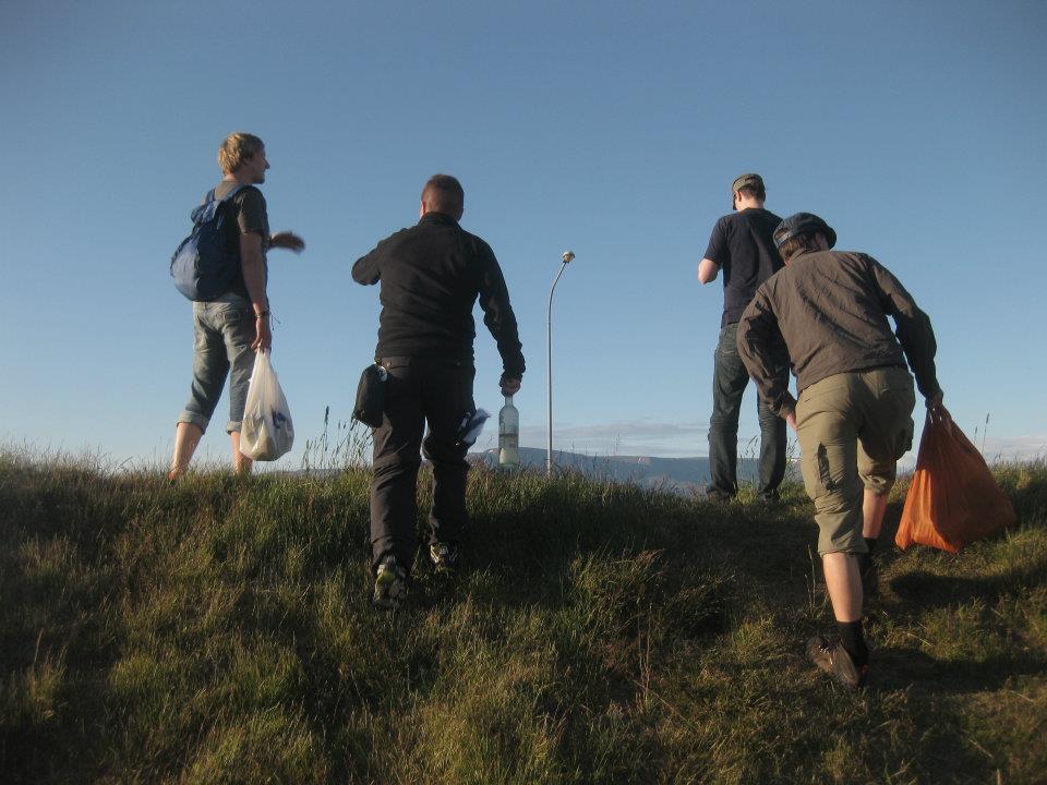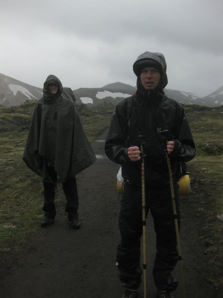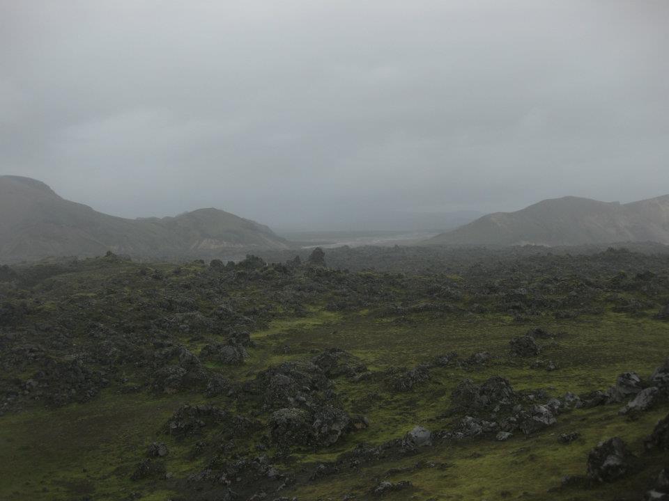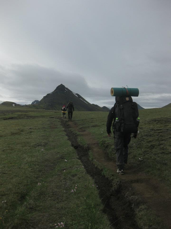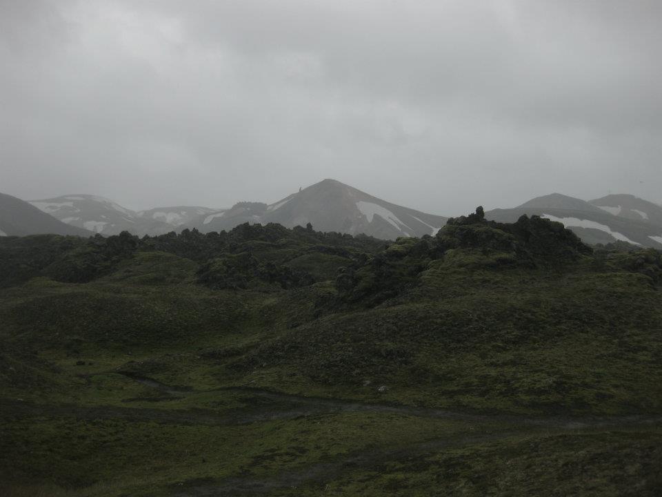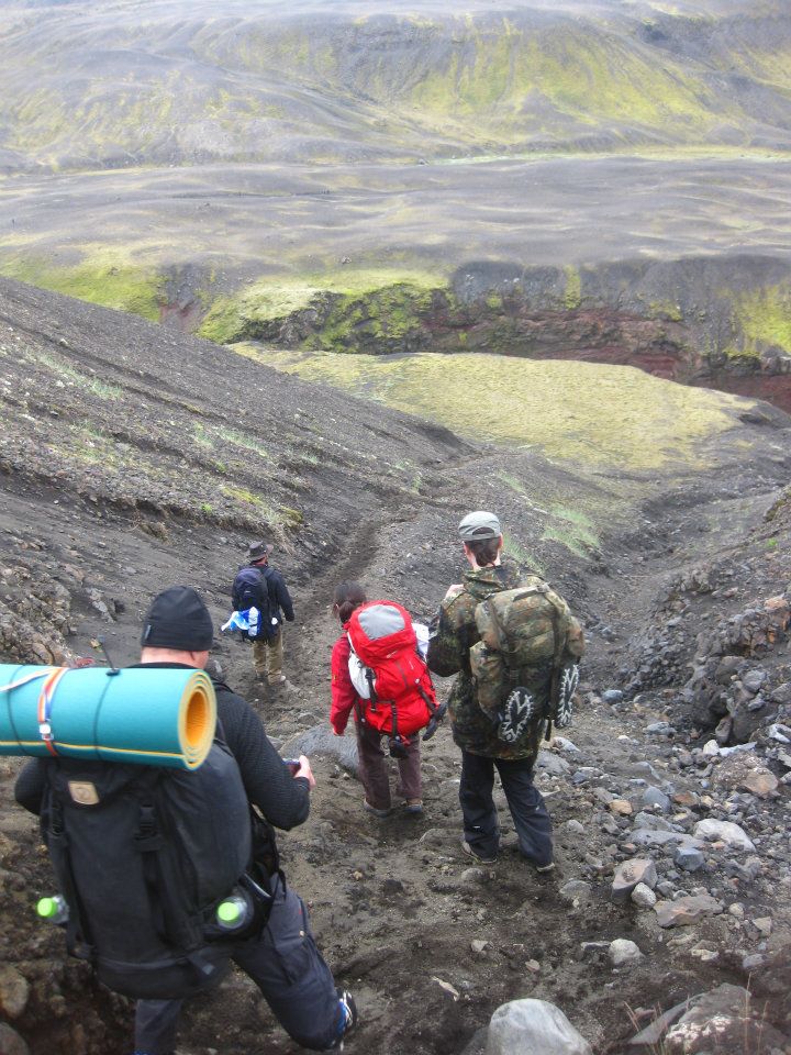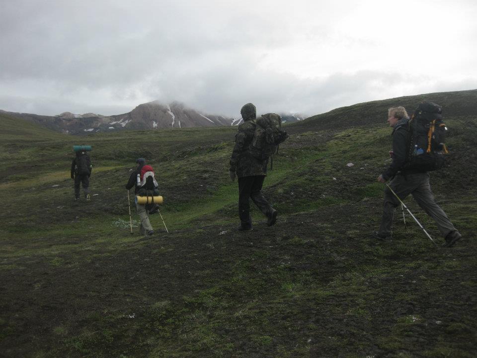 Pian Landmannalaugarista nousun jälkeen päästään keskelle avointa kukkulamaisemaa. Jossain reittikuvauksessa ensimmäisen päivän pätkää Landmannalaugarista Hraftinnuskeriin luonnehditaan sanalla ”up”. Sitä tosiaan piisaa jonkin verran, ja yhdistettynä räkäiseen keliin sekä vielä allasistunnon jälkeenkin setäkokouksesta kärsiviin retkuelaisiin ensimmäisen päivän etappi on matkan raskain. Henkisellä puolella kärsittiin kai eniten, varsinaisen raahustettavan nousun puolesta mäet eivät ole kuitenkaan mitään tuntikausien urakoita. Rämpiminen saattoi silti tulla ikävänä yllätyksenä, koska bussista noustua aivan kaikille ei ollut täysin selvää että tänään oli tosiaan tarkoitus kävellä 15 km. 5 hengen osastomme hajaantui eri vauhtia kulkeviin etäpesäkkeisiin. Joissakin niistä haisi viski.