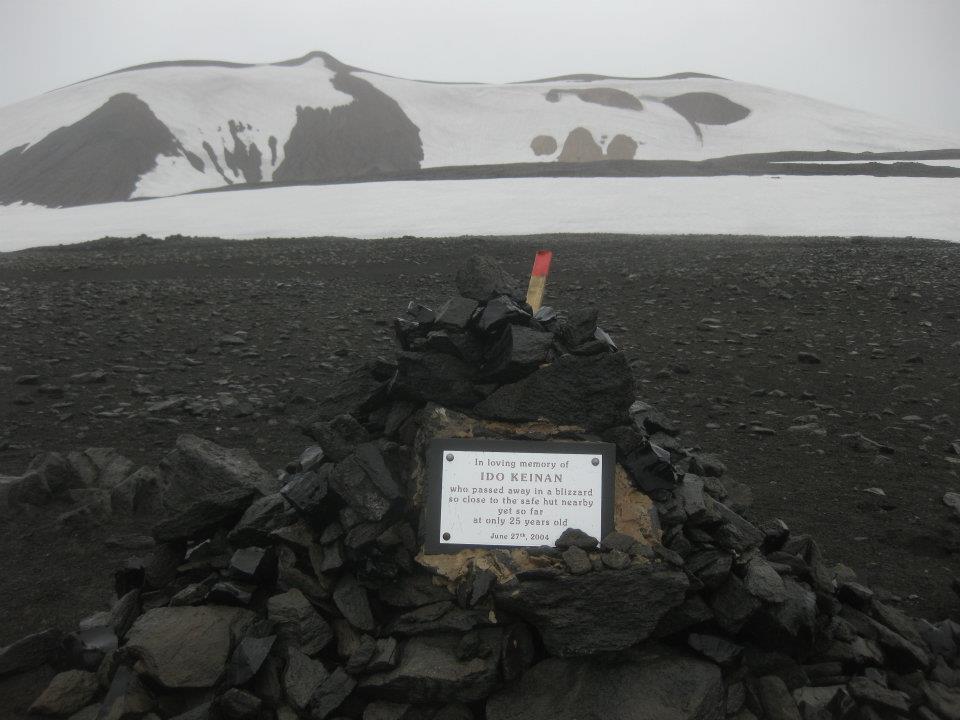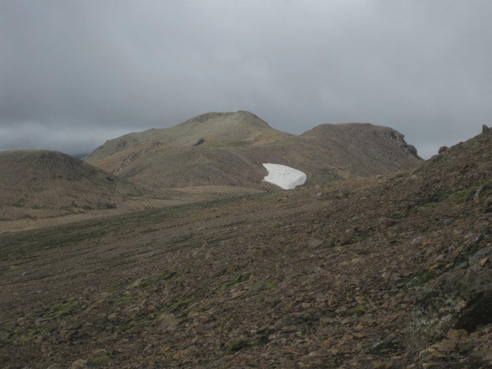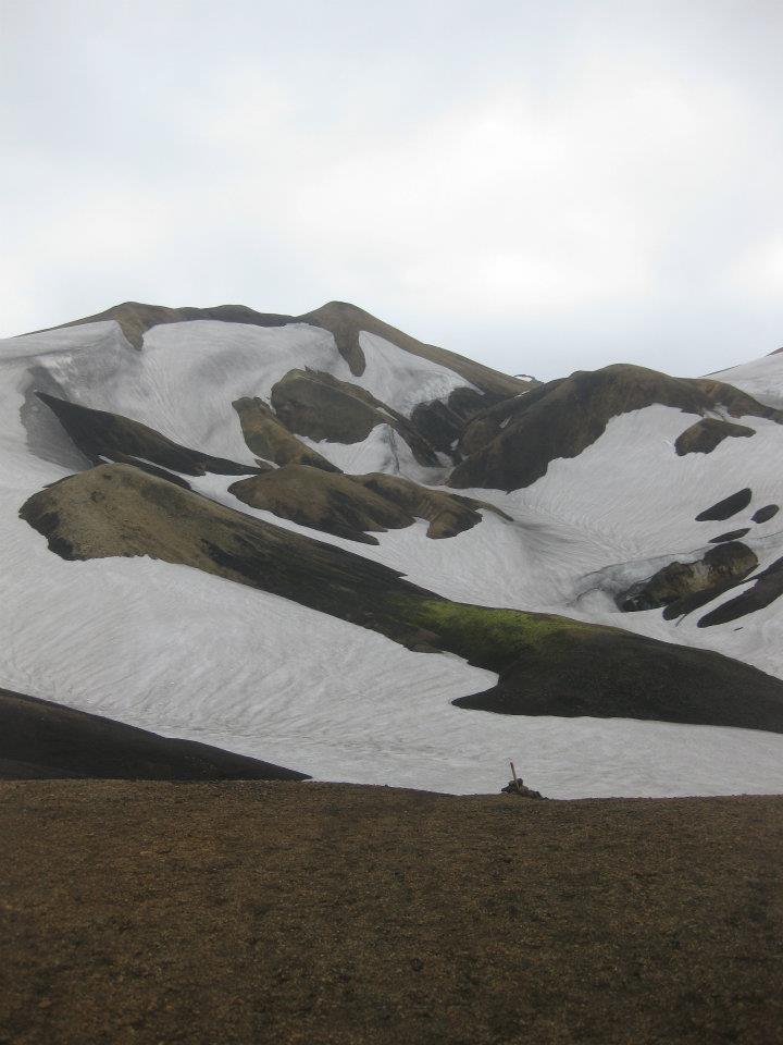 Kun päivä eteni joitakin tunteja ja useita kyyneliä, verrattain vehreästä kukkulasta (mordorii) könyttiin vielä vähän ylemmäs ja päästiin lumiseen ylämaahan. Maasto on kautta linjan piikivimäistä ja häröä, mutta loppupäässä kasat olivat isompia, nurmikkoa ei paljon näkynyt ja lunta oli reilusti. Oltiin siis kai vuoristossa? Ensimmäisen päivän etappi Hraftinnusker ilmestyi vähän puskan takaa jälleen yhden nousun jälkeen. Saavuin paikalle itsekseni, muu seurue joko edellä tai takamaastossa etsimässä yksisarvisen aarretta.