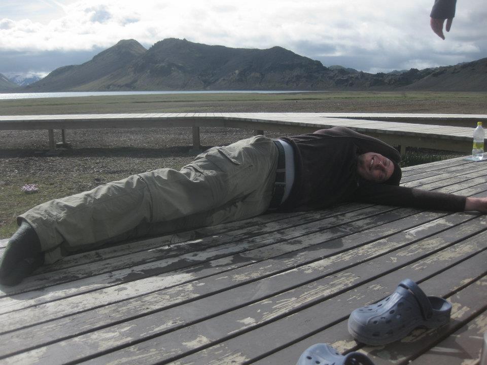 Alftavatnin leiripaikka on mainio nurmikenttä järven rannalla, aivan eri maailmasta kuin edellisen yön vuorimörkölä. Pari heppua päätyy ottamaan yöpaikan majasta, ja sellainen irtoaakin ihan hyvin ilman varausta. Paikan viihdeosasto koostuu lähinnä terassilla hengailusta, järven katselusta ja auringon imemisestä: edellisen yön jälkeen toimii.