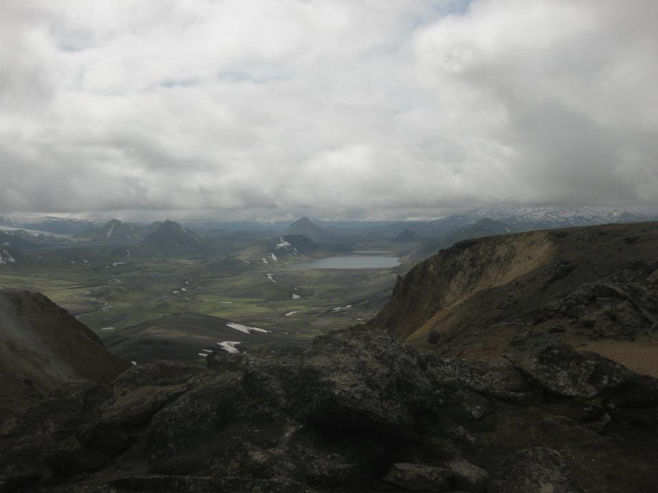 Varsinainen payload on näkymä vuorilta (nyt kutsun niitä vuoriksi) kohti tämän päivän etappia Alftavatnia. A:n päällä on sellainen aksentti, suomeksi se on Joutsenjärvi.