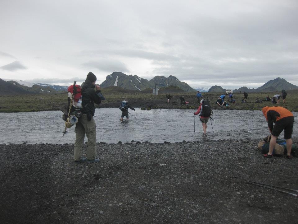 Mäeltä laaksoon katsellessamme näemme hevosia ylittämässä jokea, ja pian päädymme myös itse saman puuhan pariin. Þröngá-joen ylitys on reissun vaativin ja vaatii hetken mallailua, mutta paljon polvia syvemmälle ei kuitenkaan tarvinnut vajota. Ylityksen jälkeen unohdan tohkeissani Fujilta vuonna 2009 ostetut kolmen euron villahanskani rannalla pukiessani, ja tämä vääryys polttelee edelleen.
