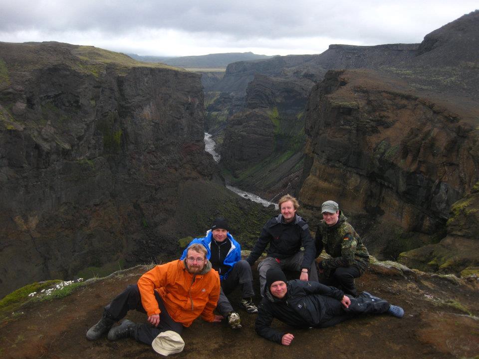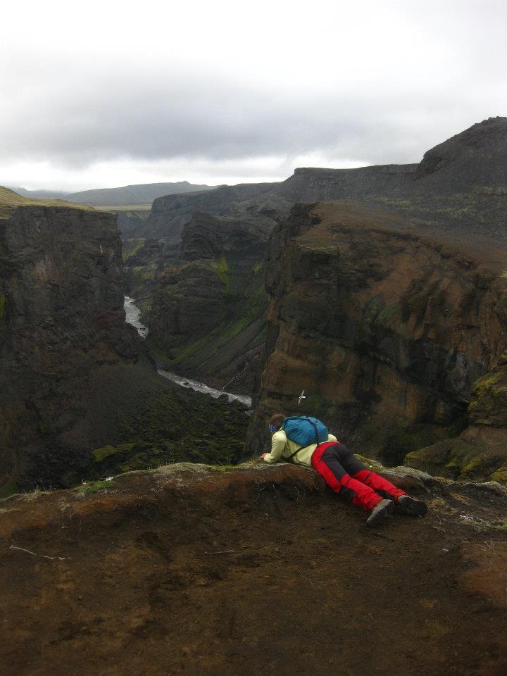 Lauri yrittää rakentaa keittimen, ja osa on niin mehuissaan matkan hyvästä etenemisestä, että jatkamista suoraan loppuunkin ehdotellaan. Onneksi viimeinen etappi päätetään jättää seuraavaan päivään, koska se jättää aikaa tiputtaa rinkat selästä ja piipahtaa noin puolen tunnin kävelymatkan päässä Markarflojtin kanjonilla. Näkymät sen reunoilta ovat vallan hulppeat ja aivan reunallekin pääsee keekoilemaan. Tätä monttua ei kannata missään nimessä skipata täällä ollessa. Illalla päästiin vielä myös vihdoin korkkaamaan Jukan viini!