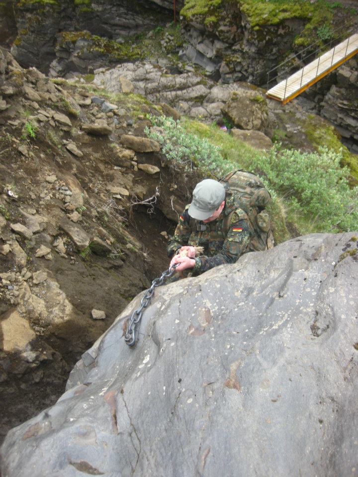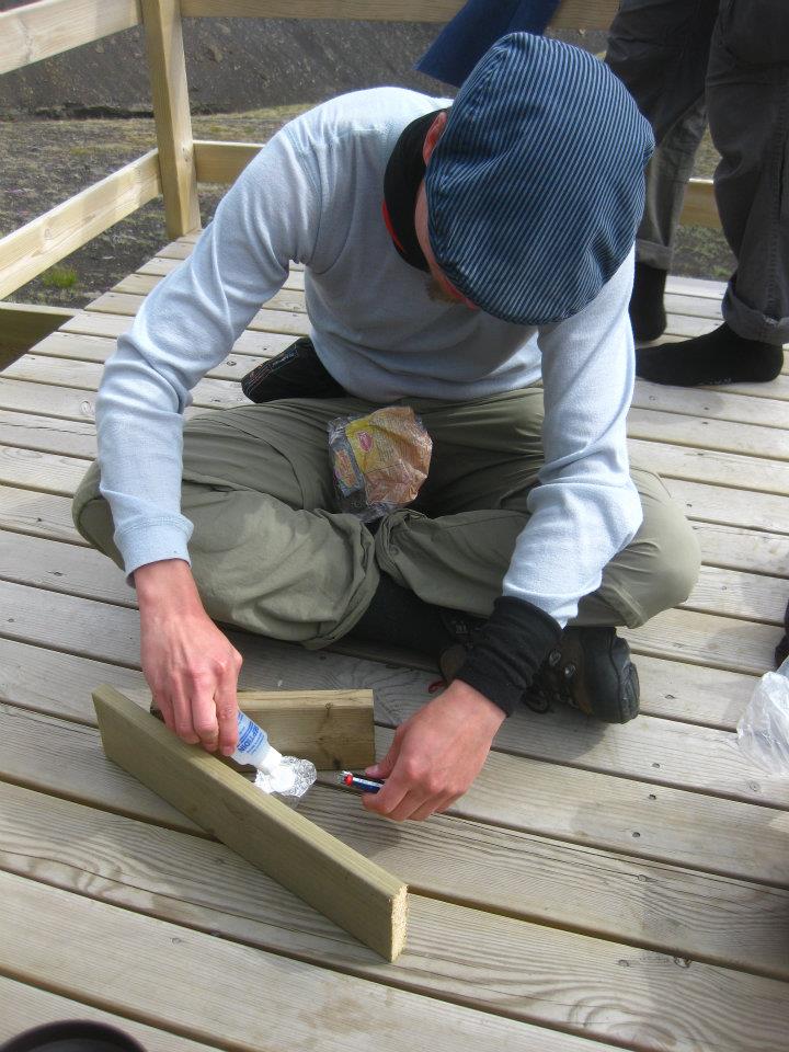 Joen ylityksen jälkeen matkaa on yhä jonkin verran, ja (ilmeisesti väärä) yllättävän iso kilometrilukema opaskyltissä saa meidät panikoimaan bussista jäämistä. Nappaamme Jukan jollain ihmeen tavalla edelleen ainakin 30 kiloa painavan rinkan paarihenkisesti kantoon ja lähdemme ryynäämään tuplavauhtia kohti Thorsmorkia. Se ilmestyykin metsäisessä maastossa huomattavasti nopeammin kuin kyltin väittämä matka olisi antanut uskoa, ja käy ilmi, että myös bussin lähtöön on vielä reilusti aikaa. Ehdittiin ainakin!