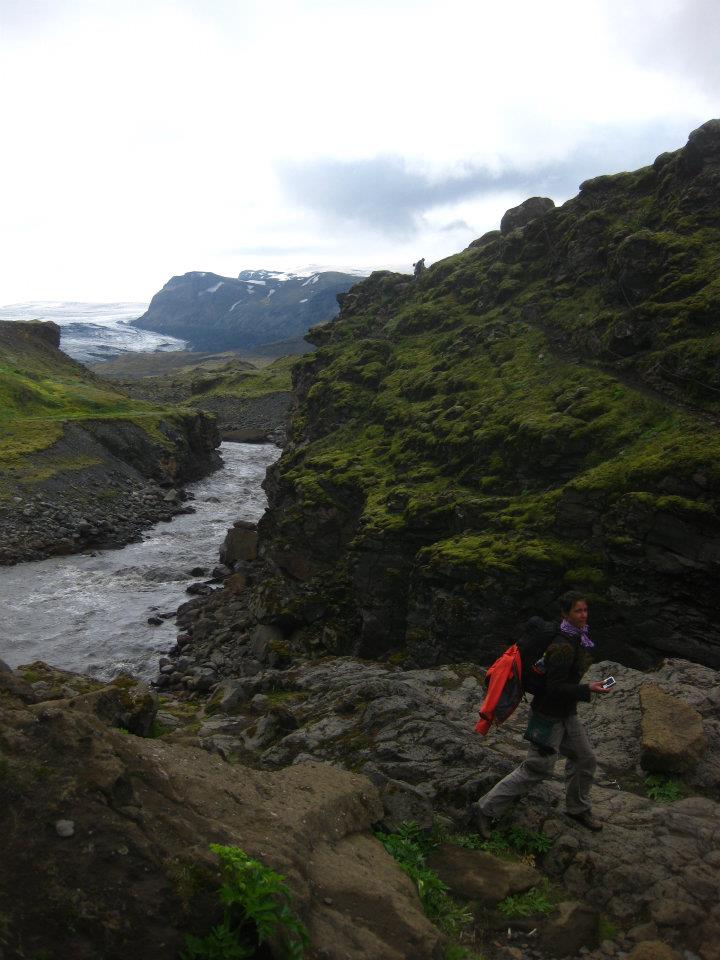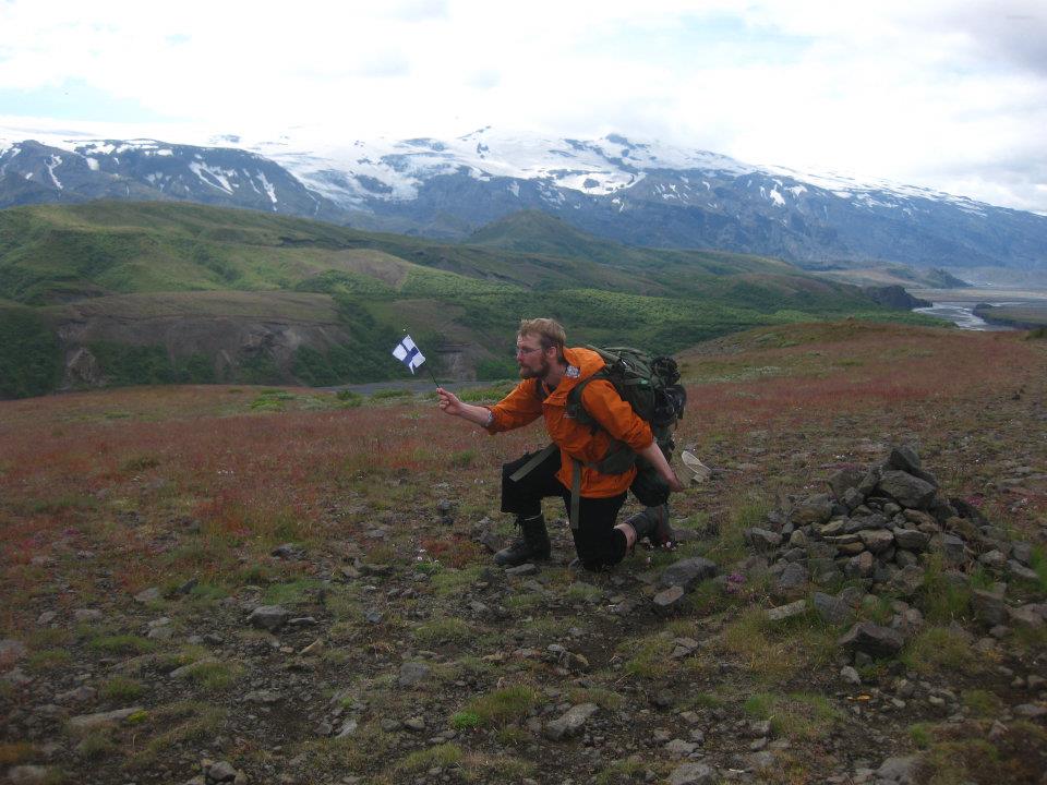 Loppumatkassa reitti kiipeää korkeammalle, ja nousun laelta paljastuu näkymä jokilaaksoon. Reissun loppu eli Thorsmork (eli Þórsmörk) häämöttää jossain joen suunnalla, ja on aika kaivaa esiin lippu ja alkaa poseerata. Tässä vaiheessa loppuu myös akku kamerasta, mutta tulihan tuossa jo tärkeimmät.
