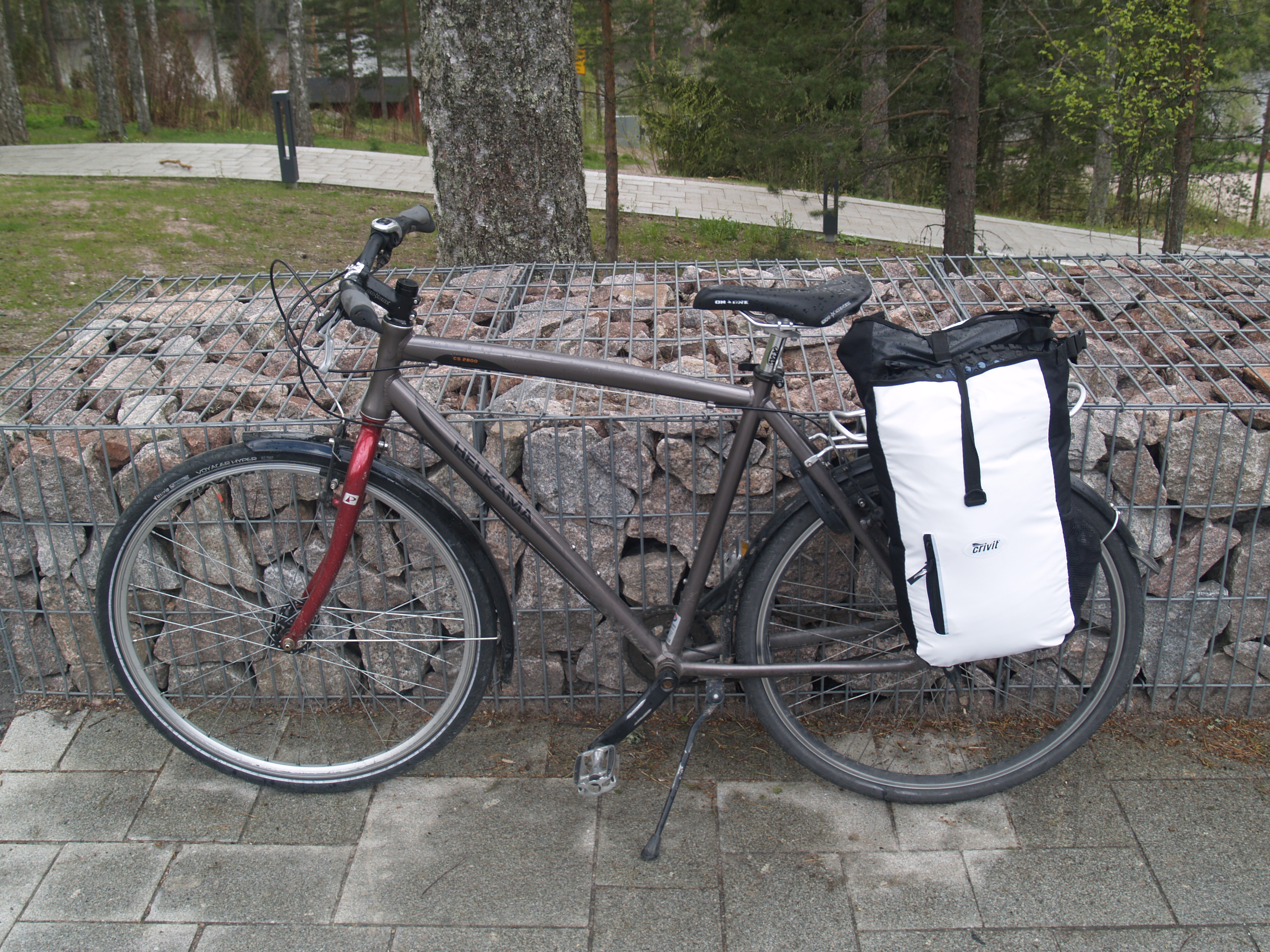 Uutta oli myös fillarilla puistoon saapuminen: aiemmin olen aina röhnöttänyt tyytyväisenä jonkinlaisen moottorivehkeen kyydissä, joten mäkien määrä ja jyrkkyys Pitkäjärven kautta pääväylää lähestyessä pisti nyt yllättäen ja kylkeenkin. Sotkeminen käy ihan treenistä ja palatessa piti yhdessä mäessä talutellakin lopussa. Nyt oli tosin jokunen kilo puntteja kiinni pyörässä kiitos Lidlin satulalaukkujen (14,99 per pari):