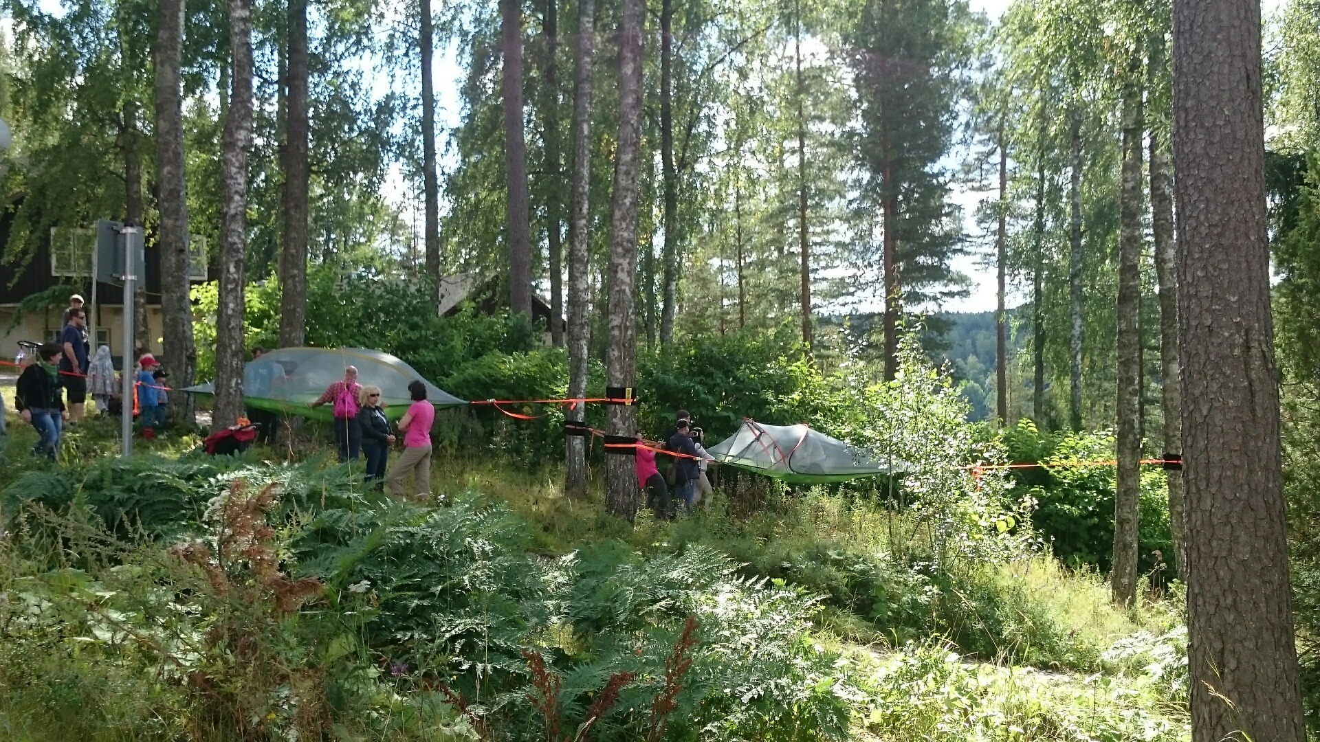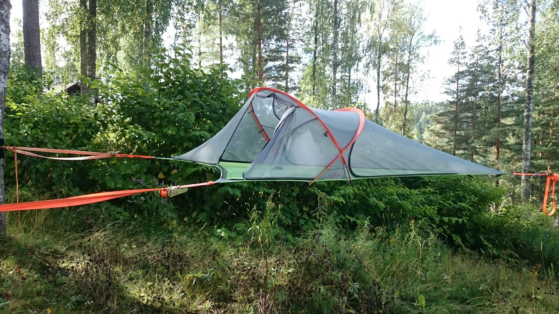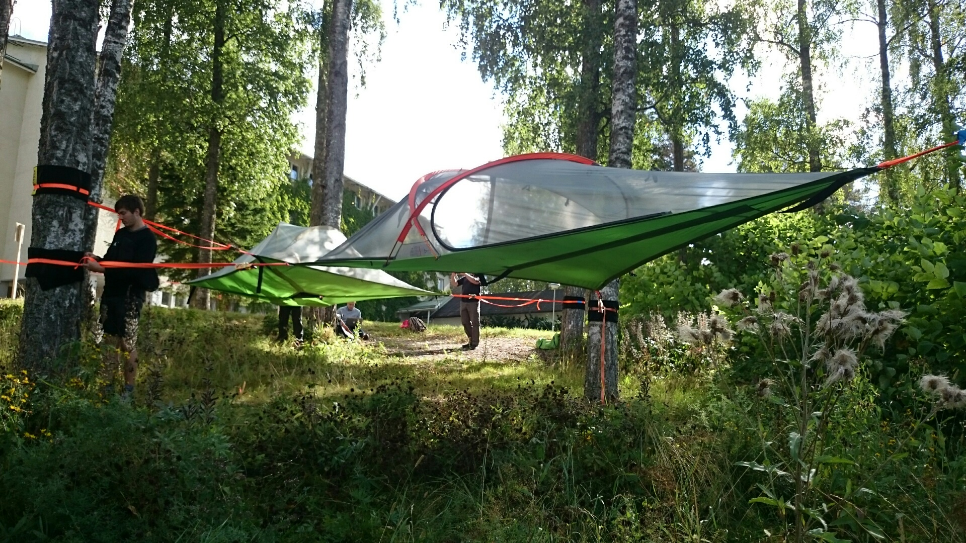 Mäellä oli myös Tentsile-telttoja. Eli tuollainen F-Zero-henkinen hässäkkä laitetaan roikkumaan 3 puusta, ja se on sitten niin kuin teltan ja riippumaton kombo. Itse olin ihan että uuh, ja lapset pomppivat näissä niin pirusti. Toimii varmasti: mökillä, mukulain kanssa, lyhemmän kantamisetäisyyden reissulla paikkaan josta löytyy 3 puuta. Epäilyttää: vuoret, kivikko, yöllä pissiminen, paino.