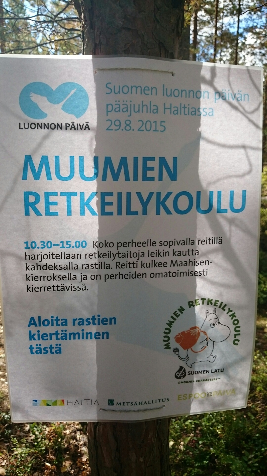 No päivää, eli Suomen luonnon päivää! Pääjuhlaa vietettiin tänään 29.8. Nuuksion luontokeskus Haltiassa. Juontamassa oli ainakin Saimi Hoyer, se punapöherötukkainen  kansallispuistokummi, ja sitten siellä oli myös asiaankuuluva farmeja ja puistoja edustava ministeri. Tärkeämmin: siellä oli myös Muumi ja Veikka Gustaffson. Jotenkin epätungoksen verran muita? Veikka pisti ilmoille muun ansiokkaan esityksen lomassa kellumaan pointin siitä, että väki on jonkin verran etääntynyt luonnosta (no aika paljonkin on etääntynyt, joten mene itseesi ATK).