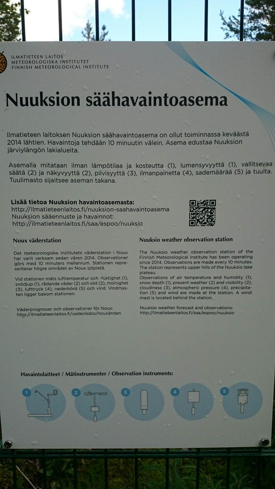 Muumien välissä kerkesin käydä Ilmatieteen laitoksen kierroksella Nuuksion sääasemalla. Nuuksion asema on avattu vasta vuonna 2014, ja kuulemma tilastollisesti ihaniin tuloksiin menee vielä useampi kymmenen vuotta. Aiemminkaan ei kuulemma ole voitu syyttää nimenomaan tätä tai 15 kilsan päässä olevaa asemaa ennusteesta, vaan mittauksia haetaan useammista asemista pitkin maata ja sitten päätellään jotain jonkin perusteella. Tuossa luontopolun varressa joka tapauksessa ammutaan lasereita, ultraääntä ja muuta kuolemansädettä kohti maata(hankea), pilviä ja muuallekin, onpa siellä myös maitotonkka sademäärien mittaamiseenkin.
