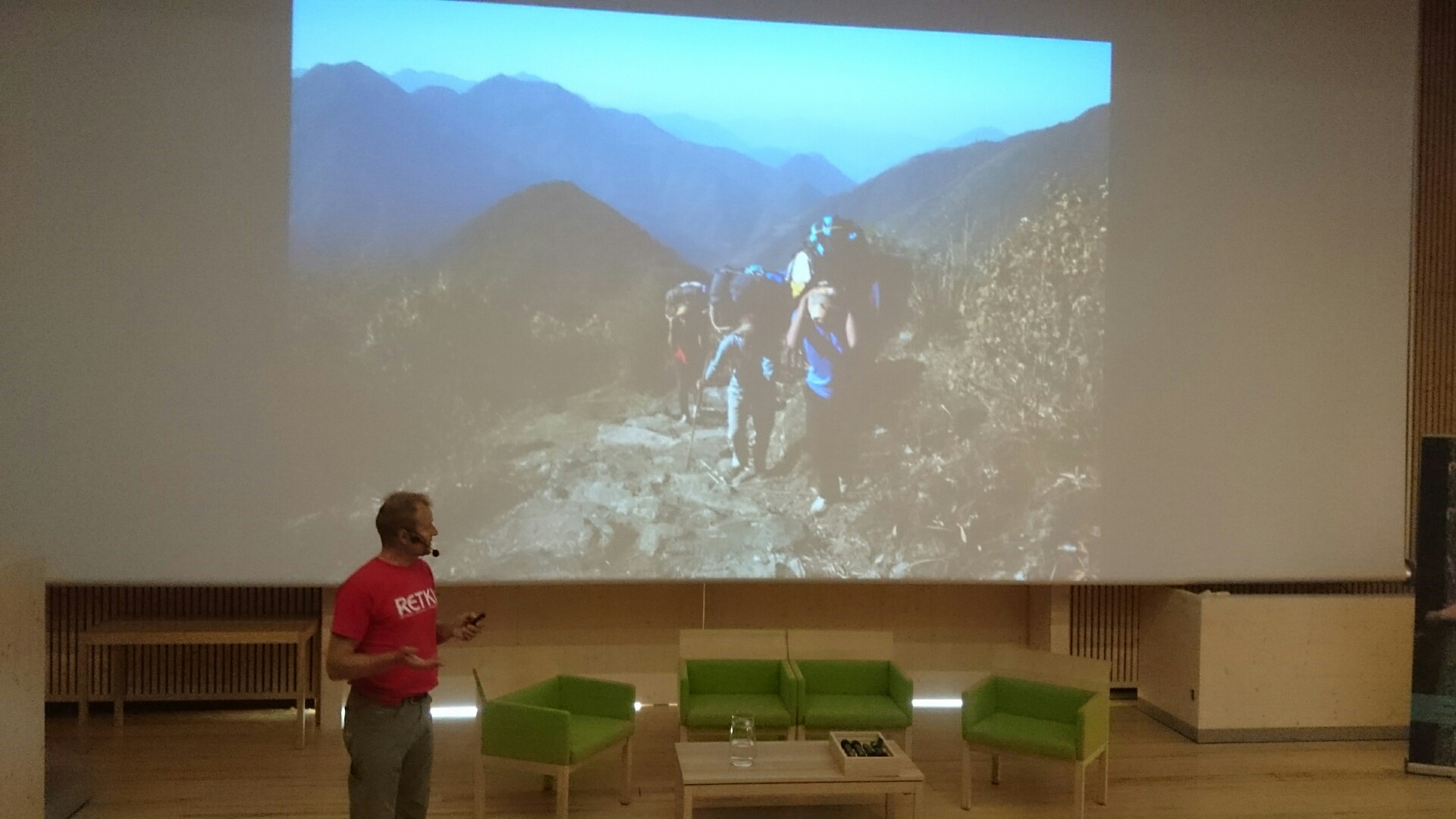 Ja sitten lopussa oli Veikka Gustaffson auditoriossa! Tyyppi on kiivennyt näköjään kaikille maailman yli 8000-metrisille vuorille (ehkä +- 20 saman rykinyttä olemassa). Puhetta oli luontoteemaan liittyen mm. lapsuudenmaisemista ja yleisestä ulkona häröilystä. Vuoret olivat kuulemma vain ~20 vuoden painottunut sivutuote muutenkin jatkuvasti luonnossa elämisestä, johon sisältyy esim. hiihto, metsästys, melonta ja kalastus sekä talvella että kesällä. Myös kullankaivaminen Lapissa (kannattaa kaivaa tosissaan jos meinaat saada pointseja bootcampilla) ja majakan (Kallbådan) adoptointi ovat nykyään mukana touhukimarassa. Ja sitten kanssa Retki-lehden kustantamiseen osallistuminen. Perustelut ”tulevaisuuden median”, paperilehden, valitsemiselle olivat niin vakuuttavat että melkein olin jo täyttämässä kuponkia ovella.