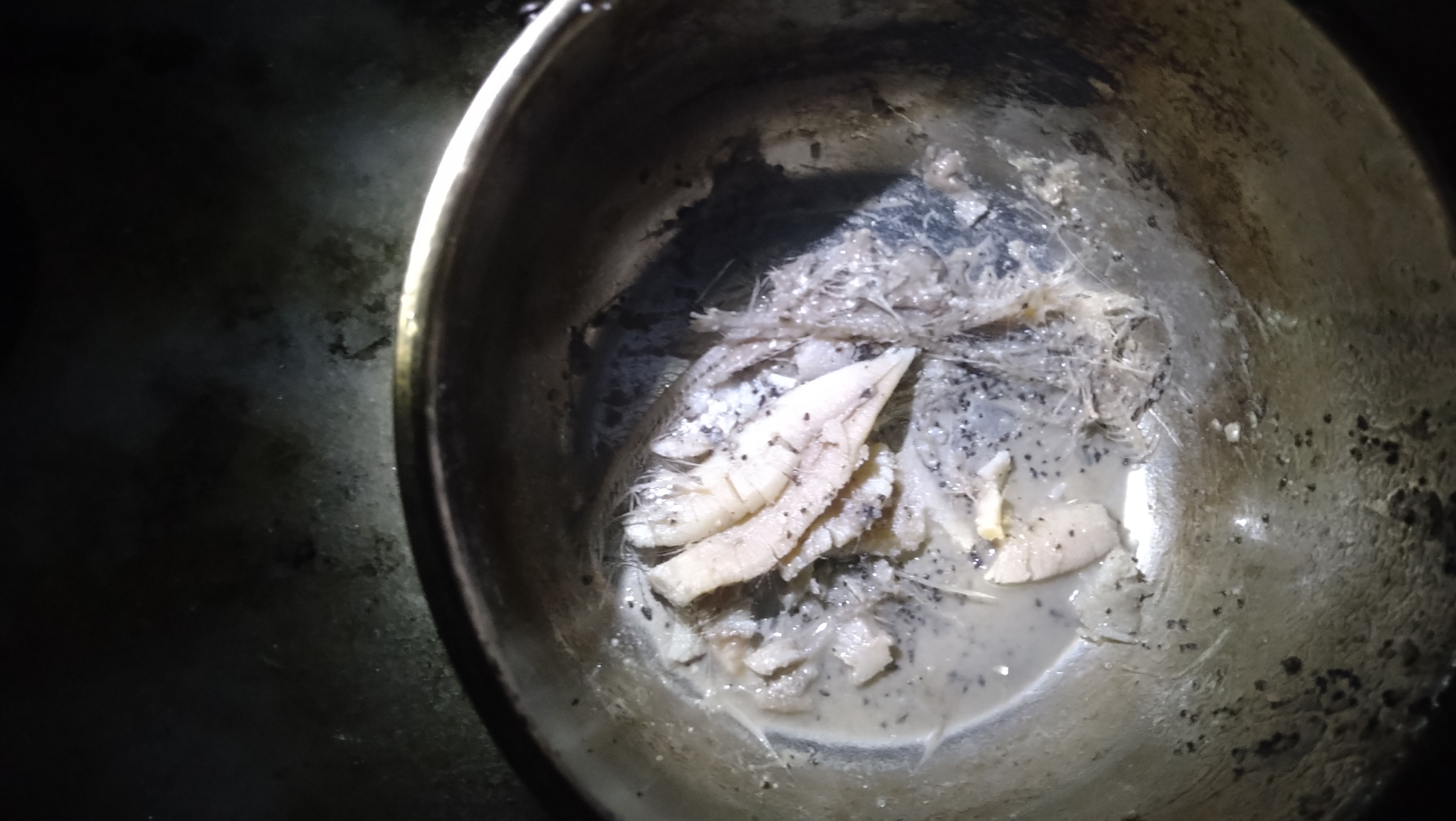 Usean huuhtomisen jälkeen suurin osa liejukalasta irtosi ruodoista, ja oli aika tai pakko laittaa siivu rieskan päälle. Täysin epäkelpoa, kun et kuitenkaan usko niin kokeile itse. Tämän postauksen paras anti on protip siitä, että pitkään aniksen ja laakerinlehden kanssa uitettu vodka pesee hyvin kädet sen jälkeen kun pimeää materiaalia on joutunut koskemaan.