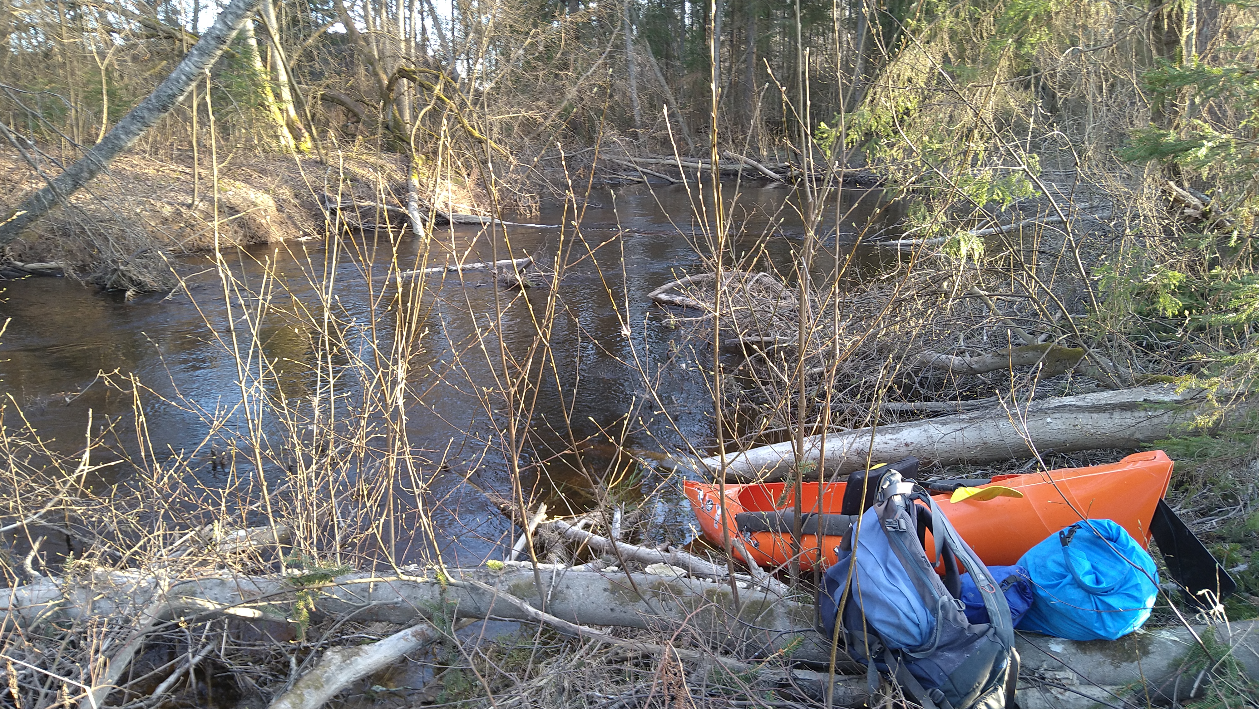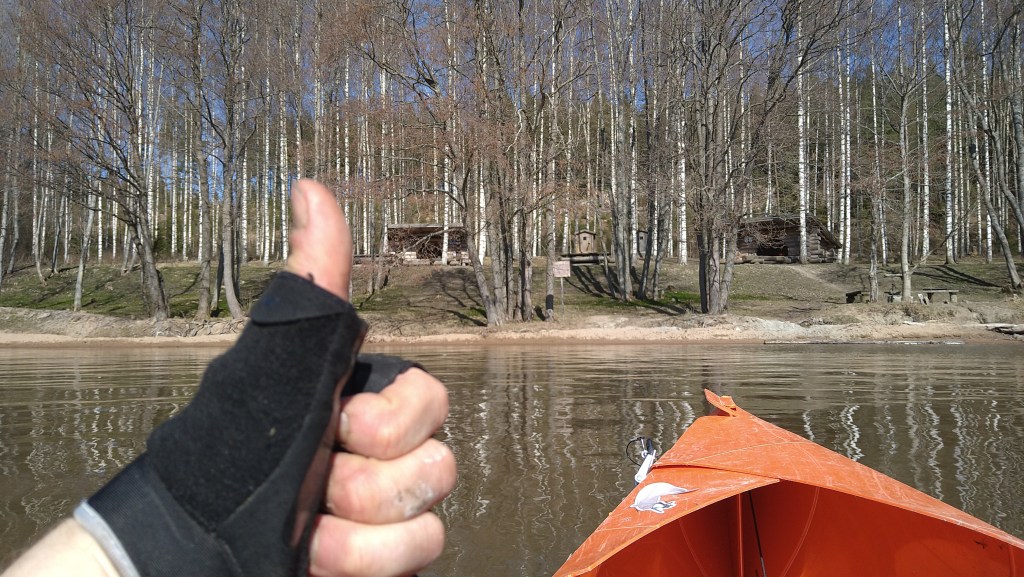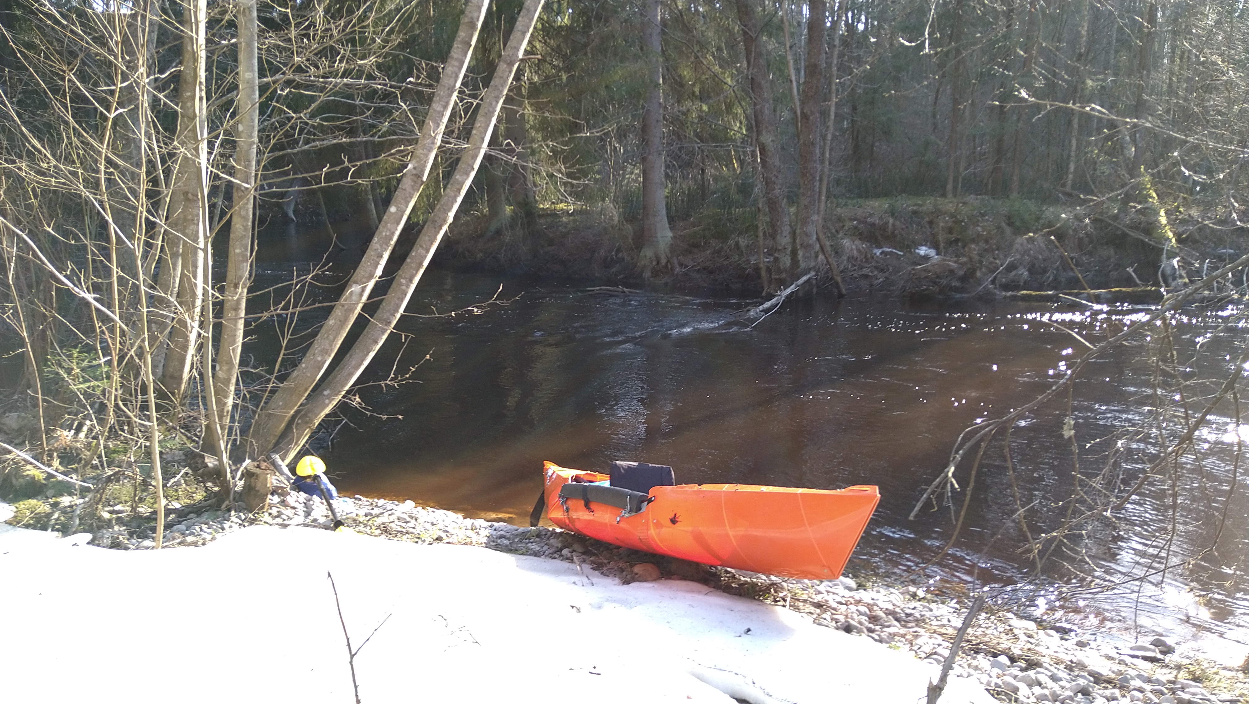 Varsin mainio laavukierros tulvajoella! Ainakin näin paljon veden aikaan joki on hyvinkin hyvin melottavissa, tosin pientä esterataa pukkaa. Uppotukkien yli vauhdilla poksauttelu opetti myös sen, että Tucktecin kiinnityssalpojen kiristykset kannattaa laittaa oikeille kohdille. Hoksasin jossain vaiheessa ensimmäisen päivän romurallia, että kummaltakin puolelta kajakkia oli muljahtanut auki yksi sivusalpa. Onneksi paatti ei kuitenkaan näytä levähtävän auki välittömästi tuollaisestakaan vahingosta, ja salpojen oikealla kiristyksellä siitäkin riesasta pitäisi päästä. Kuulemma sama voi tapahtua uppotukkipaukuttelun lisäksi myös kovassa aallokossa, tosin kovaan aallokkoon tuksulla ei ymmärtääkseni pitäisi mennäkään.