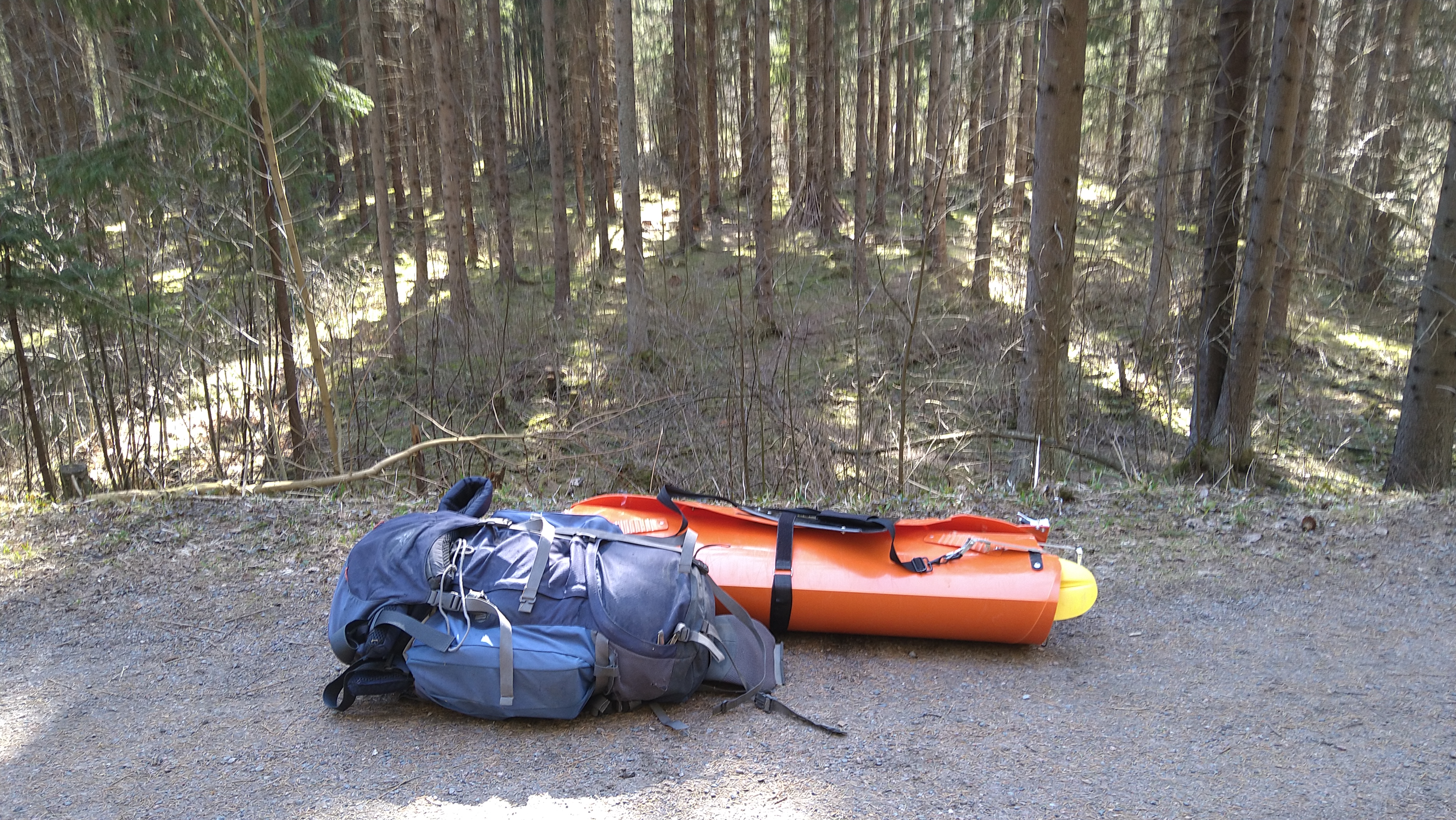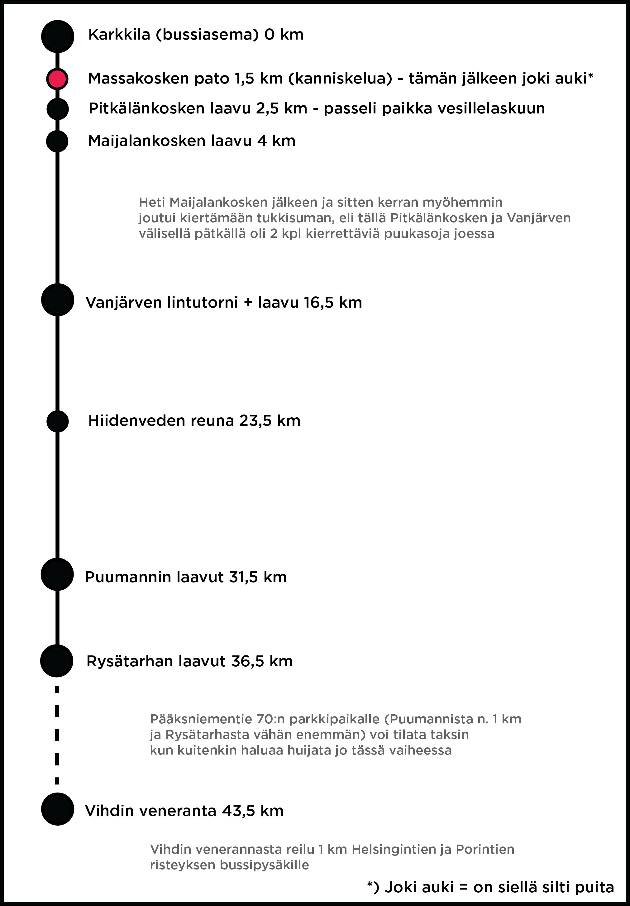 Alkumatkasta pitää etsiytyä Karkkilasta Vanjoen varteen. Bussiasemalta tullessa osuin joen varteen vähän Myllykosken jälkeen, ja sitten joenviertä seurailemalla löytyy spotti, josta pääsee luontopoluille. Bussiasemalta on noin 1,5 km kävelyä Massakoskelle, joka on viimeinen joessa melomisen estävä rakennelma ellei tukkisumia lasketa. Tuksuvene on onneksi varsin näppärä kannettava.