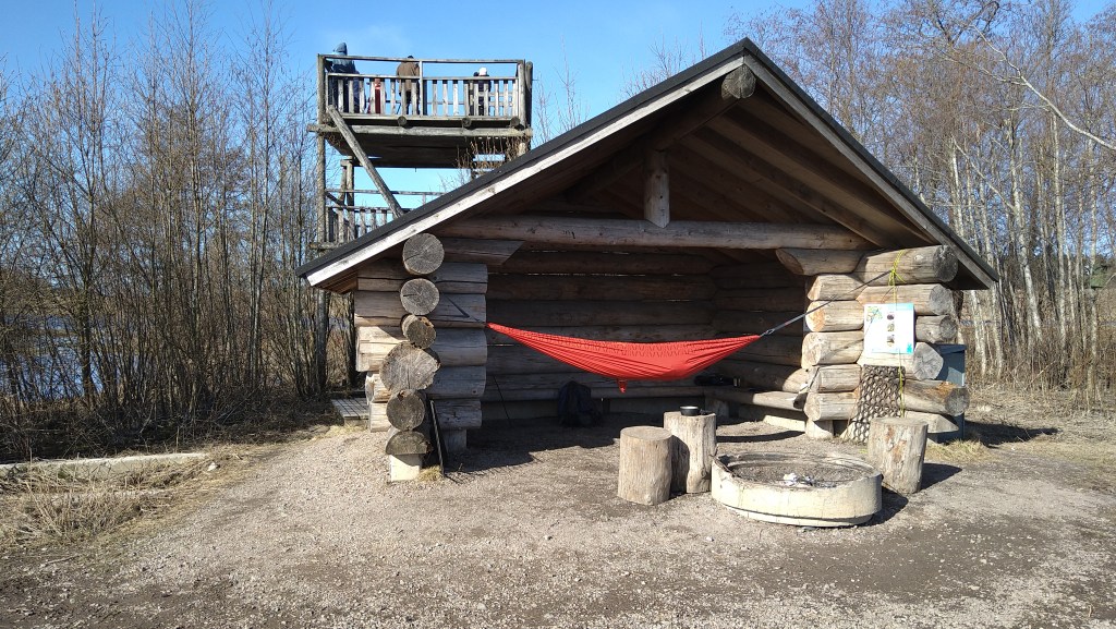 Perillä tornin ympäristö oli julmetun tulvainen, mutta onneksi kuivaa maata ja vähän polttopuitakin piisasi vielä. Sameudestaan huolimatta Vanjärven vesi tokeni keittämällä ihan juomakelpoiseksi, ja riippumatolle löytyi just sopiva väli laavun julkisivun parruista. Riippumatto olikin hyvä olla mukana, koska laavun laverit ovat leveydeltään penkkejä. Tai siis laavussa on penkit eikä laverit.