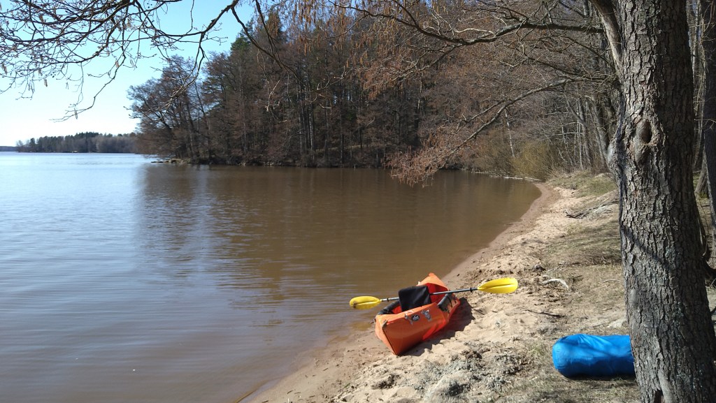 Loppusijoituspaikka kuitenkin ilmaantui silmiin ja oli erinomainen. Puuta oli kukkuroittain ja rannassa piipahti illan mittaan parikin vesilläliikkujaa, joista toisilta sain makkaraa ja toiselta hyviä vinkkejä, priimaspotti siis.