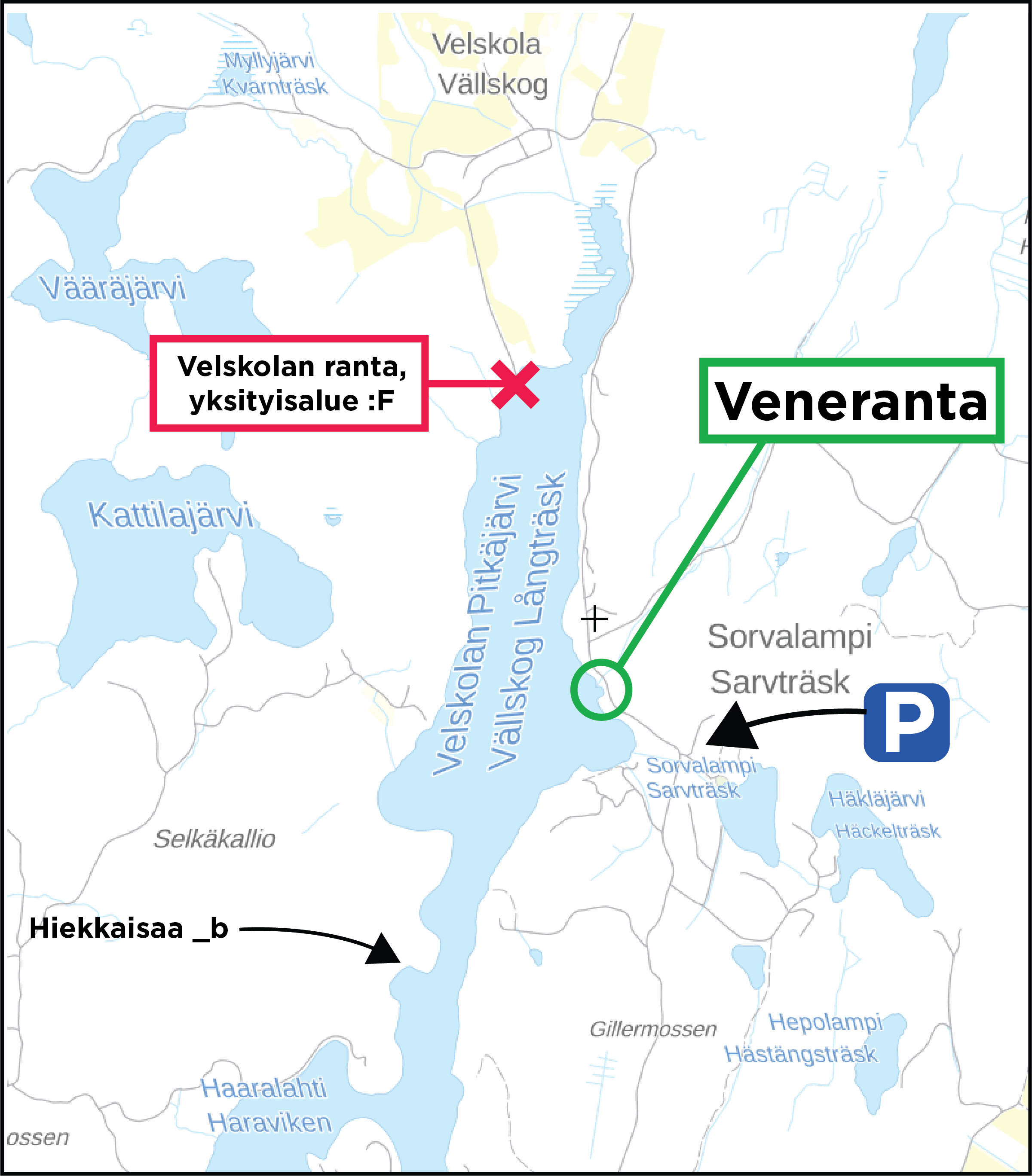 Merkinnät paikan päällä ja netistä löytyvä info (kai) sallitusta vesillelaskupaikasta Velskolan Pitkäjärvellä ovat hyvinkin kituliaat, mutta onnistuin kuitenkin löytämään tarinan vihaisista alkuasukkaista häätämässä väärään rantaan (ja parkkiin) eksyneitä melojia ”kaupungin omistamaan venerantaan”. Olen vahvasti sitä mieltä että se on ehkä tämä mistä nyt kirjoittelen omiani, ehkä joku korjaa jos meni pieleen.