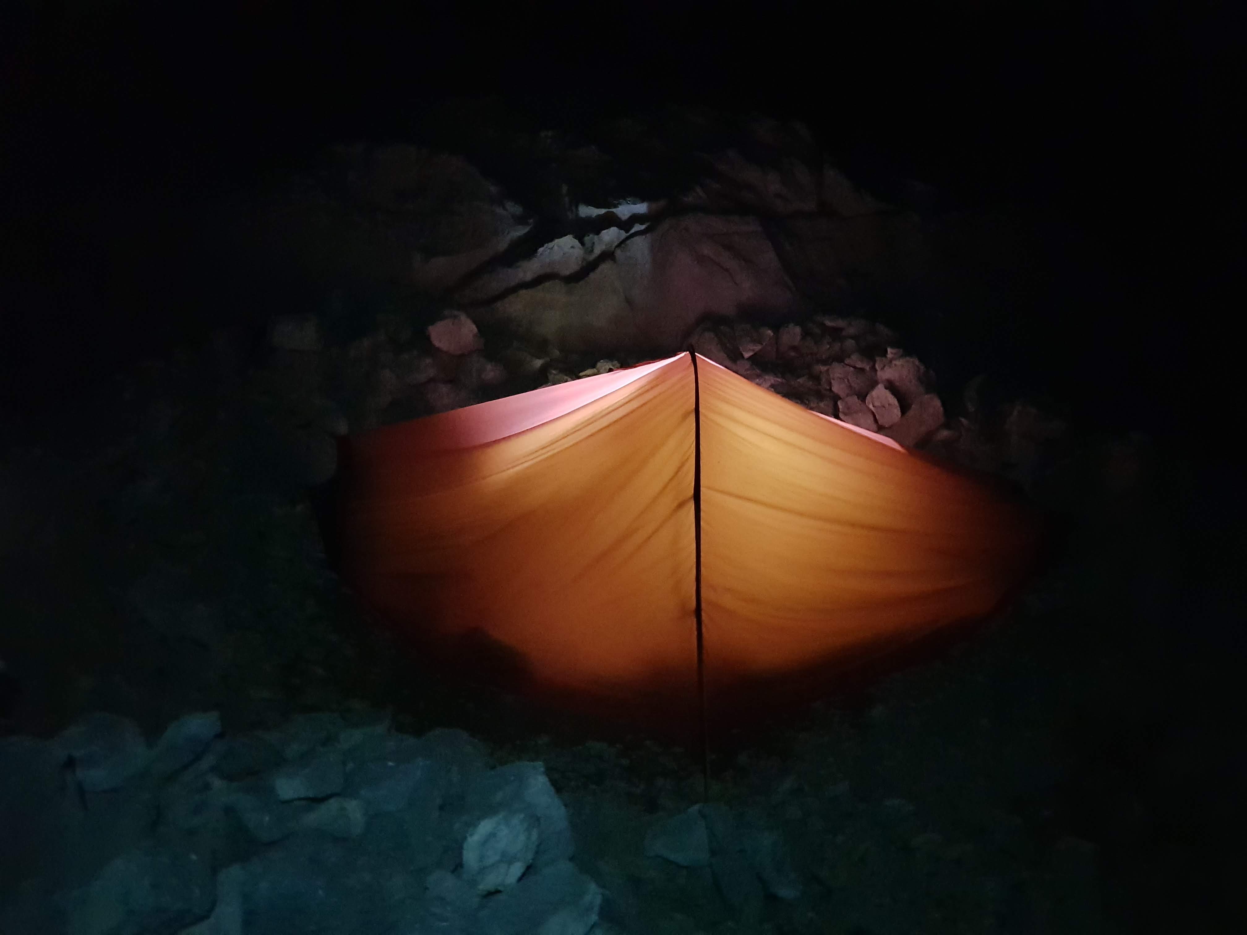Reissuun toi Suomi-väriä myös Lapin ystäväin yhdistyksen eli Helsingin Seudun Lapinkävijöiden vuokravarustamon kautta ronkittu erinomainen 1 hengen teltta, Hillebergin Akto. Tarkeni syysyötkin vuoren kolossa eikä painanut paljoa isonkaan mäen päälle kantaessa.
