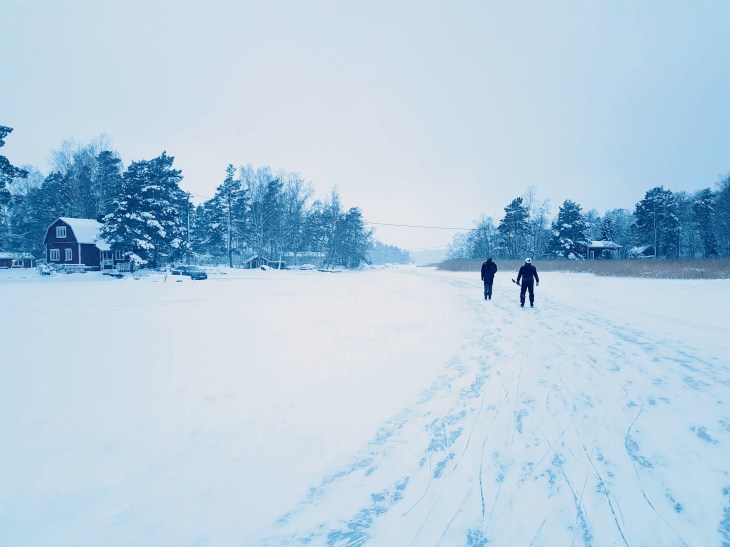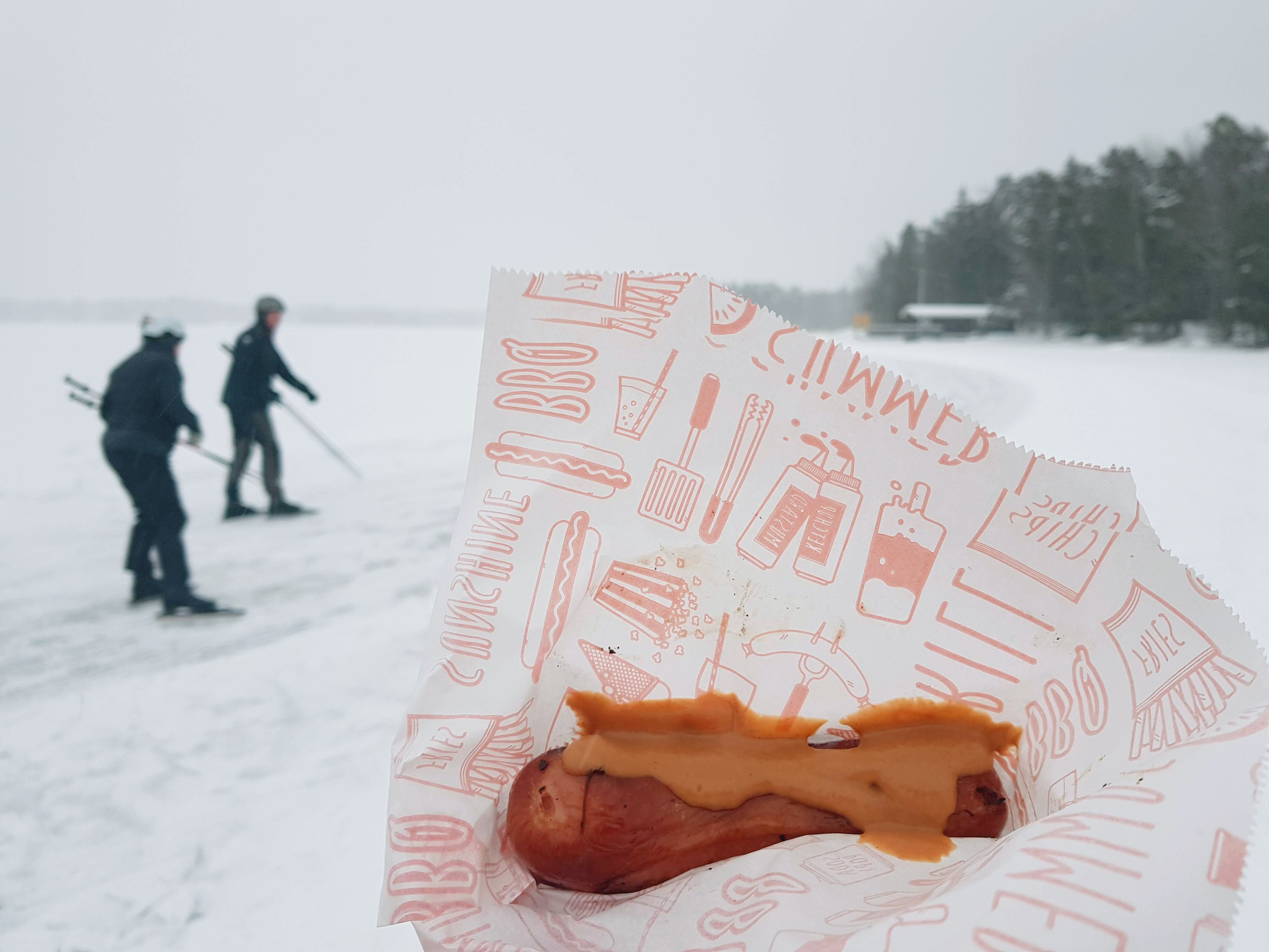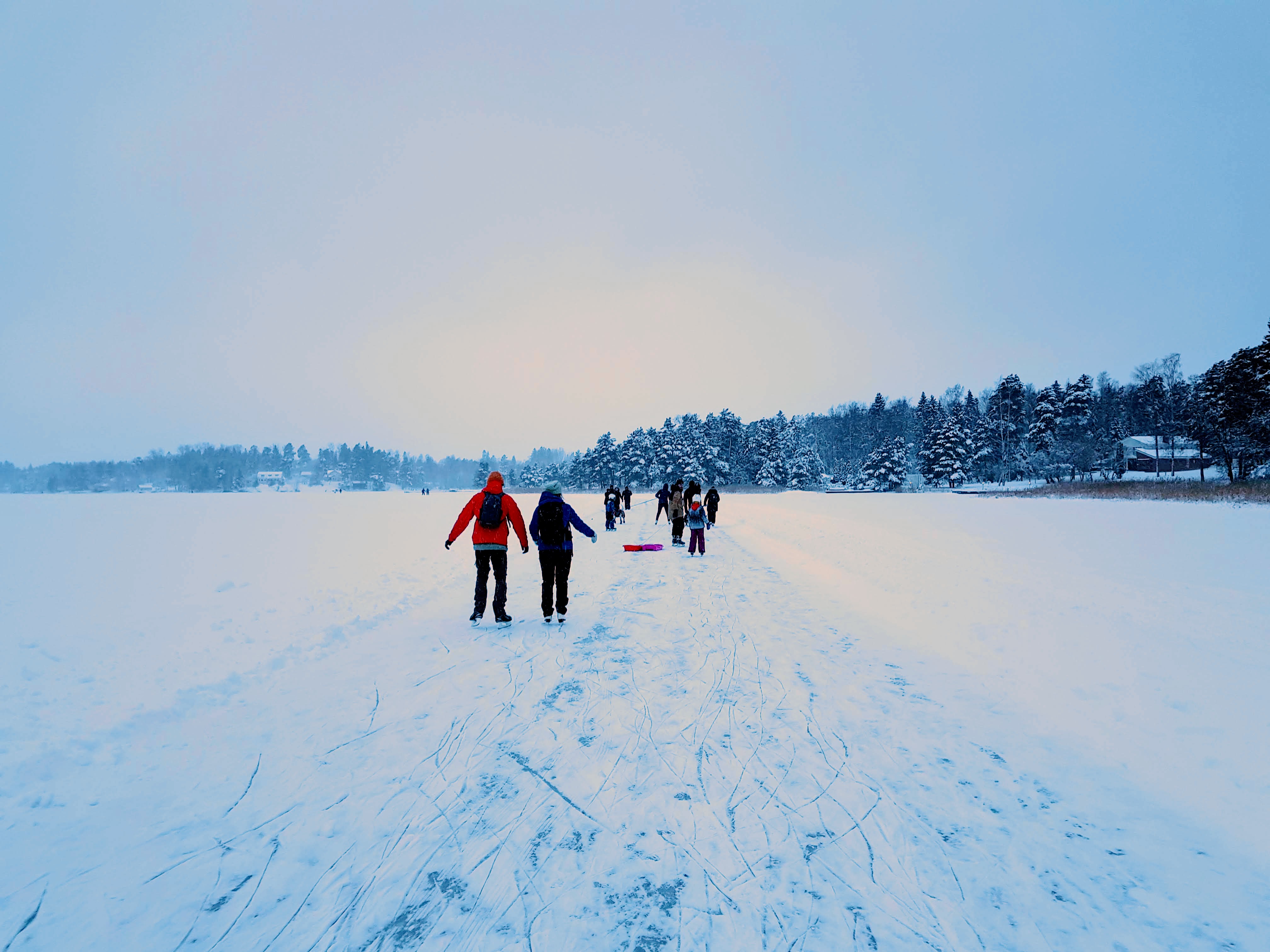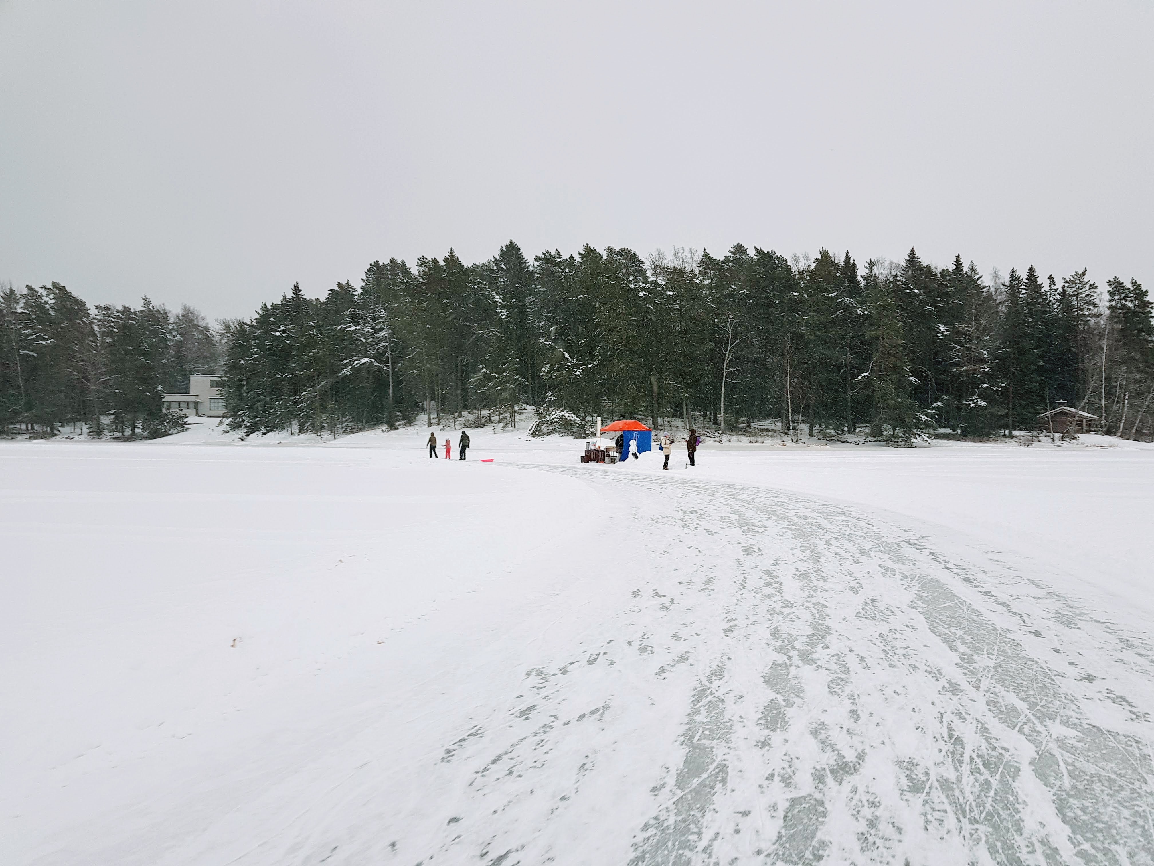 Tyystin uusi luistelubaanatuttavuus tuli testattua Suvisaariston suunnassa (tänne melomaan kesällä), eli Hanikan uimarannasta Soukan suunnilla lähtevä 6 kilometrin rata. Erikoisuutena oli nohevien nuorisolaisten laittama kahviteltta, jonka makkara sopi just siihen puolimatkan kohdalle _b