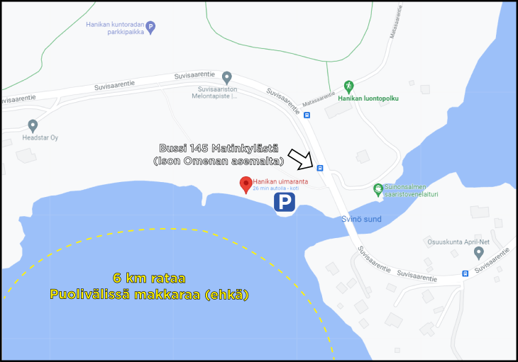 Miljöö on eri mainio, ja sijaintikin melkoisen helppo ainakin autolla (Hanikan uimarannalla on semitilava parkkis, tosin pientä ruuhkaa oli nytkin vaikka keli pykälän rähmäili). Julkisilla pääsee ihan viereen, eli bussi 145 osuu juurikin siihen kohdalle kun jää pois Suinonsalmen pysäkillä. Bussiin pääsee kyytiin Ison Omenan sisältä, eilen ainakin laiturin numero oli 4. Kiitos ja kumarrus radan veivaajalle ja makkaranuorisolle! Ja sille tyypille joka oli tuonut lepotuolin radan varteen, vähän pisti houkutellen 😀 Pitääpäs kärkkyä uutta pistoa, tää on hyvä.