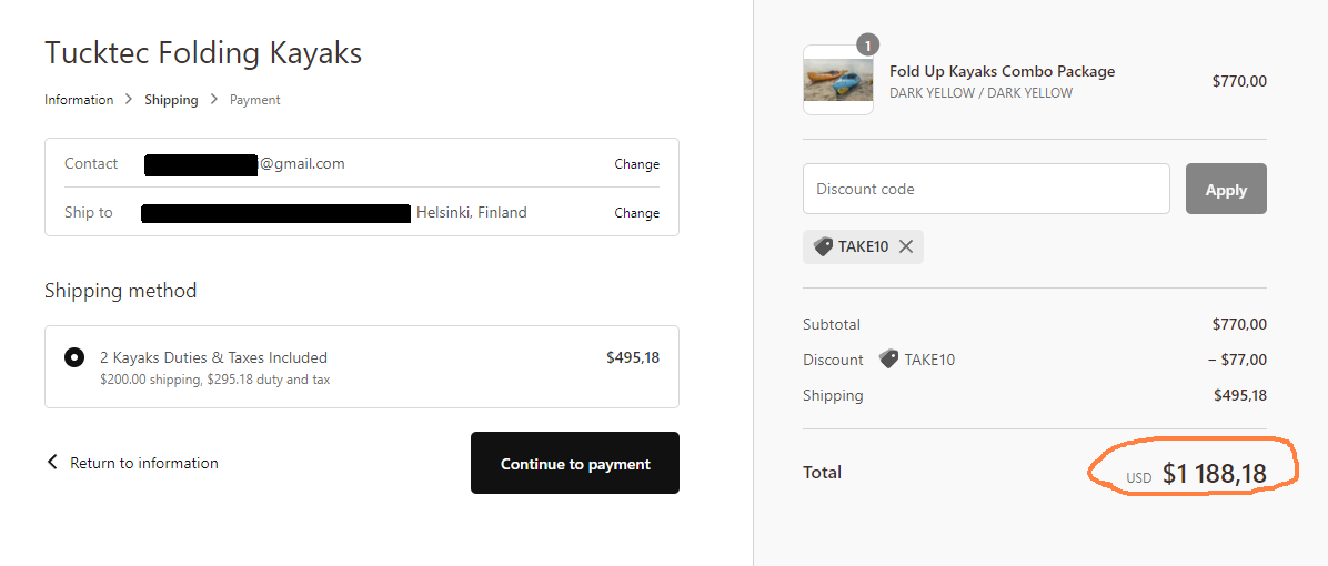 Jos tilaa 2 paattia samalla ja jättää ostoskorin kesken, postilaatikkoon kilahtaa muistutus jossa on 10 % alennuskoodi. Sillä ja vähän halvemmilla postikuluilla kun ottaa 2 kerralla yhden Tucktecin hinnaksi tulee ~590 euroa. Ei oo helppoo valita! Vielä jää epäilyksen varjo siitä että onko tuo duty&tax oikeasti lopullinen: ehkä kysymällä selviäisi.