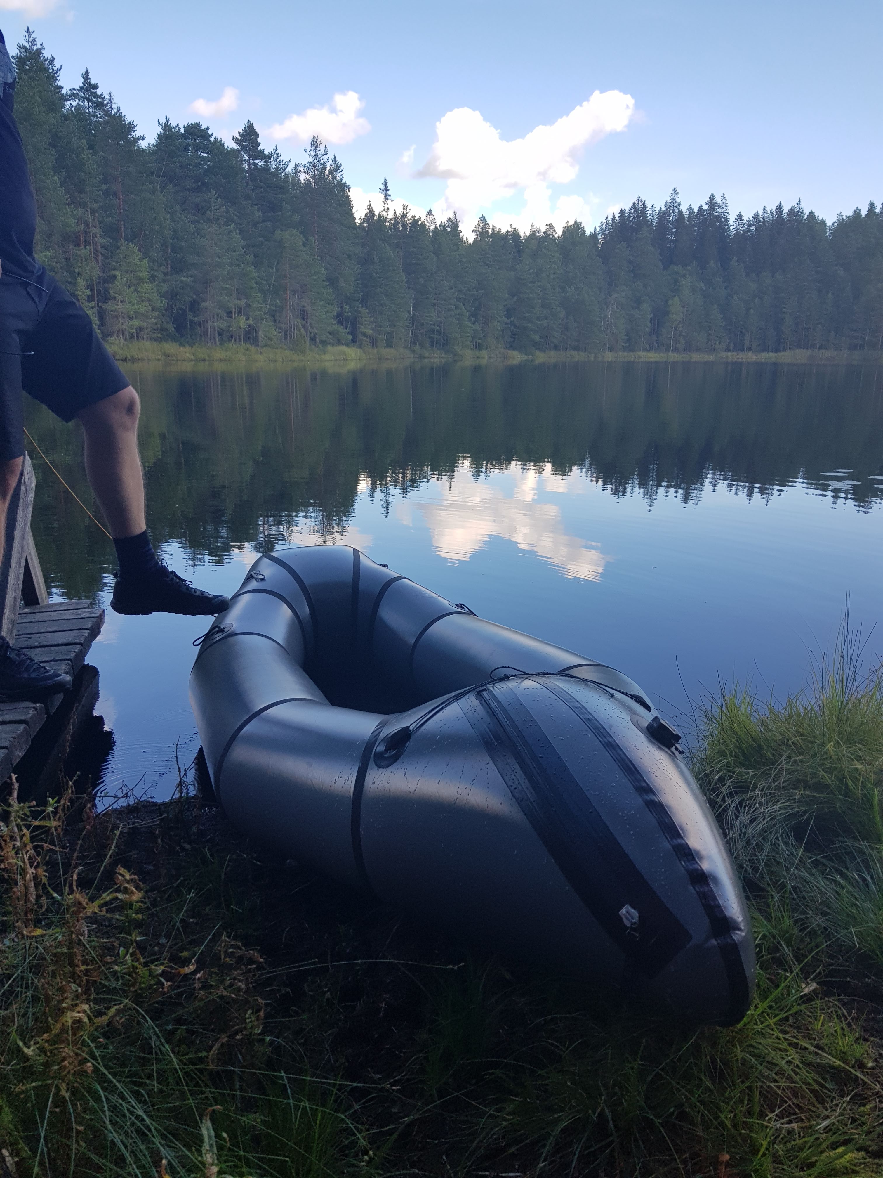 Pumppaaminen onnistui ainakin näitä ennen käyttäneeltä näppärän näköisesti ilmapussilla, ja myös veneeseen nousu oli kahdedittavan akrobaattista.
