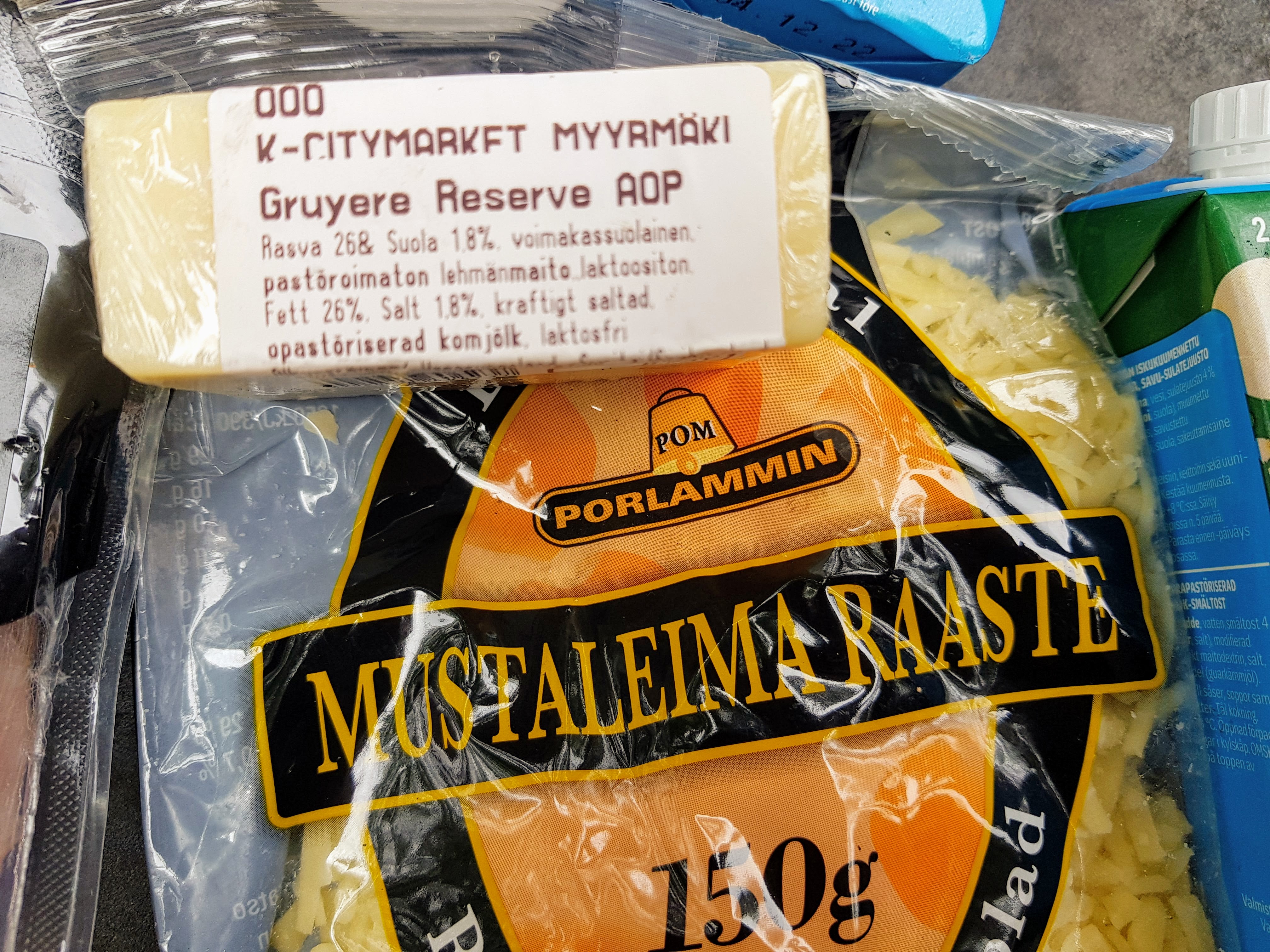 - 100 g gruyere-juustoa ja 150 gramman pussi mustaleimaista emmentalia (jäi yli)