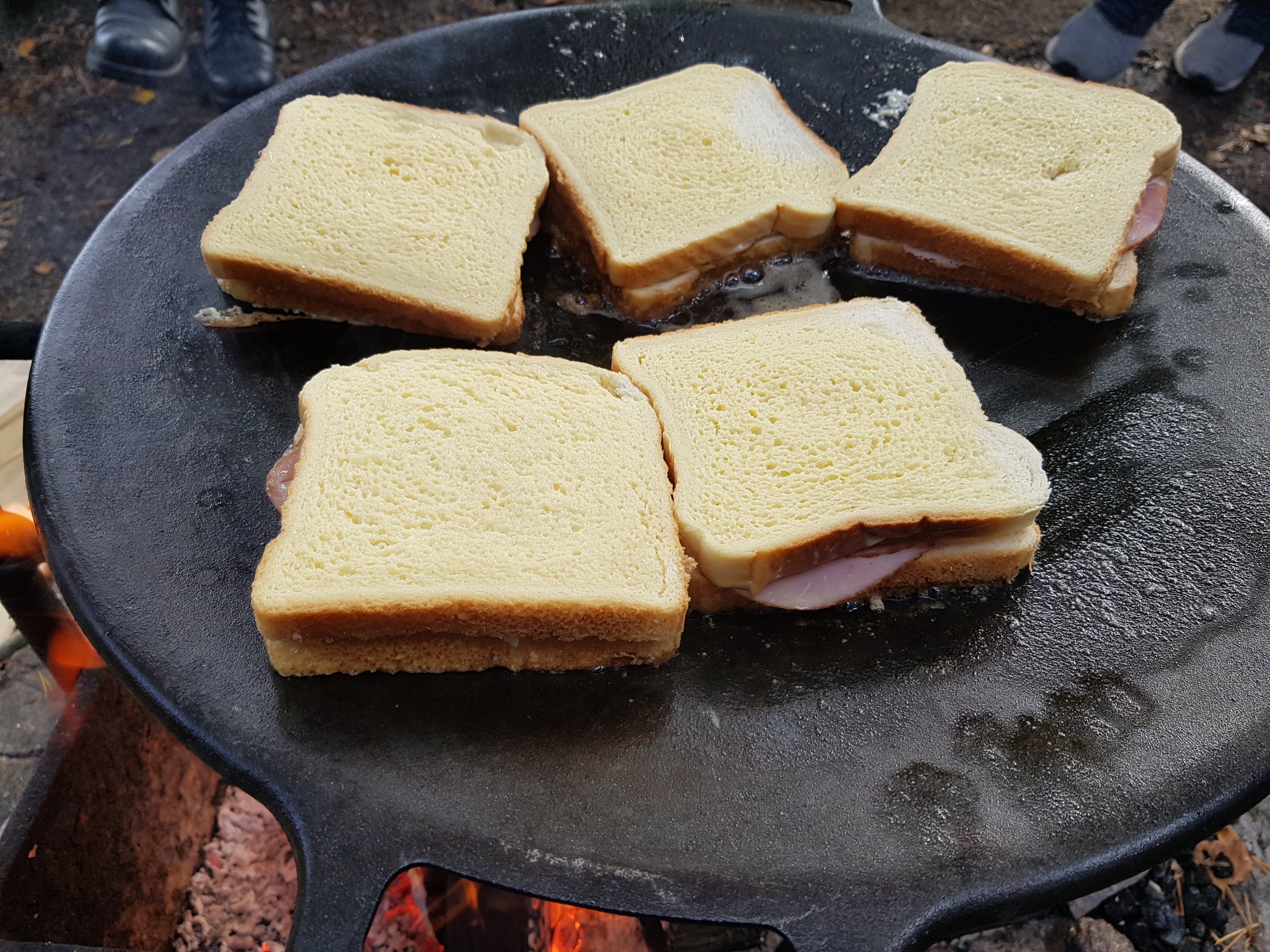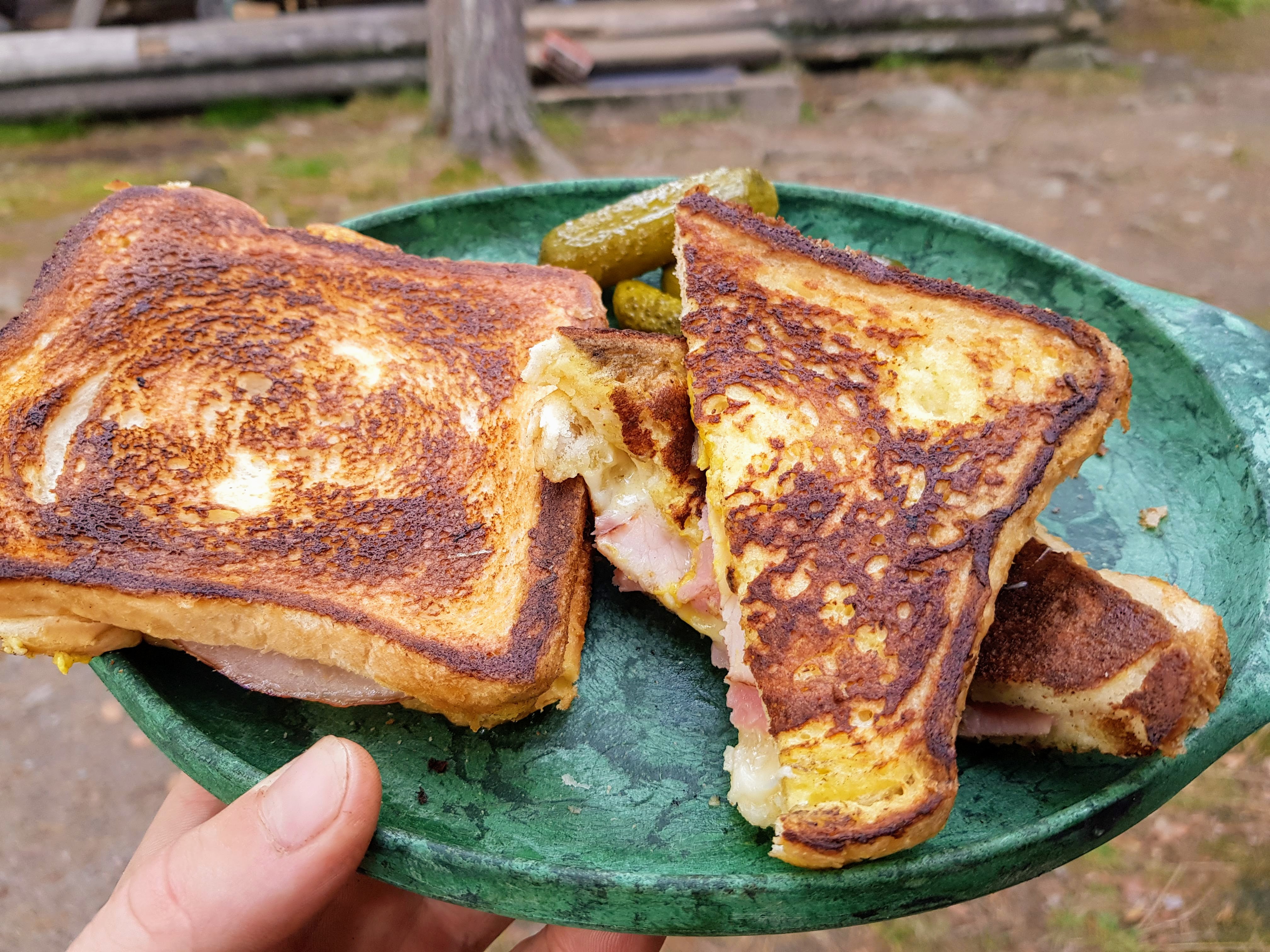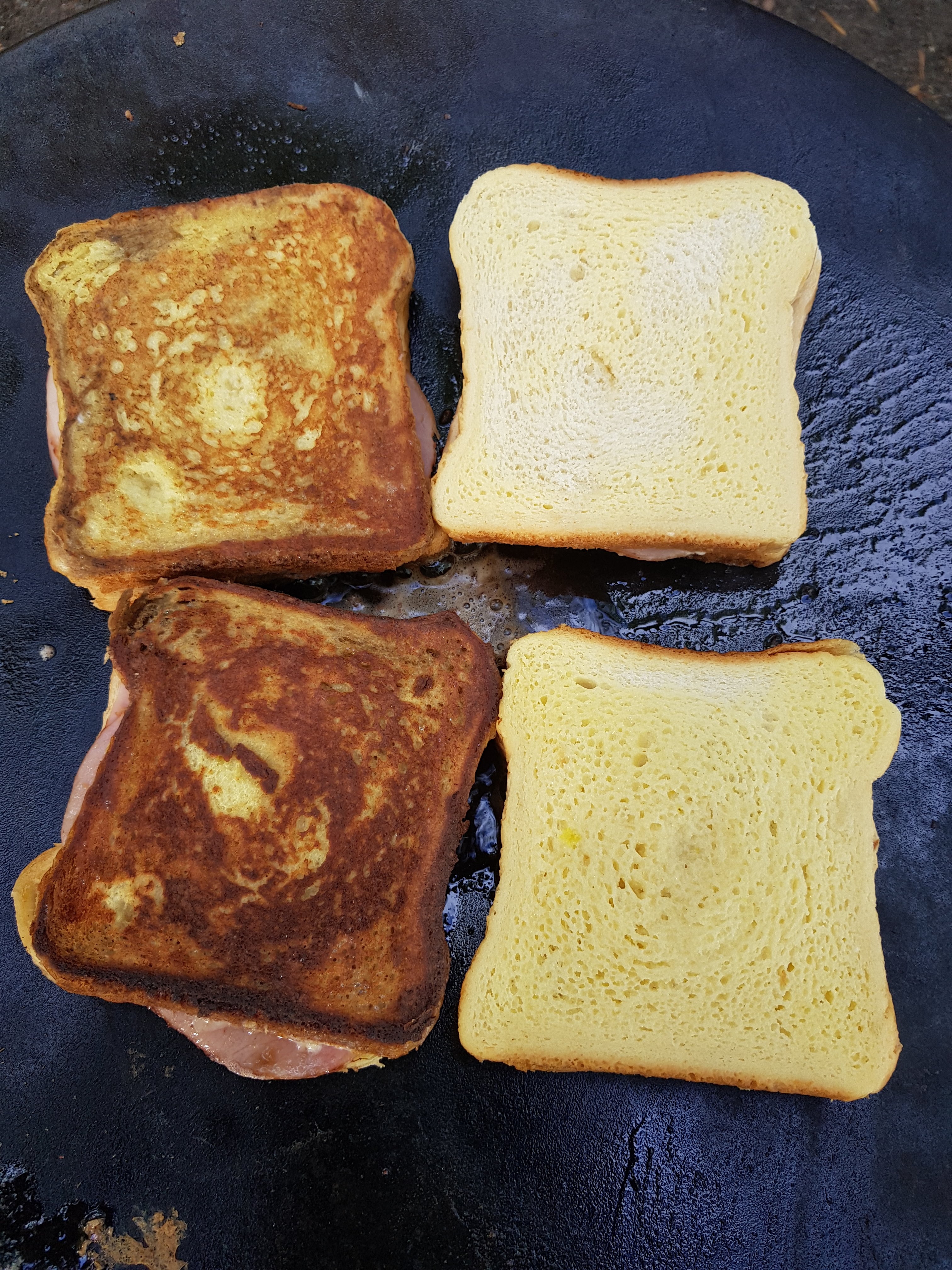 Piipahdimme päiväkseltään vanhalla kunnon Hyypiön kämpällä moikkaamassa apinalaumaa, ja vaikka visiitti olikin lyhyempi, notskikokkailuun oli silti just hyvä sauma. Jossain netissä luuhatessa silmään oli osunut Monte Cristo -voileipien resepti, eli köyhien ritareiden mallisesti soosattuja paahtoleipiä. Setti osoittautui eri toimivaksi ja helpoksikin nuotioruuaksi: kunhan kerrosleivät saa kasattua, sen jälkeen ne tarvitsee vain pyöräyttää pikaisesti kananmuna-kermakombossa ja viskata muurikalle tirisemään. Kuorrutus kermamunasoosilla päivittää kokemuksen aika paljon normitoastia ökymmäksi, ja jötkäleestä tulee hyvinkin ruokaisa.