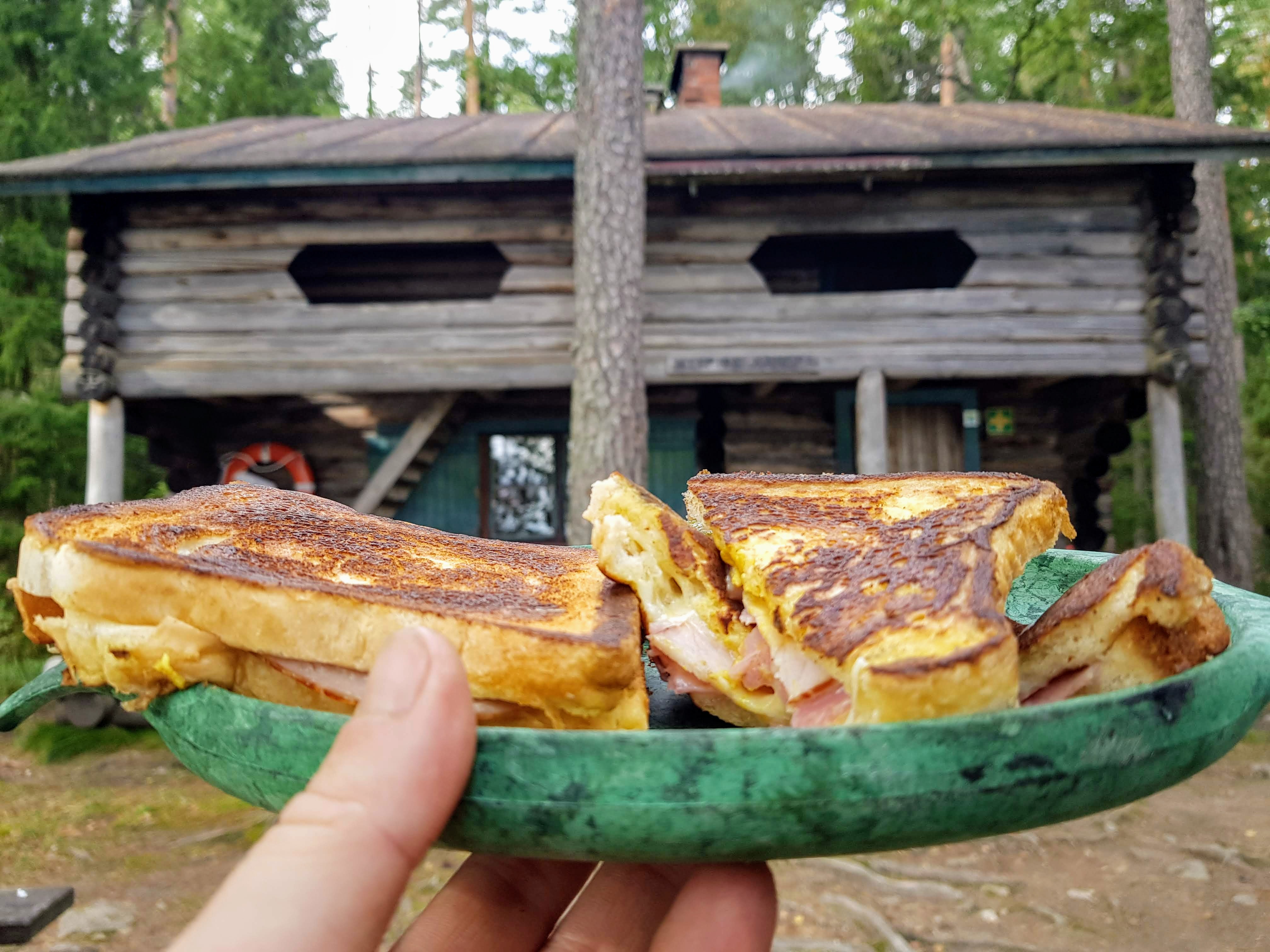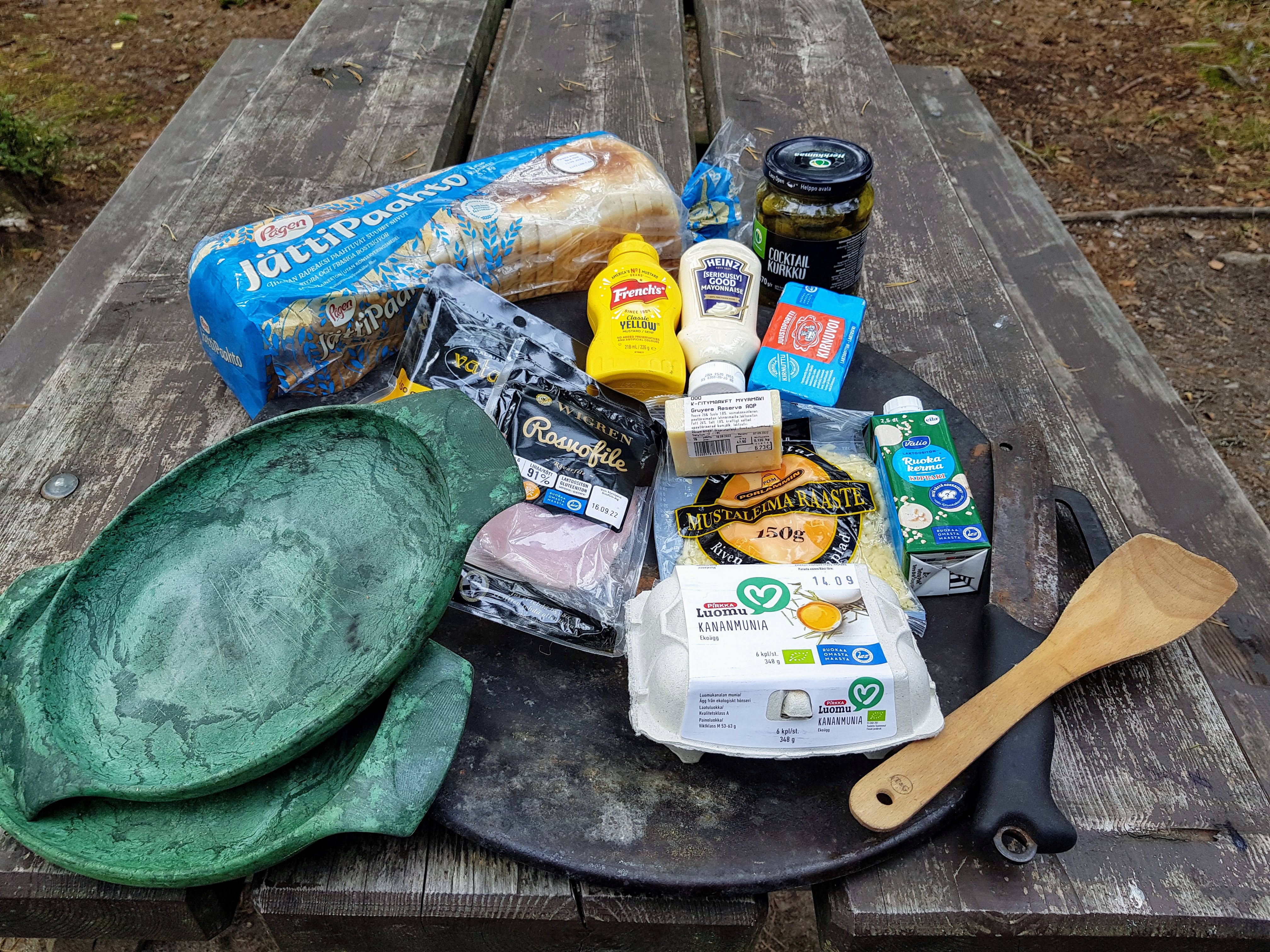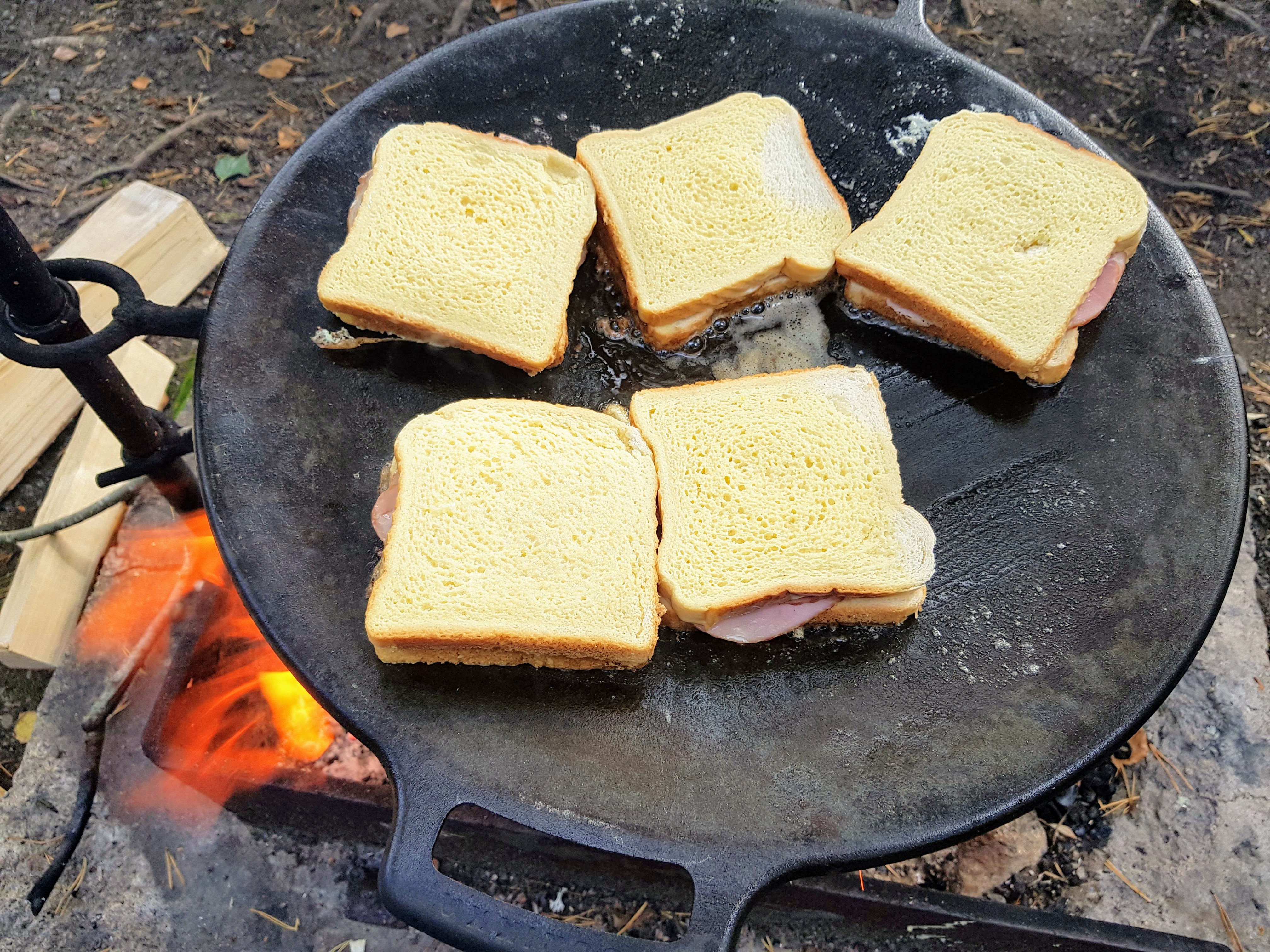 Piipahdimme päiväkseltään vanhalla kunnon Hyypiön kämpällä moikkaamassa apinalaumaa, ja vaikka visiitti olikin lyhyempi, notskikokkailuun oli silti just hyvä sauma. Jossain netissä luuhatessa silmään oli osunut Monte Cristo -voileipien resepti, eli köyhien ritareiden mallisesti soosattuja paahtoleipiä. Setti osoittautui eri toimivaksi ja helpoksikin nuotioruuaksi: kunhan kerrosleivät saa kasattua, sen jälkeen ne tarvitsee vain pyöräyttää pikaisesti kananmuna-kermakombossa ja viskata muurikalle tirisemään. Kuorrutus kermamunasoosilla päivittää kokemuksen aika paljon normitoastia ökymmäksi, ja jötkäleestä tulee hyvinkin ruokaisa.