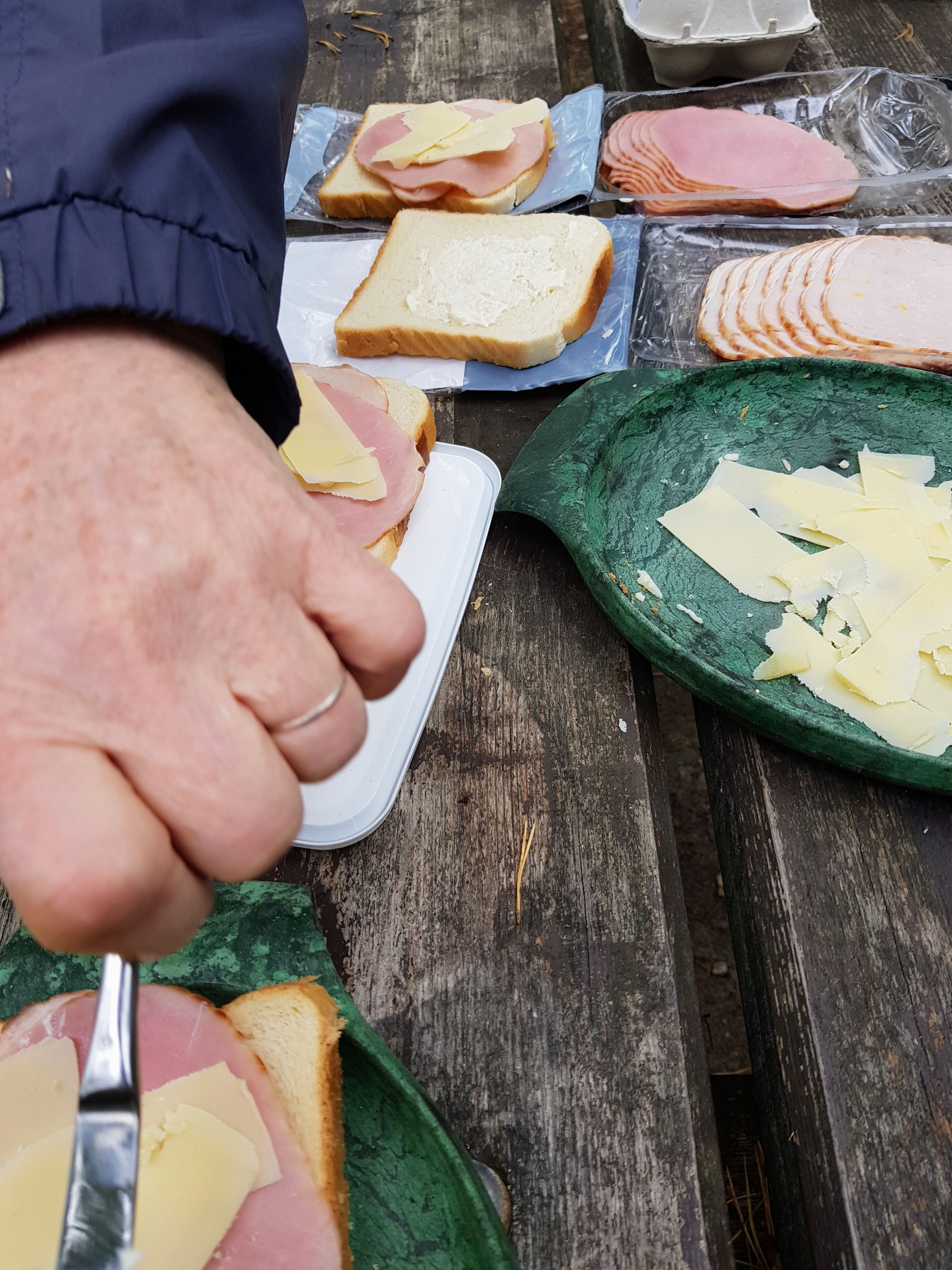 Alempaan leipään ruokalusikka sinappia, sitten leikkeleet päälle, sitten juustoa silleen että maistuu, sitten majoneesia ruokalusikallinen kansipuolen sisäpintaan ja leipä kiinni, vähän painelua. Leipiä voi tehdä linjastolla (tai kotona) himmeen kasan odottamaan paistamista. Sitten kun pannu on kuuma ja voi tirisee, leipä pyöräytetään molemmilta puolilta kerma-kananmunaseoksessa ja viskataan pannulle. Munakerman astiana toimi näppärästi semmoinen neliskanttinen keksiloota mitä koululaiset pakottaa ostamaan, koska sinne mahtuu hyvin härkkimään leivän kanssa eikä se ole liian syvä.