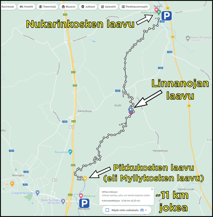 Näille laavuille melonta ylävirralta alespäin eli Nukarinkoski – Pikkukoski (Myllykoski):