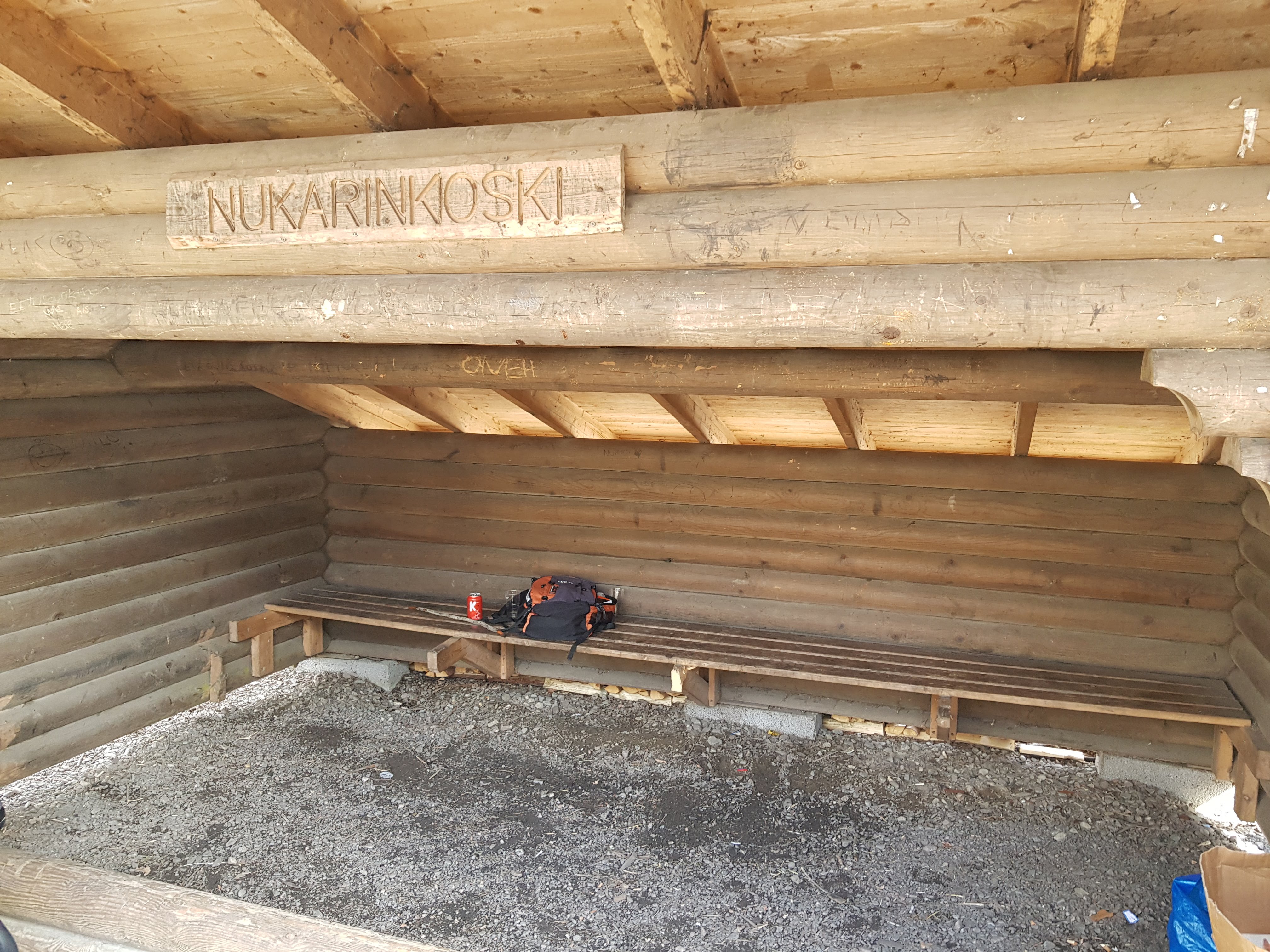 Pohjoisin näistä kolmesta on Nukarinkosken laavu, jonka ympäristö on mainion nättiä jokivartta pitkoksilla ja siltapadolla höystettynä. Paikka on julmetun suosittu ja parkkis on pelottavan lähellä, joten jos tässä kohtaa aikoo yöpyä, pitää varautua heräämään aikaisin päiväkotiryhmän ulinaan tai sitten hipsiä suosiolla riippumattoon jonnekin syrjemmälle kunhan illan grillailut on paketissa. Sen siltapadon läpi ei kannata yrittää meloa, laavulle asti ylävirralta sen sijaan voi yrittää jos on tarpeeksi tyhmä ja alla oleva vene (sekä meloja) kestää kivissä kolistelua. Laavulta joen vartta etelään lähtemällä löytyy myös nuotiopaikkoja ei kovin monia satoja metrejä patosillan jälkeen: jos niillä sattuu olemaan puuta tarjolla (en tiedä onko), ne voivat olla hyvinkin hyvä vaihtoehto vähemmän trafiikin vinkkelistä.