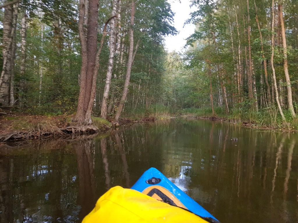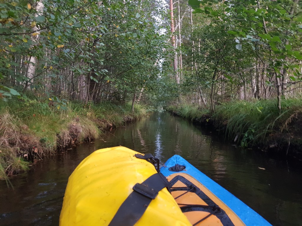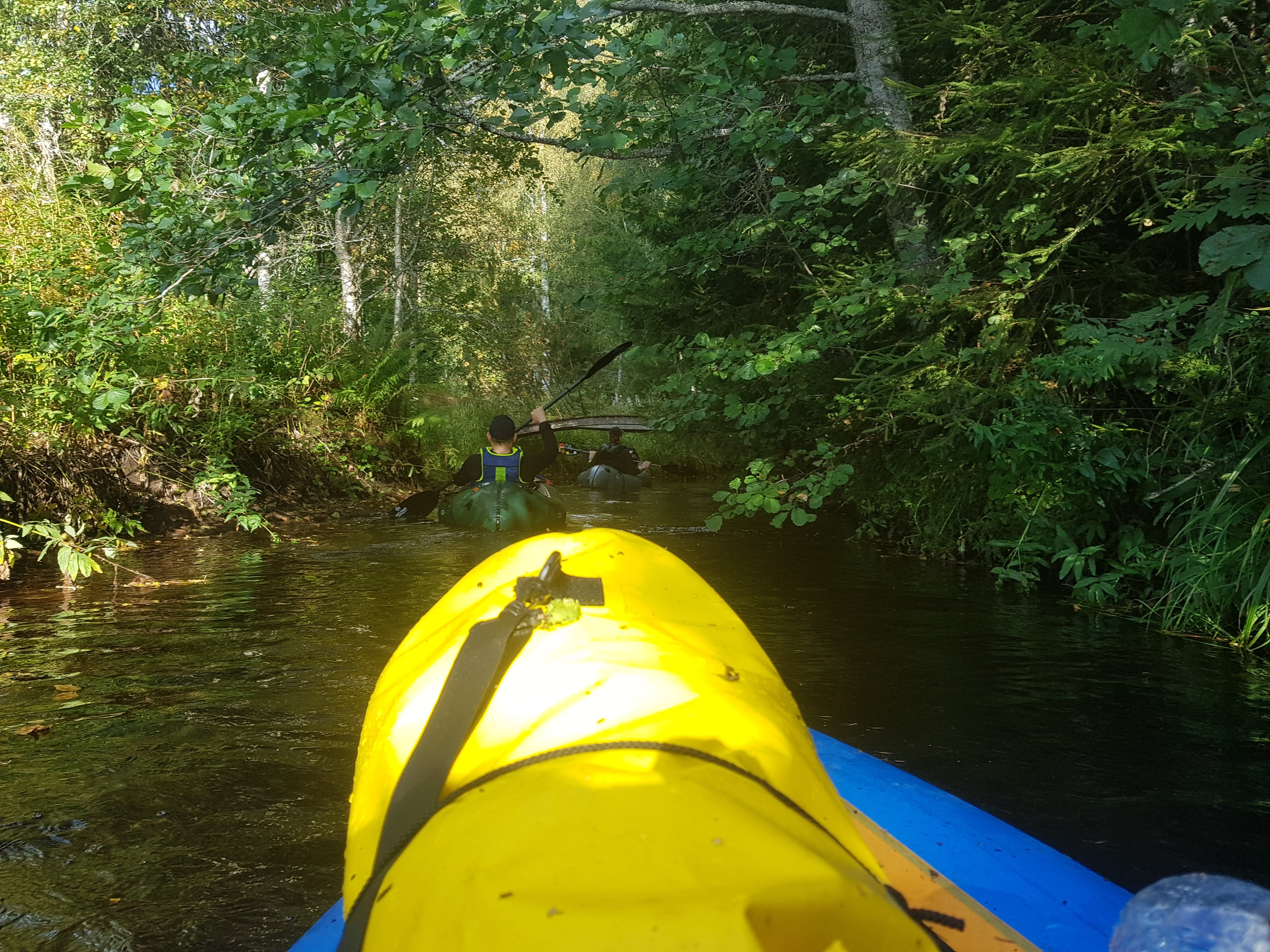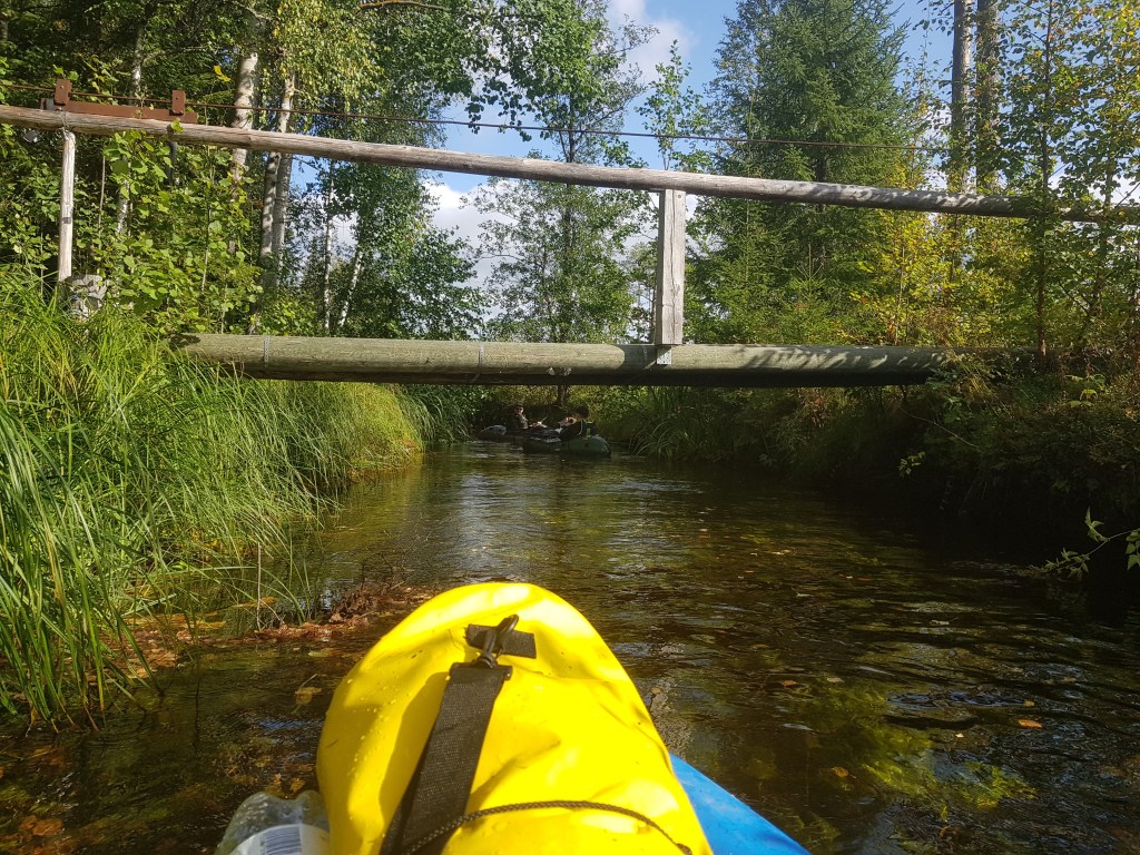 Ensimmäinen pätkä Sähkönokalta Kaartlammen nuotiopaikalle on kyltin mukaan vain 3,2 kilometrin mittainen, joten tälle etapille uskaltaa lähteä jos on hollilla edes tunti-pari valoisaa aikaa. Varsinaisella jokiosuudella matalan veden aikaan tuli vastaan ainoastaan 1-2 nopeaa pohjatössäystä isompaan kiveen, ja sitten Kaartlammelle saapuessa melkoinen viidakko ja matala haisuli metaanisuo kaislikon jälkeen. Joktap nopsa ja miellyttävä pieni (joskus jopa tosi kapoisa) ura kohti notskipysähdystä.