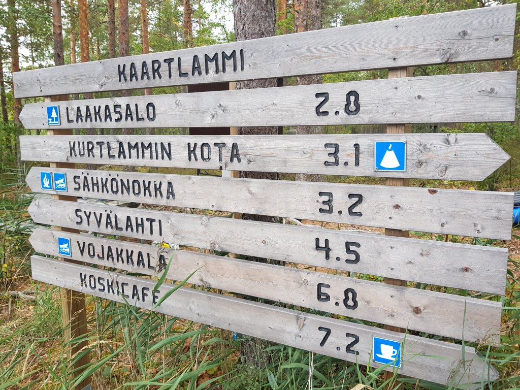 Etäisyyksiä Kaartlammin nuotiopaikalta eli 3,2 kilsan päästä Sähkönokan startista
