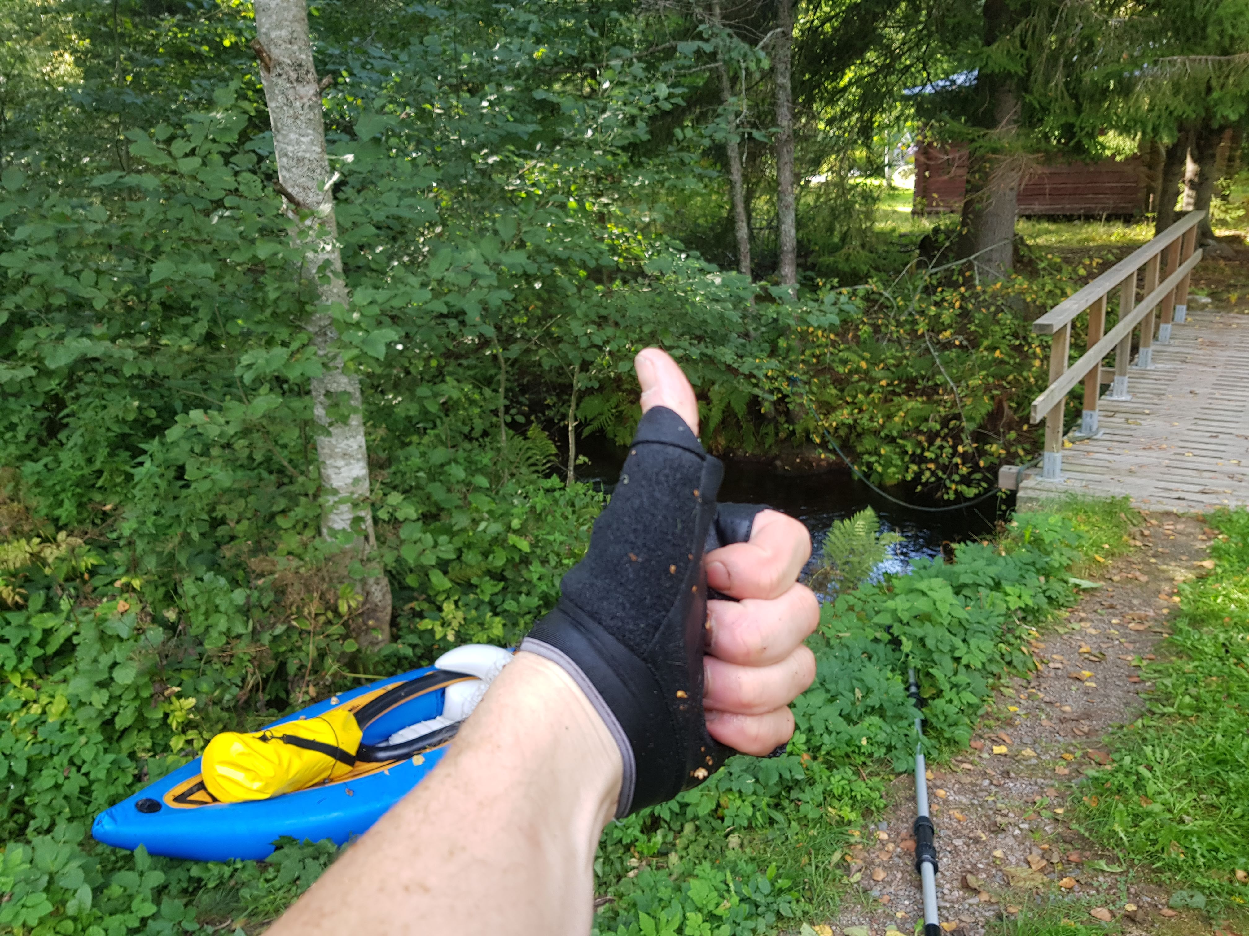 Loppumatkalla pyöritään myös aika paljon erilaisten mökkien tms. rakennusten pihapiirien äärellä. Alkupuolen erämaafiilis on viimeisellä neljänneksellä-viidenneksellä suhteellisen kaukana, ja hanuri jumahtelee matalan pohjan kiviin huomattavan tiheästi. Täysissä ilmoissa olevat veneet kampesivat esteradoista ohi vähän sujuvammin, ja toinen R sai kuvattua noin 400 tuntia goprotakin. Tukka, naama ja liivi oli aina vinossa kun kamera kävi.