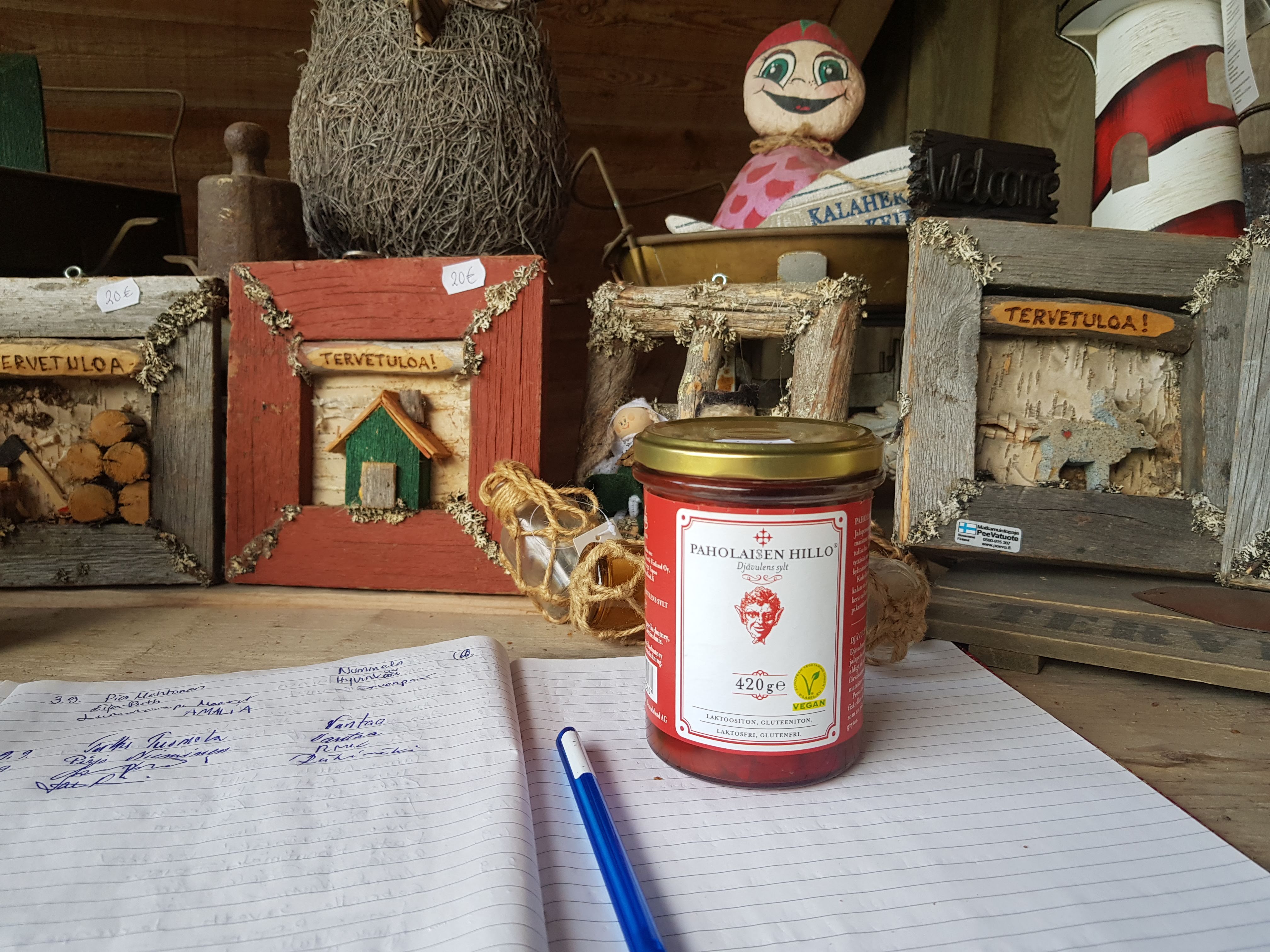 Koskicafelta saa sitten lepoa väsyneille luille ja hanurinsa autoon. Paikassa myydään kahvin&pullan lisäksi myös tuoretta kalaa sekä isoina paloina että leivän päällä, ainakin se leivän päällä ollut oli erinomaista 👍 Paholaisenhillo sen sijaan paljastui mummon tuotoksen sijaan Nestlen hornantuutista olevaksi, mutta on sen etiketti silti eri hieno.