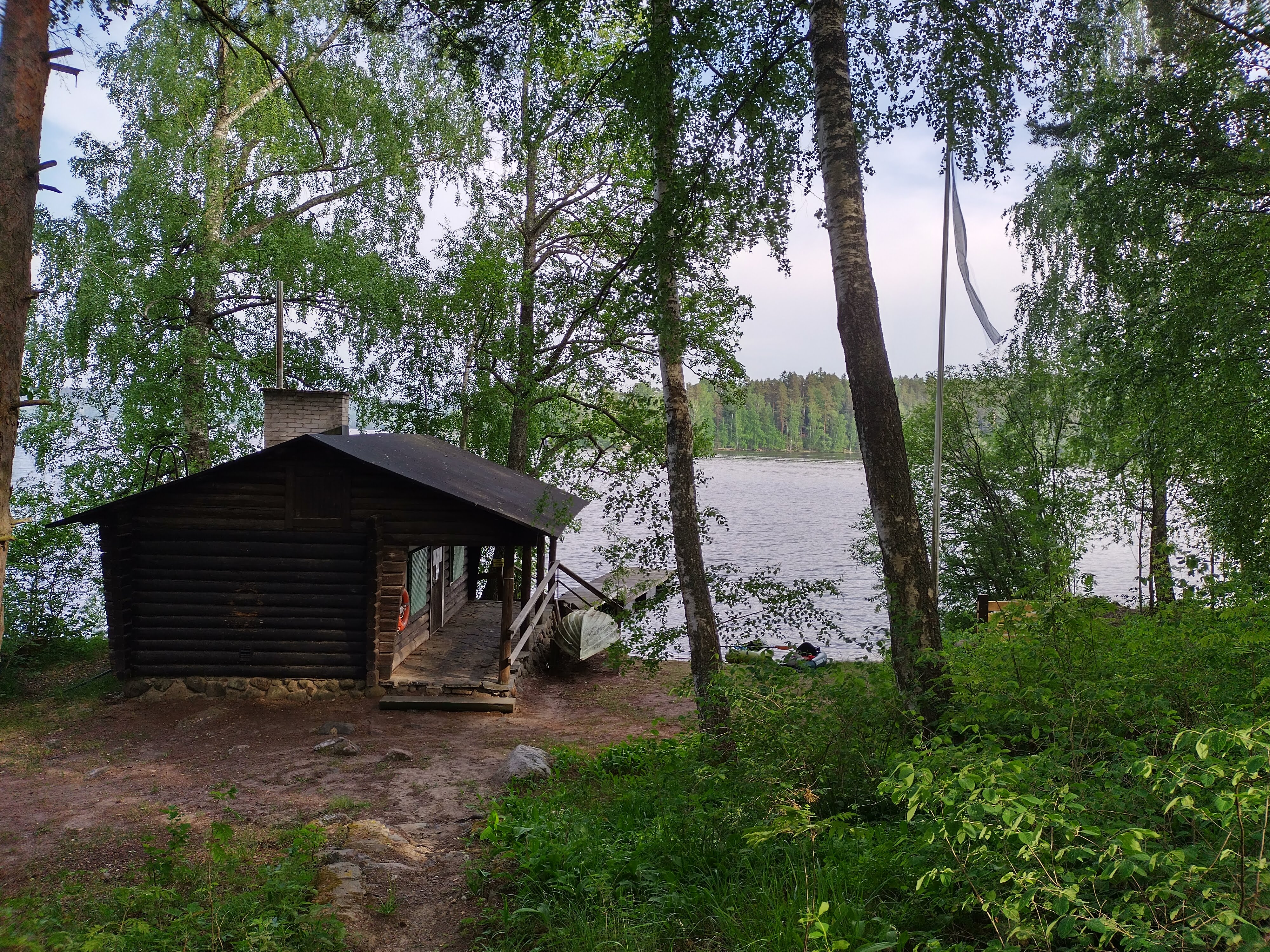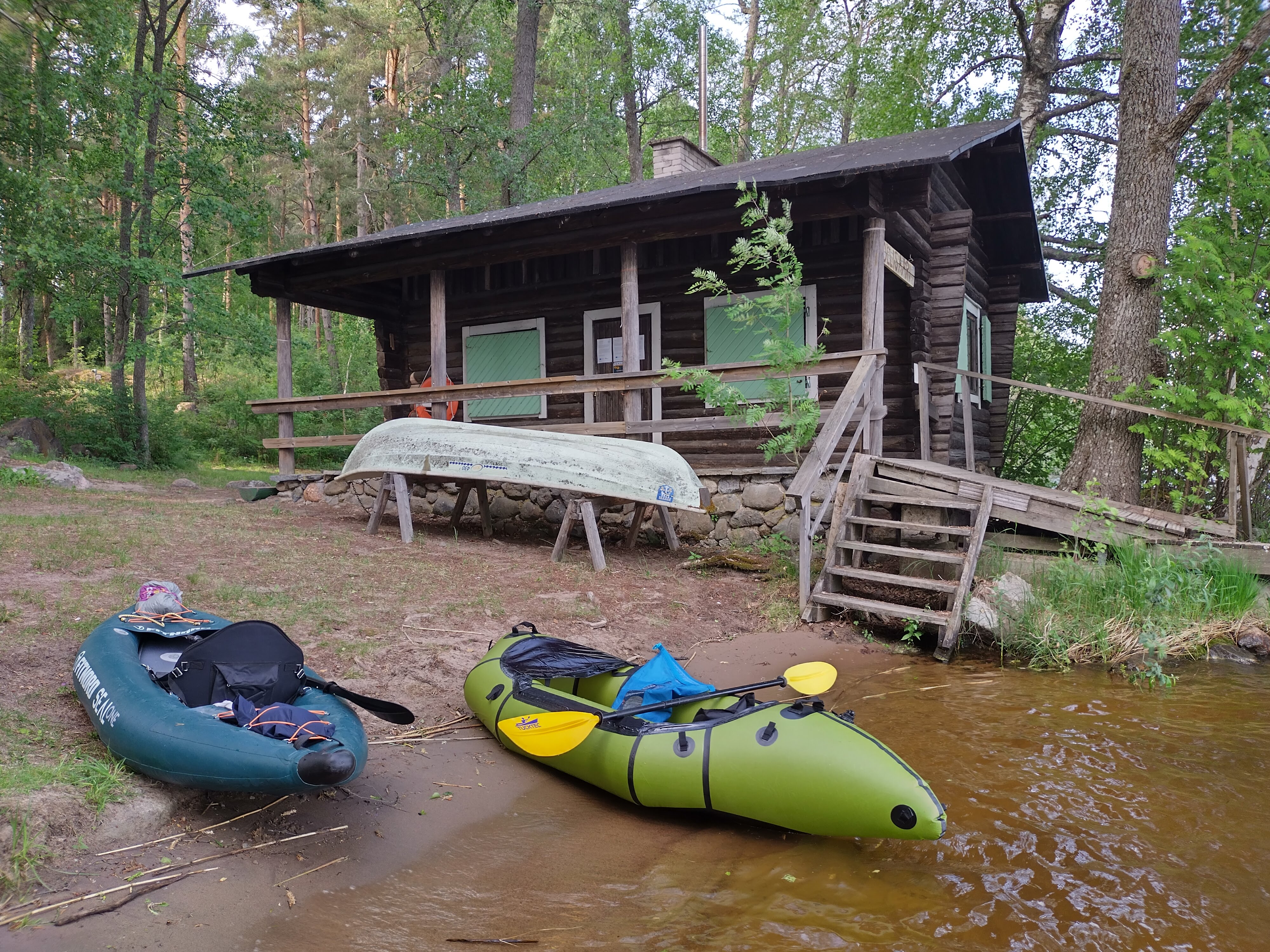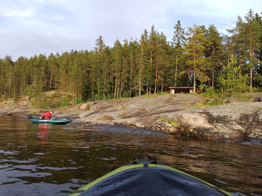 Ensimmäinen etappi hyvinkin pian Paloniemen uimarannalta lähdettyä. Jätimme isommat romppeet tähän ja lähdimme jatkamaan kierrosta kevennetyillä veneillä: koska romppeet olivat täällä, palasimme tänne myös yöksi. Kunhan aiempien kävijöiden (monet ja kuvottavat, up yours customer) roinat oli siivottu, paikka oli aika mainio. Yöllä saatiin vieläpä viihteeksi komeat salamanpaukkeet ja pitkään kaivattua sadetta. On: laituri, puita. Ei ole: huussia (tai ei ainakaan nähty).