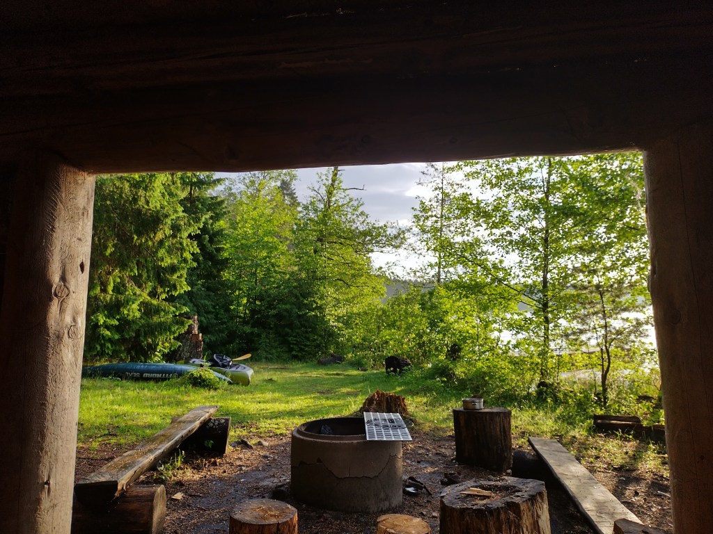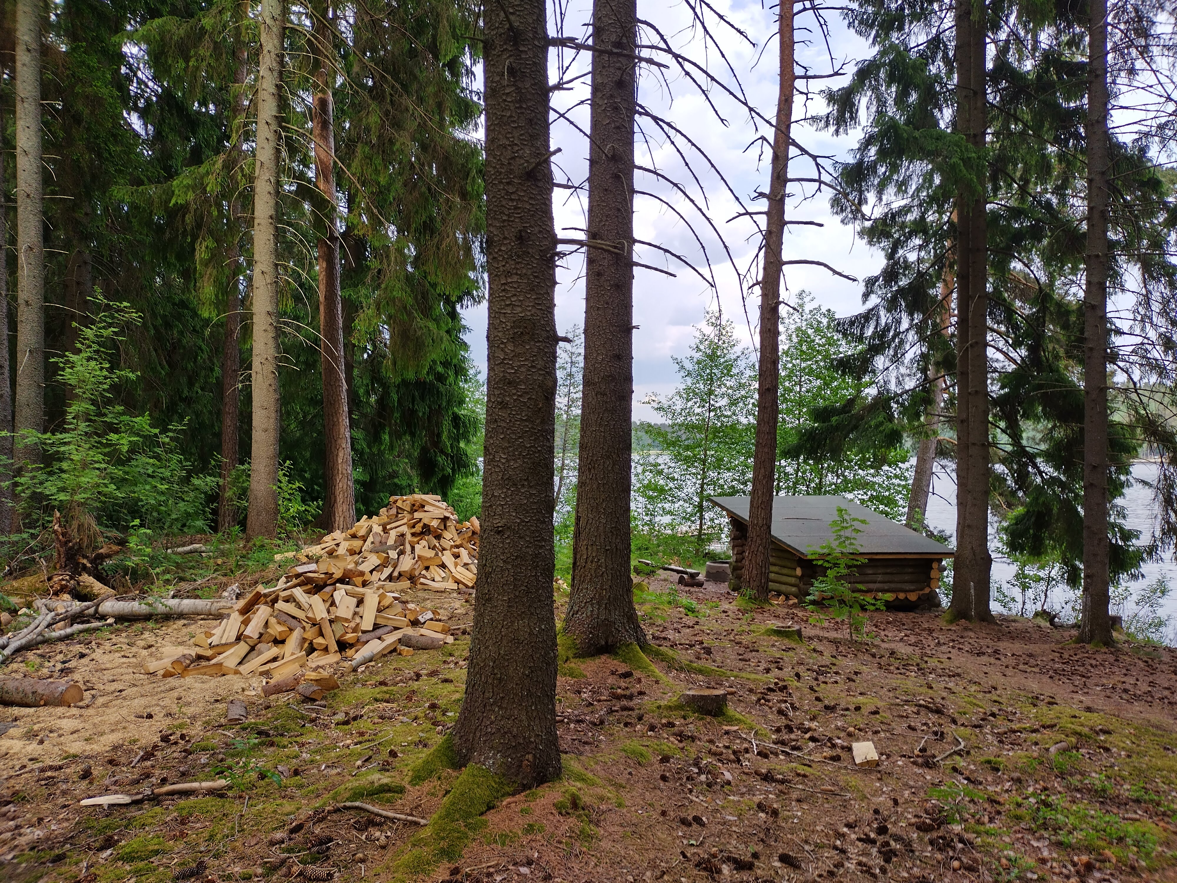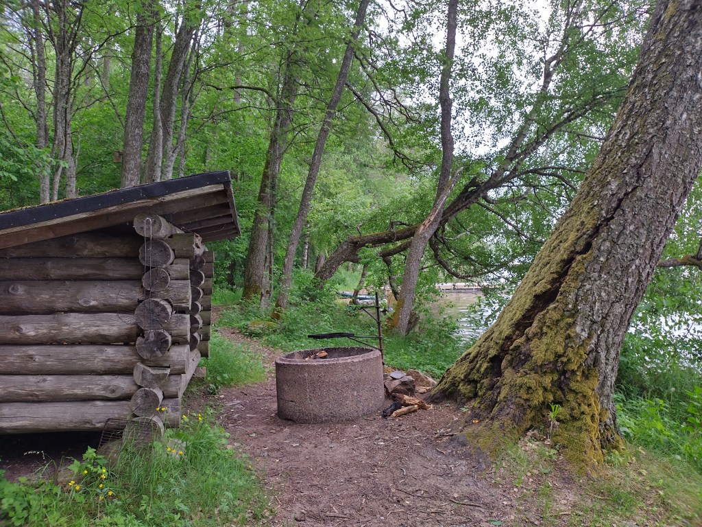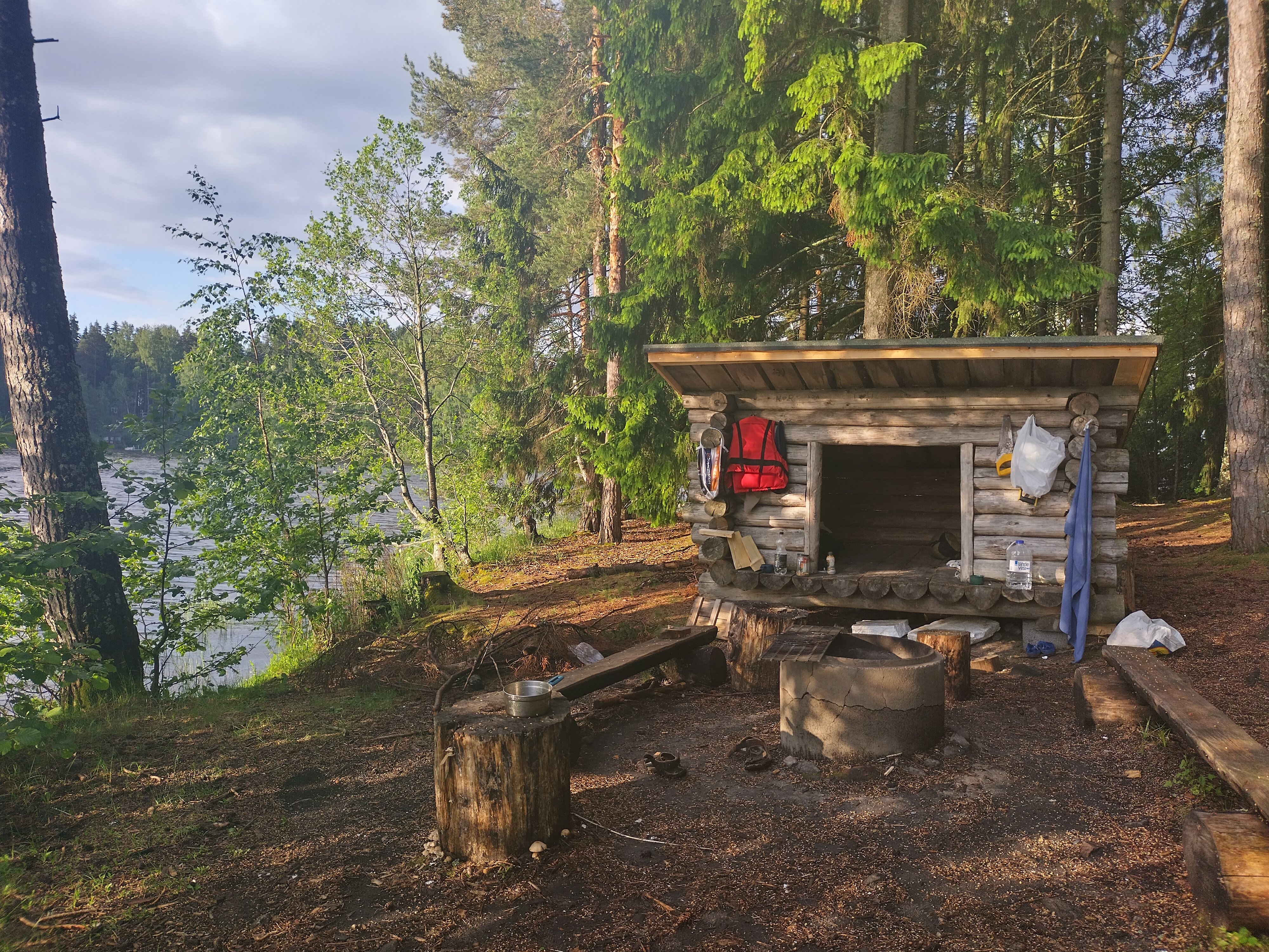 Ensimmäinen etappi hyvinkin pian Paloniemen uimarannalta lähdettyä. Jätimme isommat romppeet tähän ja lähdimme jatkamaan kierrosta kevennetyillä veneillä: koska romppeet olivat täällä, palasimme tänne myös yöksi. Kunhan aiempien kävijöiden (monet ja kuvottavat, up yours customer) roinat oli siivottu, paikka oli aika mainio. Yöllä saatiin vieläpä viihteeksi komeat salamanpaukkeet ja pitkään kaivattua sadetta. On: laituri, puita. Ei ole: huussia (tai ei ainakaan nähty).