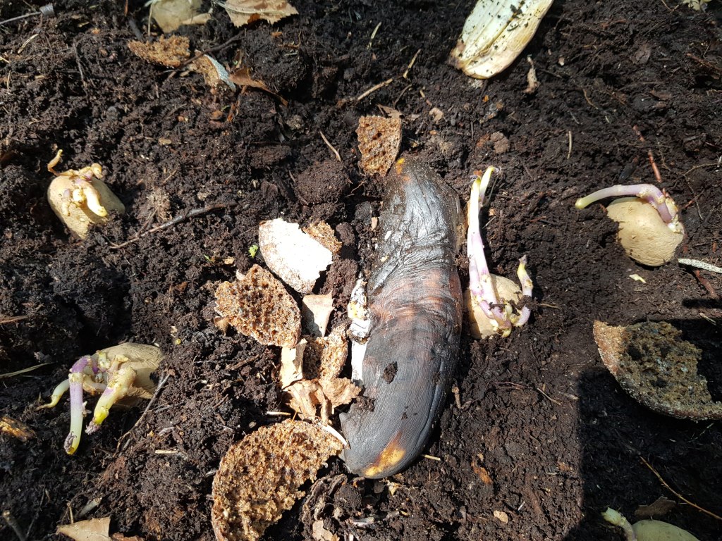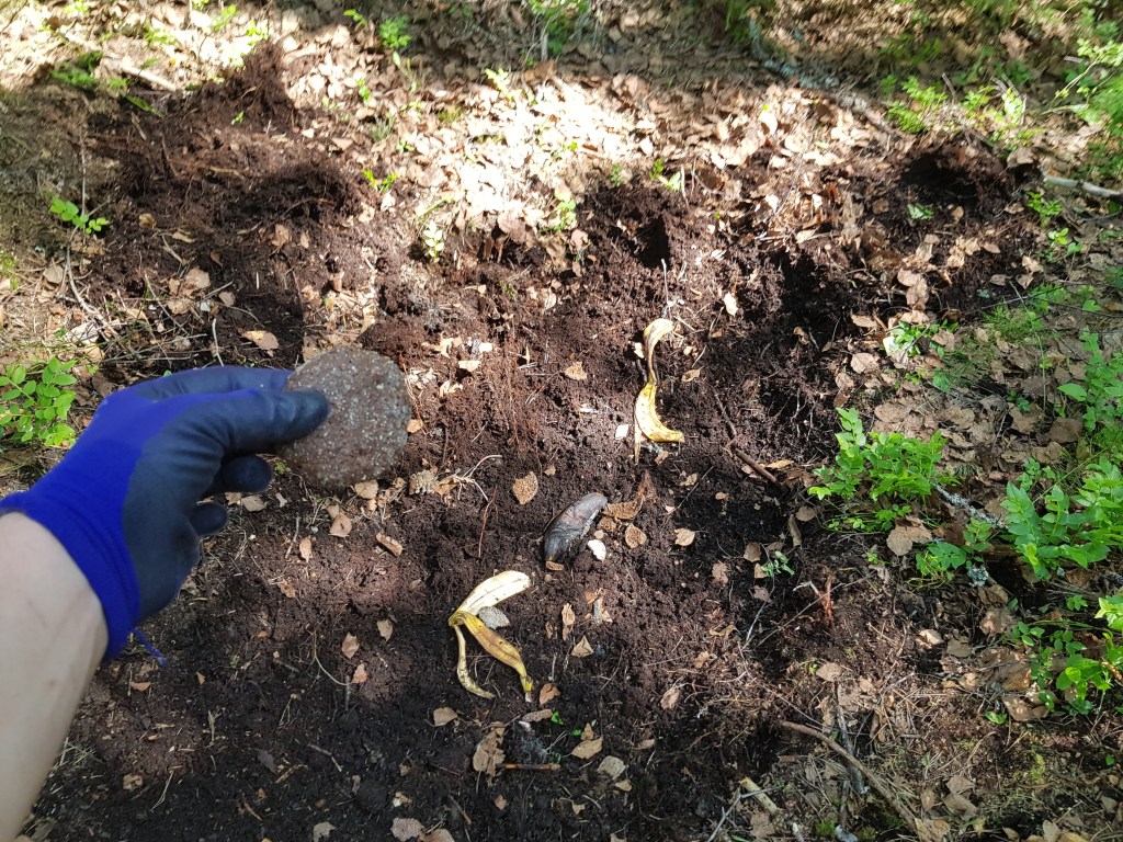 Seuraavana vuonna ajattelin peruuttaa takaisin minimalismin kuvottavilta portailta, ja tuuttasin perunat monttuun miten sattuu. Lannoitteina käytin mm. banaaneja (aina hyvä) sekä mineraalivettä puutalkoiden johdosta. Villikorttina ravinteiden joukossa oli kuitenkin saaristolaisnapit, eli ruisleipäfrisbeet. Peruna edelleen Timoa. Tämä oli hyvä!