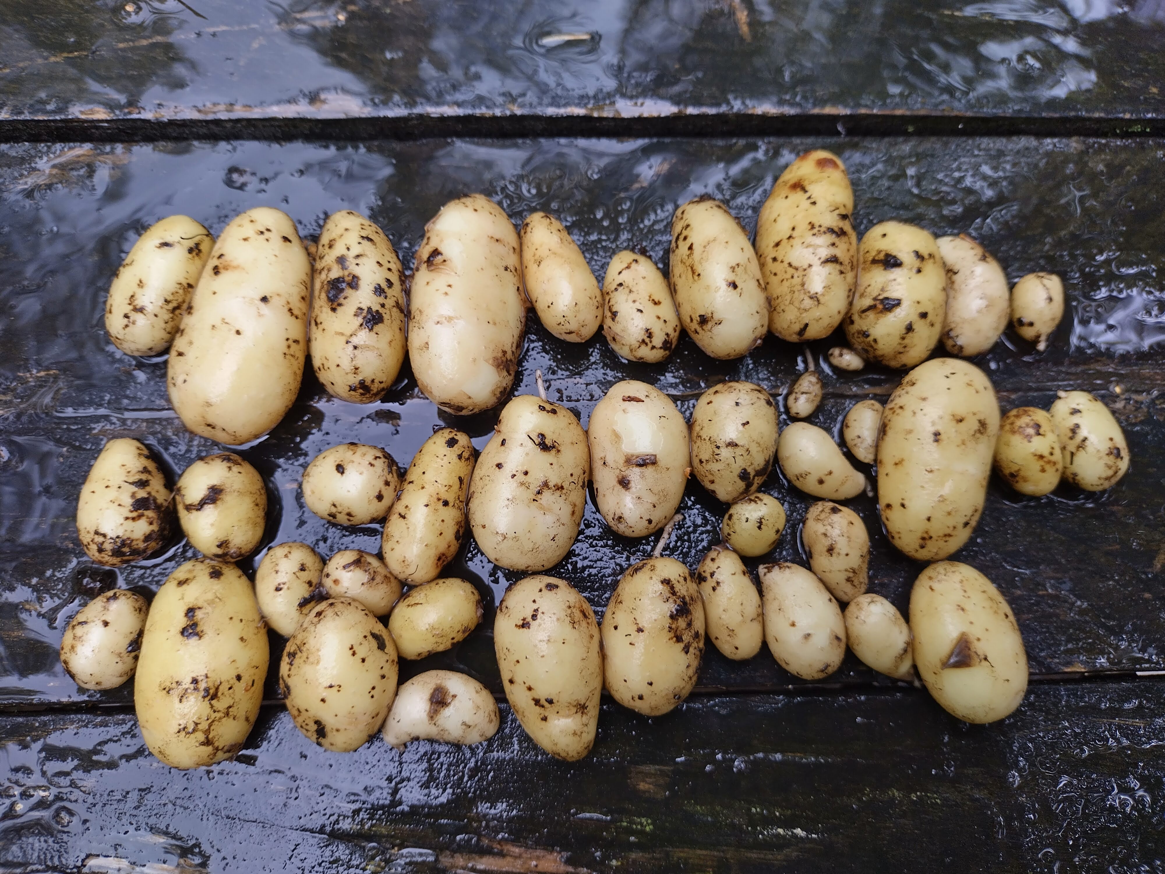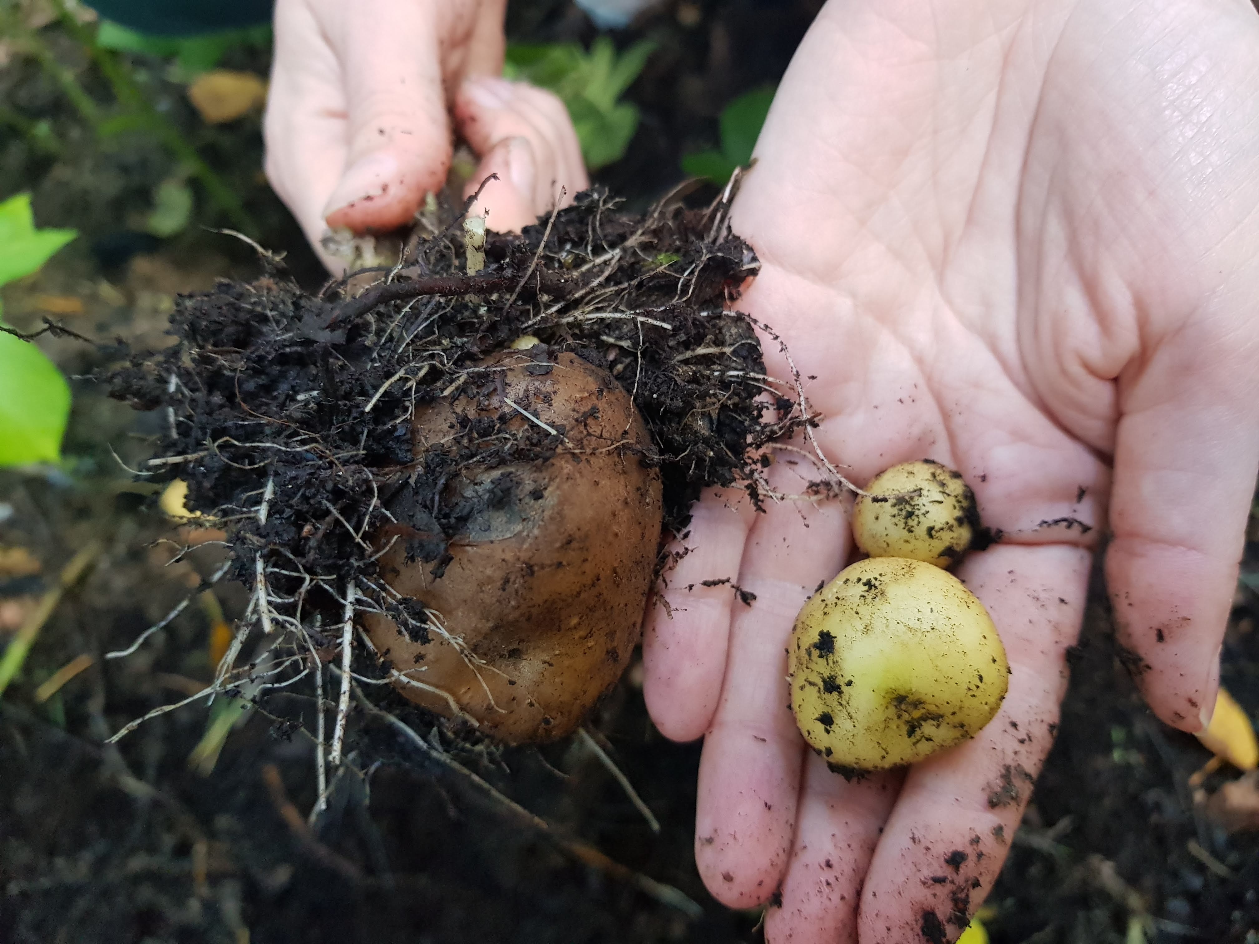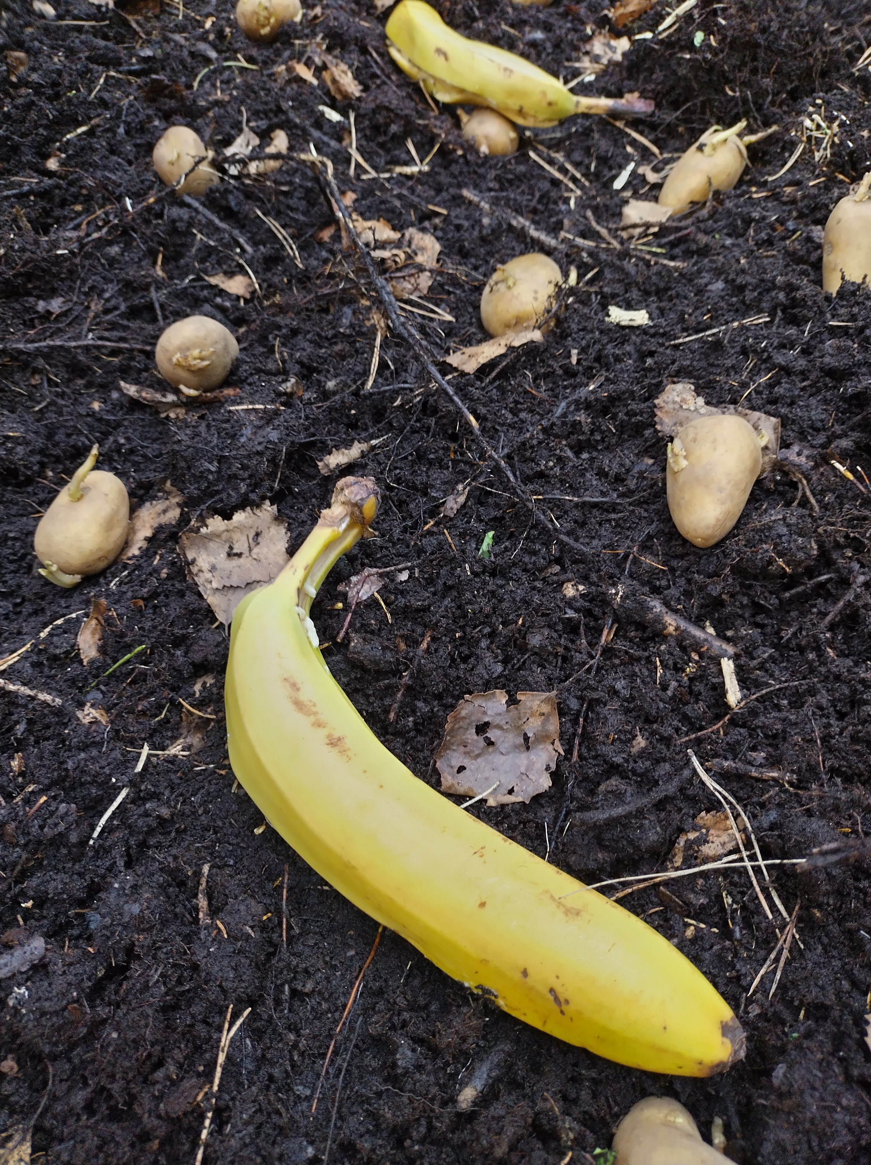 Paluu tulevaisuuteen! Neljäs sato samasta läntistä vaikutti onnen venyttämiseltä, mutta tällä kertaa käytössä oli ammattilaisvehkeet (ja jälleen banaanit). Kuten kaikissa aiemmissakin potatoinneissa, siemenperunat (aina Timoa) menivät maahan toukokuussa ja nousivat elokussa.