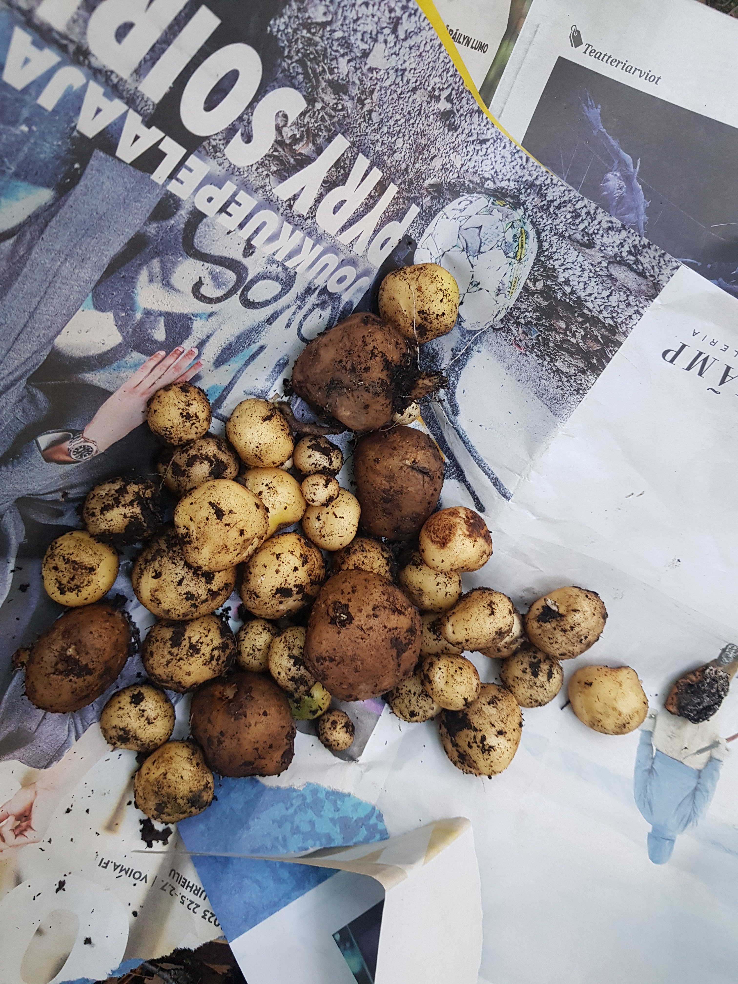 Eksoottis-suomalainen lannoitus toimi kuin häkä. Perunoita tuli taas kunnian päivien henkinen lippalakillinen (tms,), ja M sekä pikku-M:kin saivat syödäkseen. Teoria alkoi vahvistua: lannoita. Tänä vuonna taisi tulla isoimmat perunat, joten kiitos Lidlin vissylle.