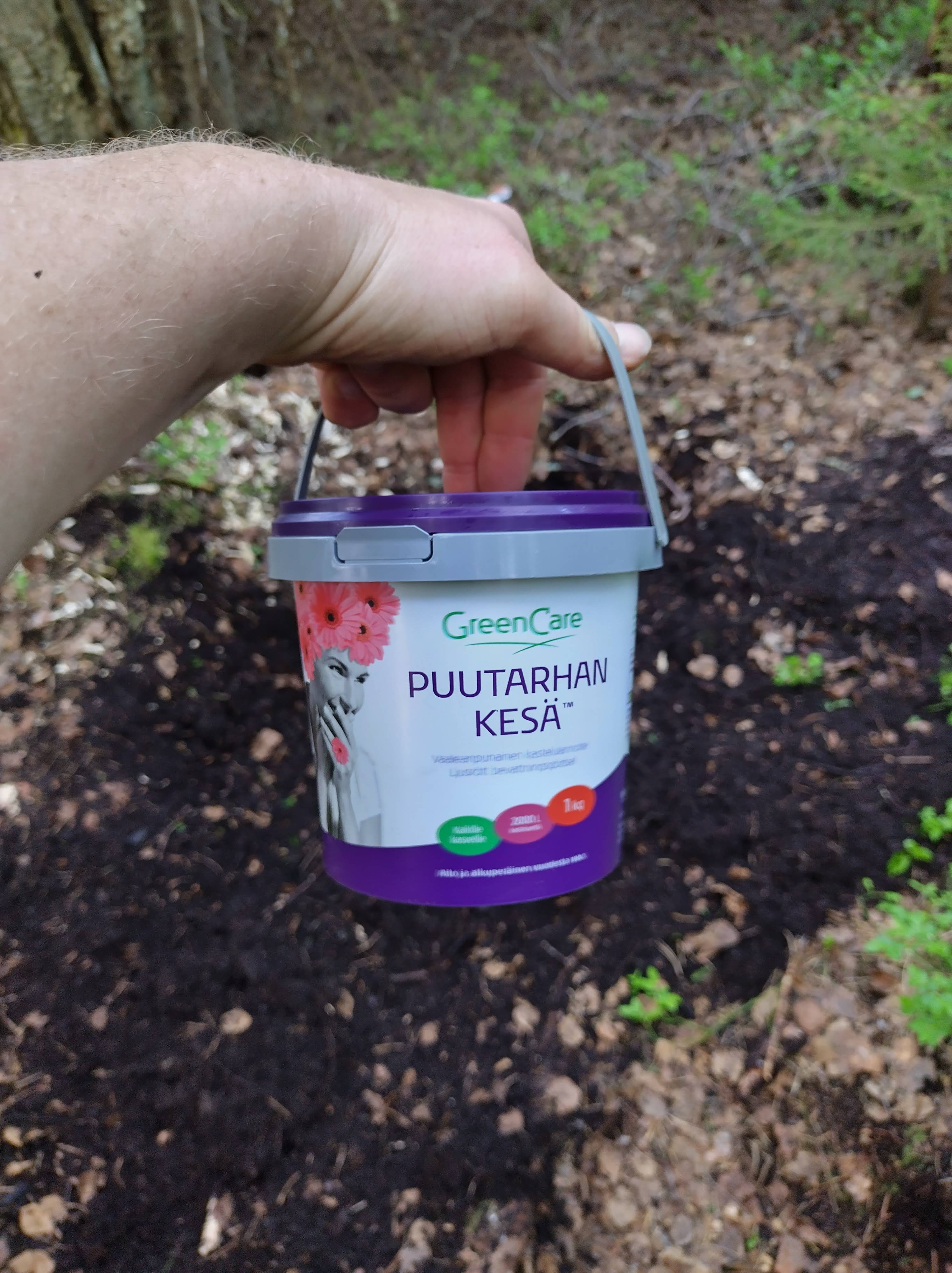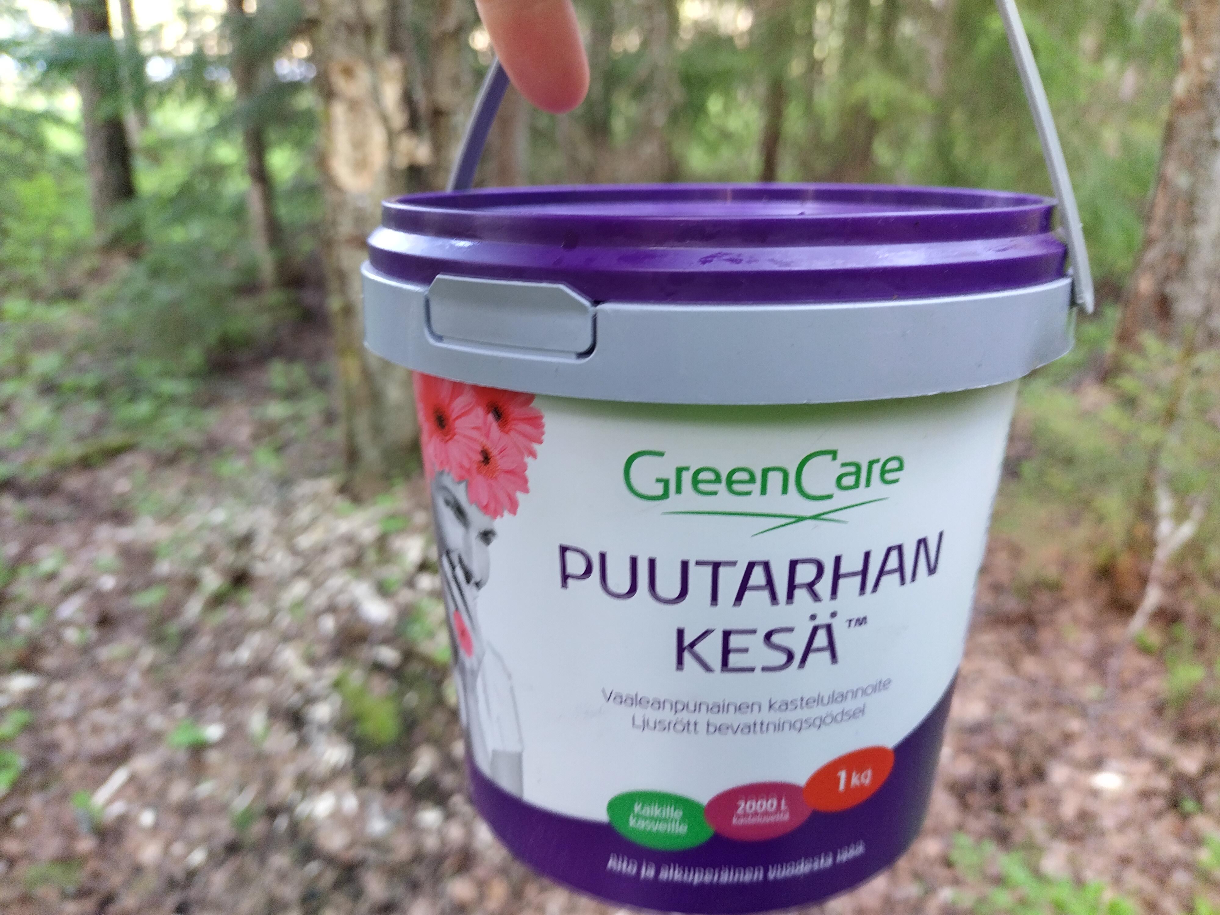 Erikoisvoimana tämän vuoden sadossa oli GreenCaren Puutarhan kesä: kylläpäs kannatti lähteä varusteurheilemaan. Laitoin soosia noin pari kertaa ohjetta enemmän reikäiseen muovipussiin ja aloin roiskutella. Oi että tulikin hedelmällistä. Lannoitetta kului noin 1-2 ruokalusikallista, ja sitten piti keksiä joku sijoituspaikka lopulle 975 grammalle (äiti).
