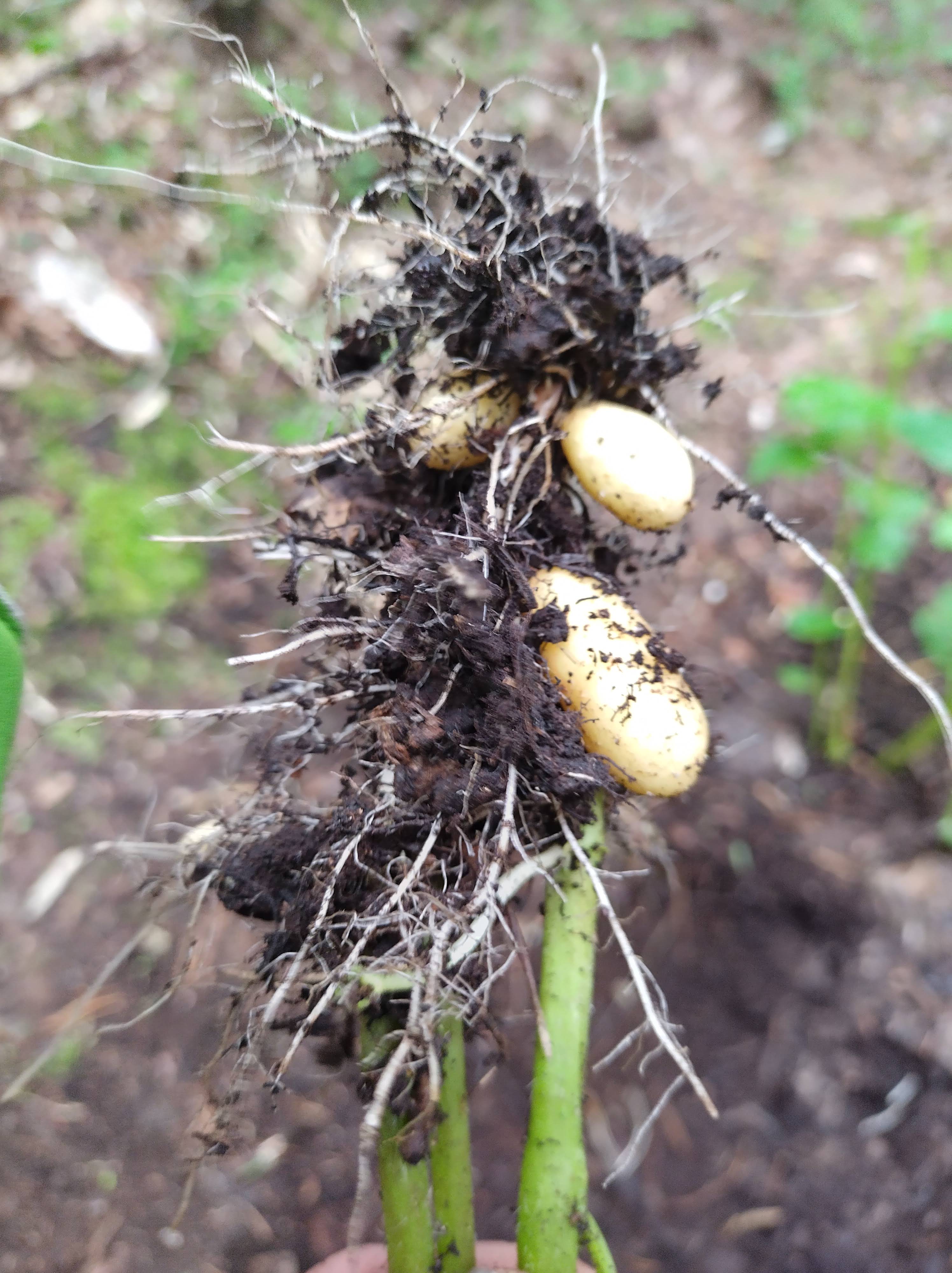 Vuonna 2021 testasin perunoiden kasvattamista metsässä Ylen sivuilta löytyneen jutun usuttamana. Sehän toimi! Koska yksi kerta saattoi olla tuuria, piiskasin oudon liikkumatonta hevosta samalla maaläntillä myös kolmena seuraavana vuonna. Tulokset vaihtelivat mutta pelto pysyi.
