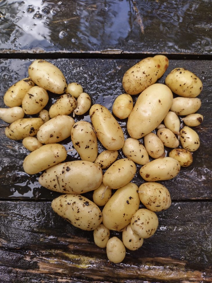 Ajattelin syyttää tästä katovuodesta Villeä, jolta sain vajaan säkillisen siemenperunoita. Ehkä niiden päälle oli pissattu, ehkä ei. Joka tapauksessa lopputulos oli muutama neulanpääpökäle.