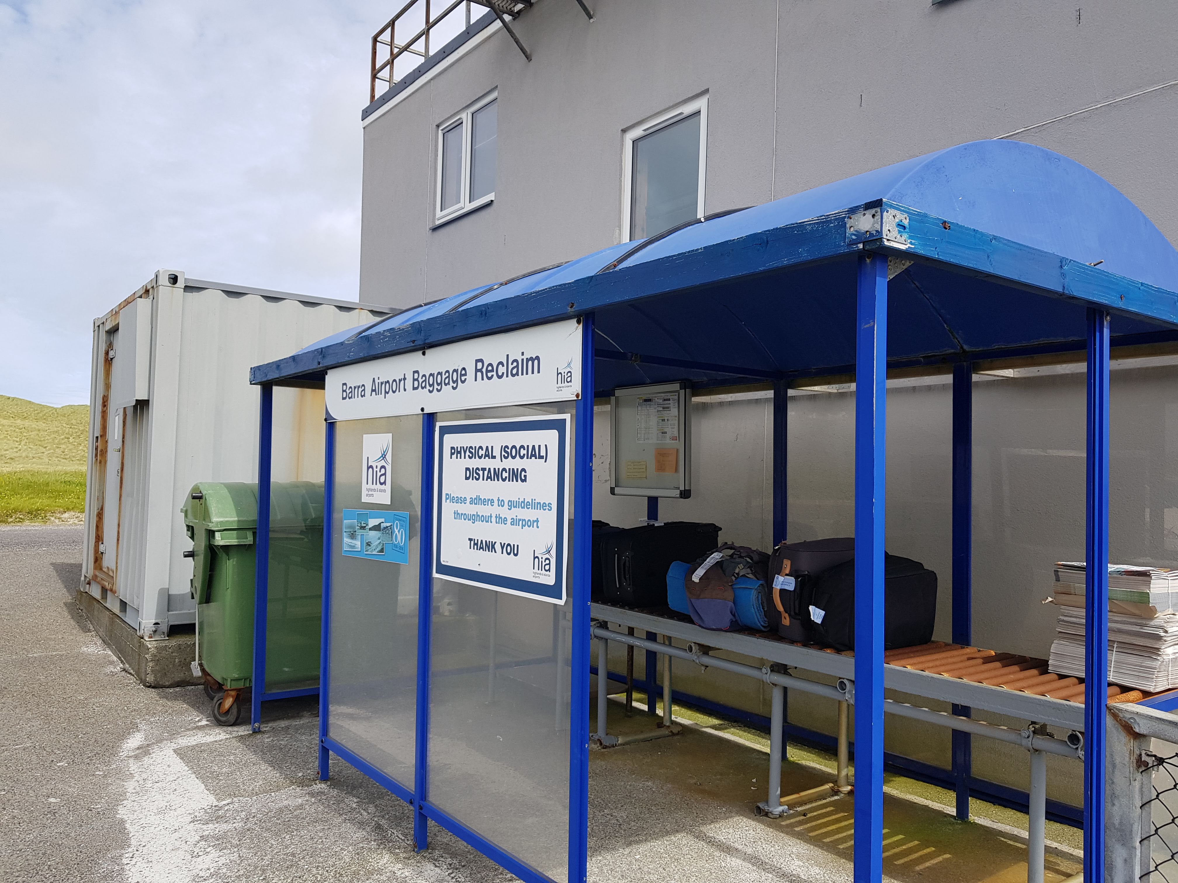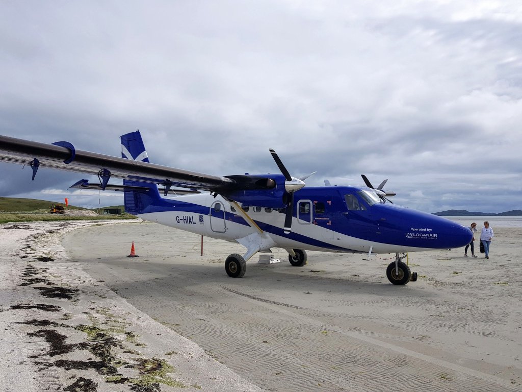 Menoksi! Loganairin portti on aikas pieni ja jossain todella syvällä Glasgow’n lentokentän uumenissa, mutta löytyy kuitenkin. Kone herättää tavallaan luottamusta, koska kipparit näkee koko ajan edessään: välissä ei ole ovia tai verhoja, vaan kaikki ollaan samassa veneessä. Lentävä vene laskeutuu plusmiinus tunnin jälkeen onnellisesti Barran ”kentälle”, eli ilmeisesti maailman ainoalle vakituisesti liikennöidylle vuorovesikiitoradalle. Sitten mennään kohti lentokenttämuodollisuuksia, eli ottamaan ruumarinkka bussikatoksesta ja poistumaan terminaalialueelta lompsimalla nurkan taakse.
