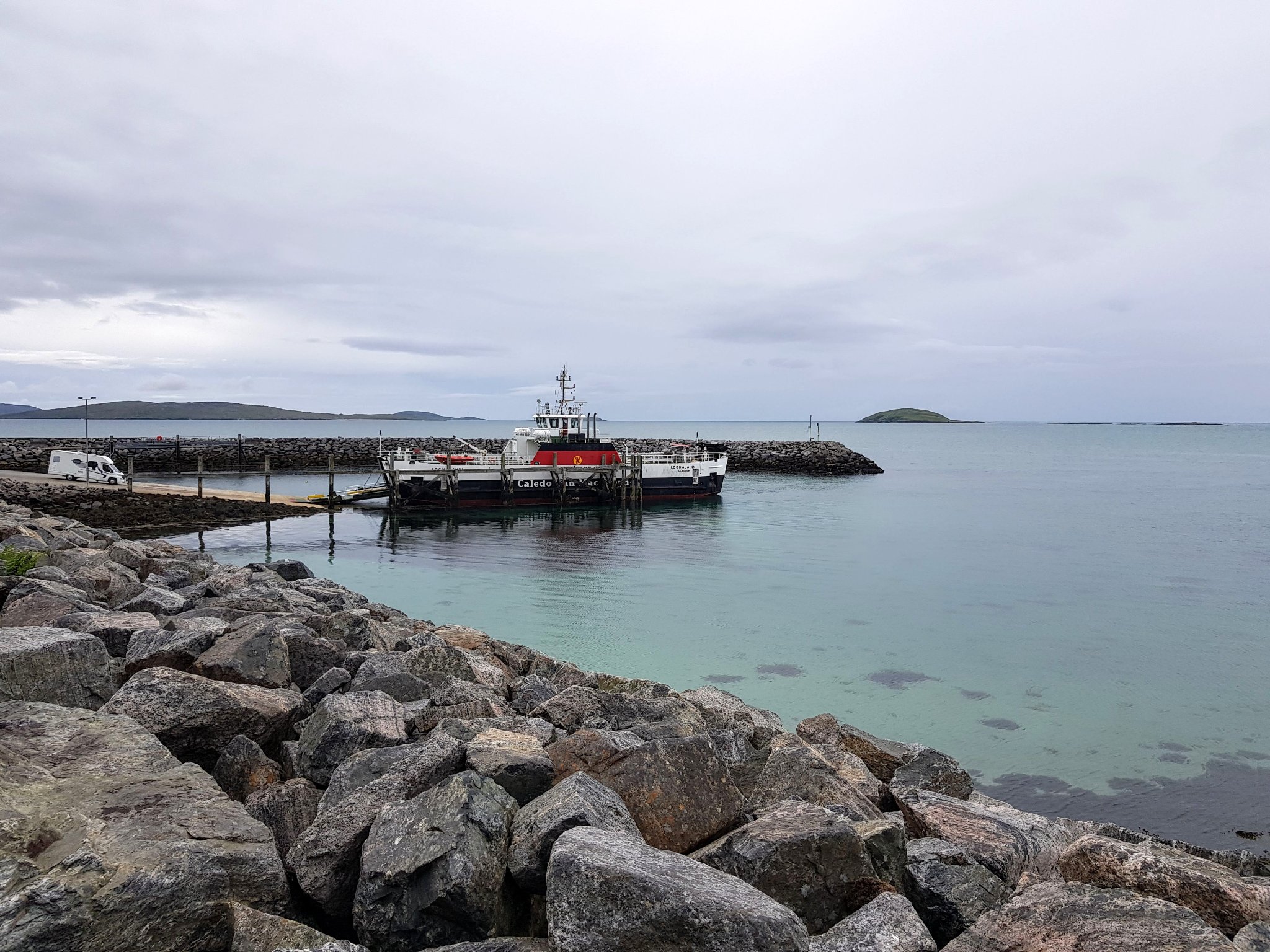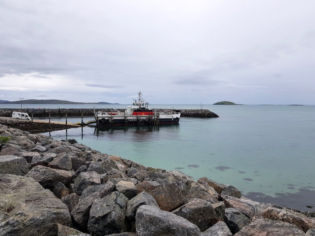 Kamppailen hetken valintojen kanssa. Jos reitin haluaisi kävellä kokonaan, Barran kentältä pitäisi etsiytyä kovin monta kilometriä etelään saaren vastakkaiseen päätyyn Vatersayhyn. Kävelin ensin saaren pohjoiskärkeen lauttasatamaan miettimään asiaa, ja siellä miettiessäni totean, että bussi etelään on jonkinlainen taruolento, kun taas lautta seuraavalle saarelle eli Eriskayhyn lähtee jopa ihan just parin tunnin päästä ja asemalta saa kakkuakin. Päätän voittaa reissuaikataulussa päivän verran ja huijata heti alussa. Tästä aion syyttää Villeä, joka on laskeutumassa parin päivän päästä vähän pohjoisempaan reitille Benbeculaan, jossa kohtaamme, ja jonne pitäisi ehtiä. Itsehän olisin toki halunnut palavasti kävellä 20 km taaksepäin ja huomenna saman reitin takaisin mäen yli.