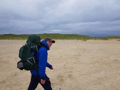Mutta millainen se sitten on kävellä? Melkoisen hämmentävä. Noin puolet ajasta rymytään hyvinkin syrjäisillä nummilla ja soilla, mutta sitten taas palataan asfalttitielle. Touhusta jää jotenkin sellainen vaikutelma että siinä on parsittu yhteen lyhyempiä luontoreittejä, joiden väliset matkat talsitaan lähinnä päällystettyjä teitä pitkin. Reitti on kyllä ohjattu kulkemaan tieosuuksilla ollessaan noin 95-prosenttisesti pienemmillä (yksikaistaisilla) ja vähemmällä käytöllä olevilla vanhoilla teillä, mikä tarkoittaa näin kaukana meren hanurissa ollessa ehkä noin yhtä-kahta autoa tunnissa, jos sitäkään. Luvassa on märkiä sukkia nummiosuuksilta ja sitten rakkoja märistä jaloista asfaltilla, toisaalta taas huikeaa Karibialta näyttävää hiekkarantaa, tuulista periskottilaiselta maittavaa suo/nummea ja harvinaisen hiljaisia kyliä ja syrjäteitä (ainakin vuonna 2022 koronan jälkilöylyissä). Lauttoja ja pengerteitäkin pääsi ihmettelemään kiitettävän usein. Aika usein ellei lähes aina etappi päättyy jonkinlaiseen sivistykseen, tai vähintäänkin olkikattoiseen hostelliin keskellä ei-mitään. Vähän kuin skotlantilainen camino?