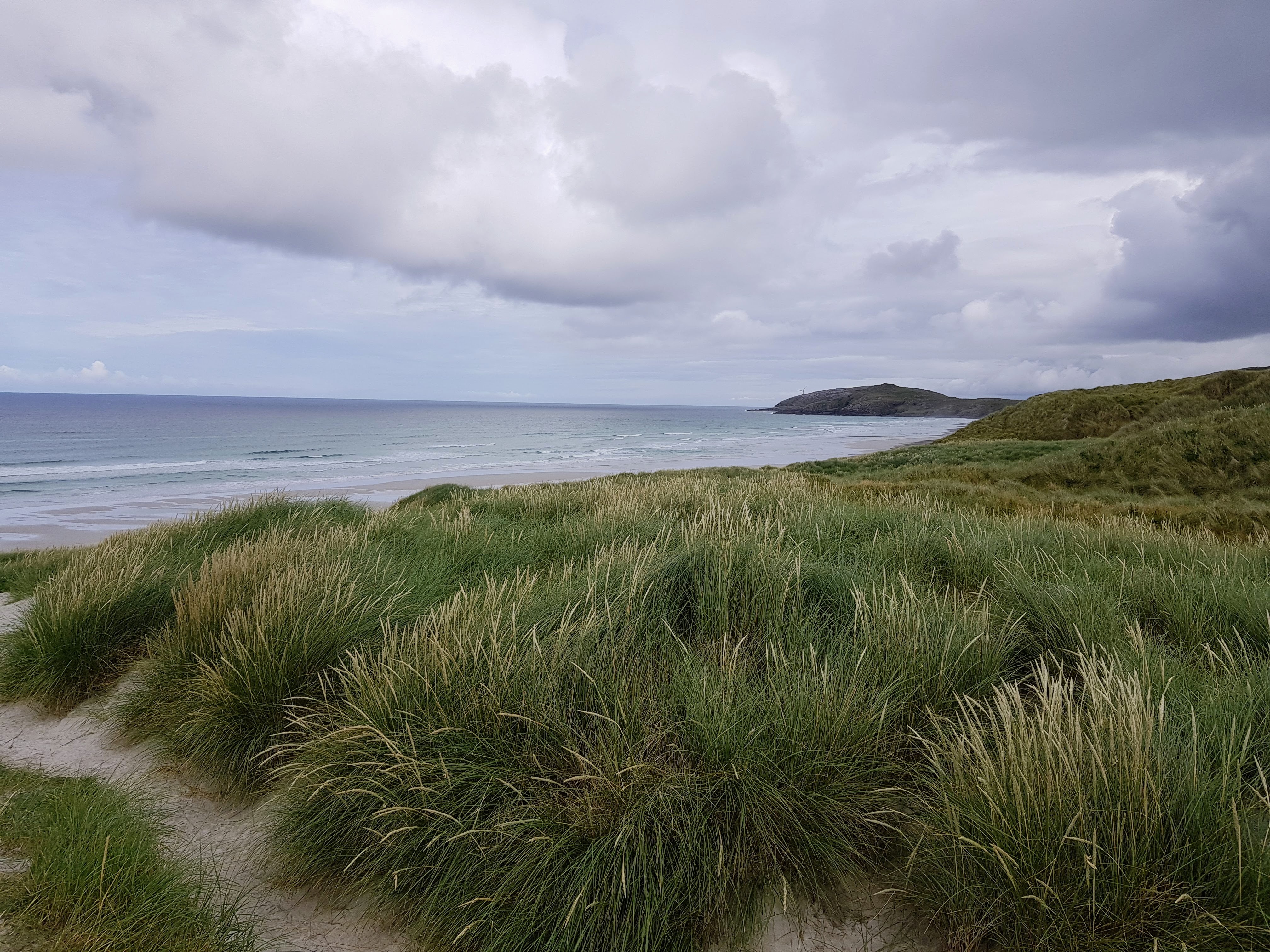 Askernishin jälkeen luvassa oli lisää heinää ja rantaa, kenties jopa koko reitin isoin satsi. Ei valittamista! Tällä osuudella kannatti loikata heinikolla kulkevalta polulta siihen rannan puolelle: hiekka oli erinomaisen tukevaa, ja karibiamainen loppumaton valkoinen baana on kovin erilaista kuin nummireissulta odottaisi, mutta silleen hyvällä tavalla.