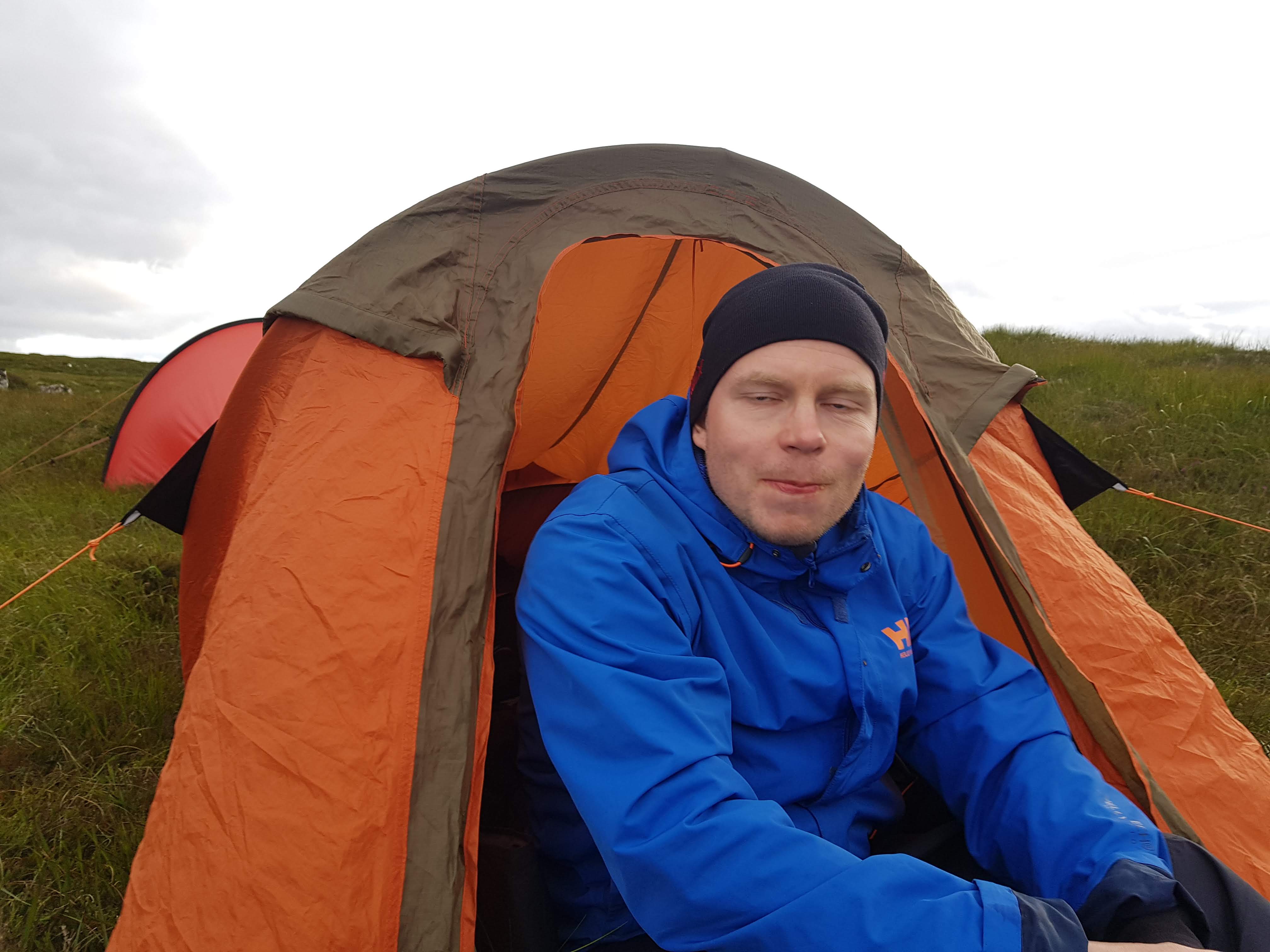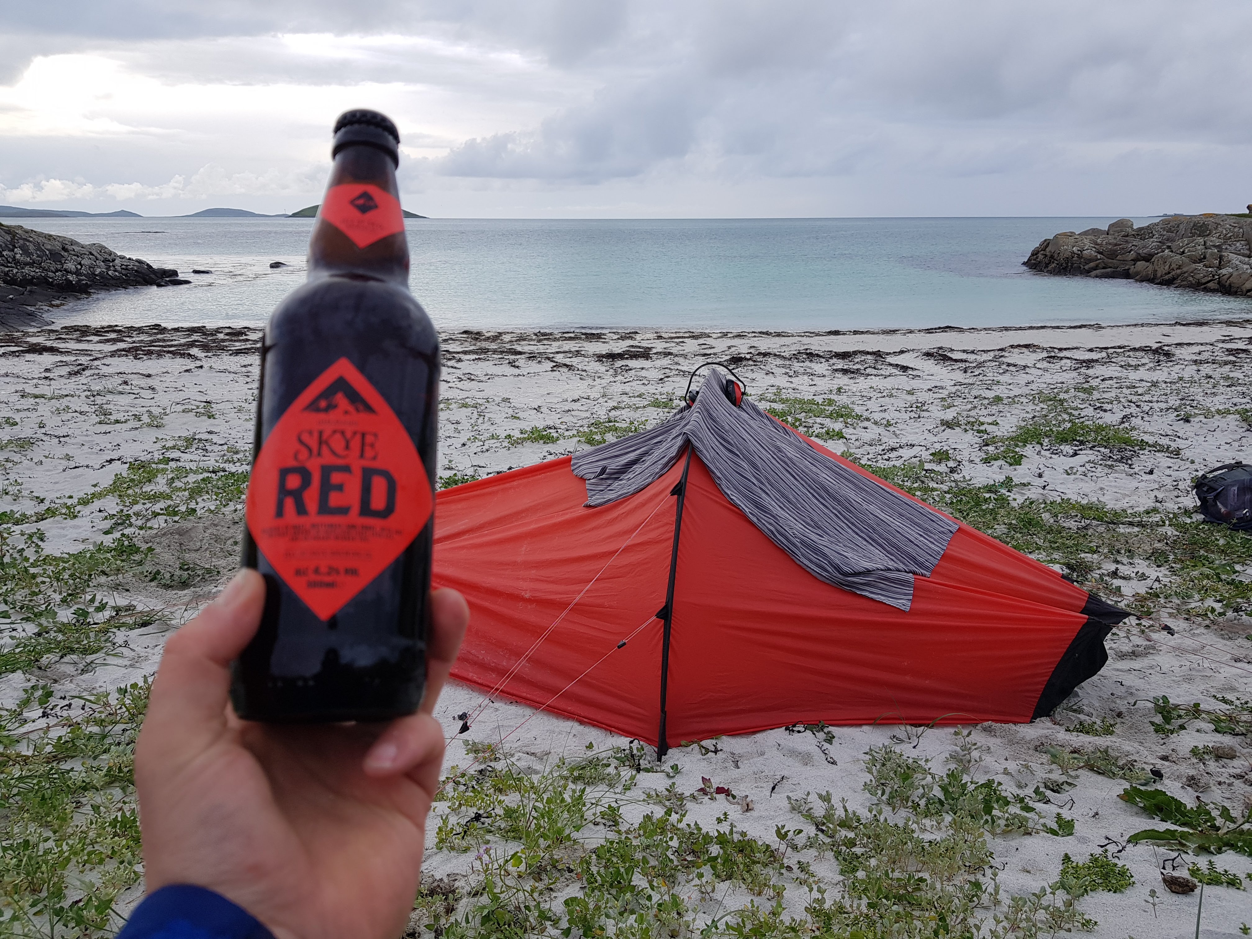 Pubissa sain kuitenkin vihiä siitäkin, että lähistöltä löytyy kyläkauppa, josta on mahdollista saada myyttistä retkikaasua, ja että se on enää vartin auki. Shoppailemaan juosten siis, ja sitten Eriskayn pohjoispäädyn pengertien hiekkarannalle telttailemaan ja nauttimaan pari kappaletta naapurisaaren herkkupirtelöä. Suht onnistunut ensimmäinen päivä vaikka huijaten edettiinkin.
